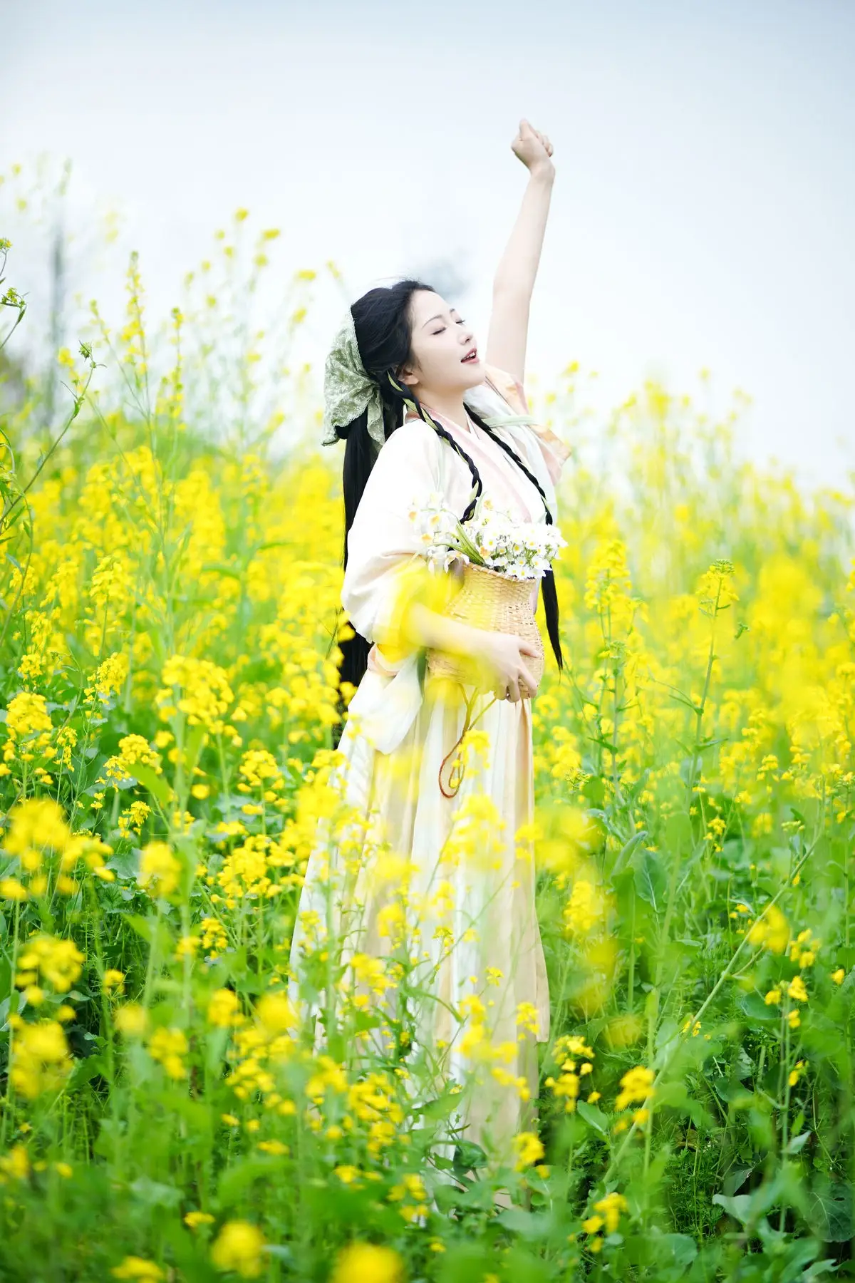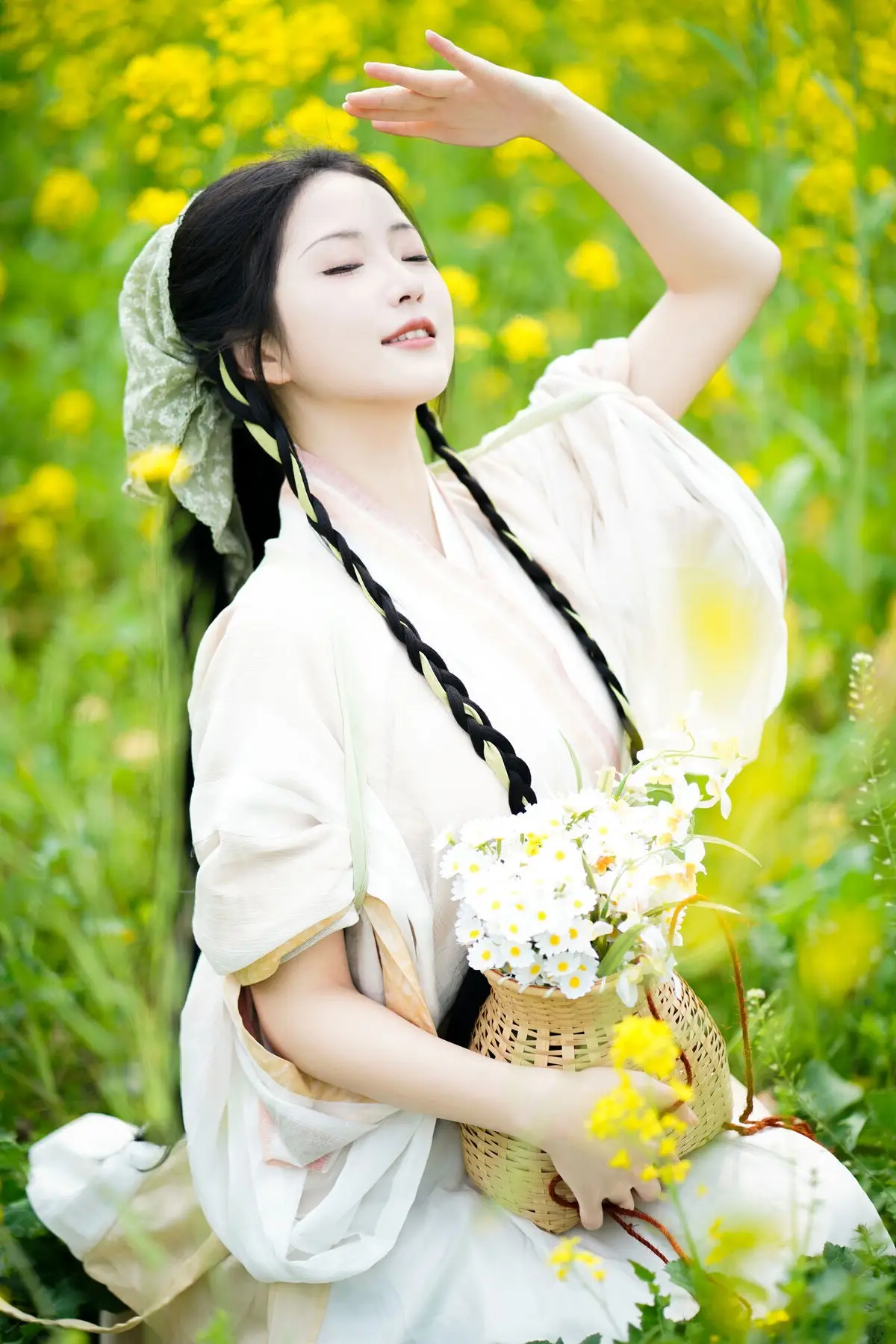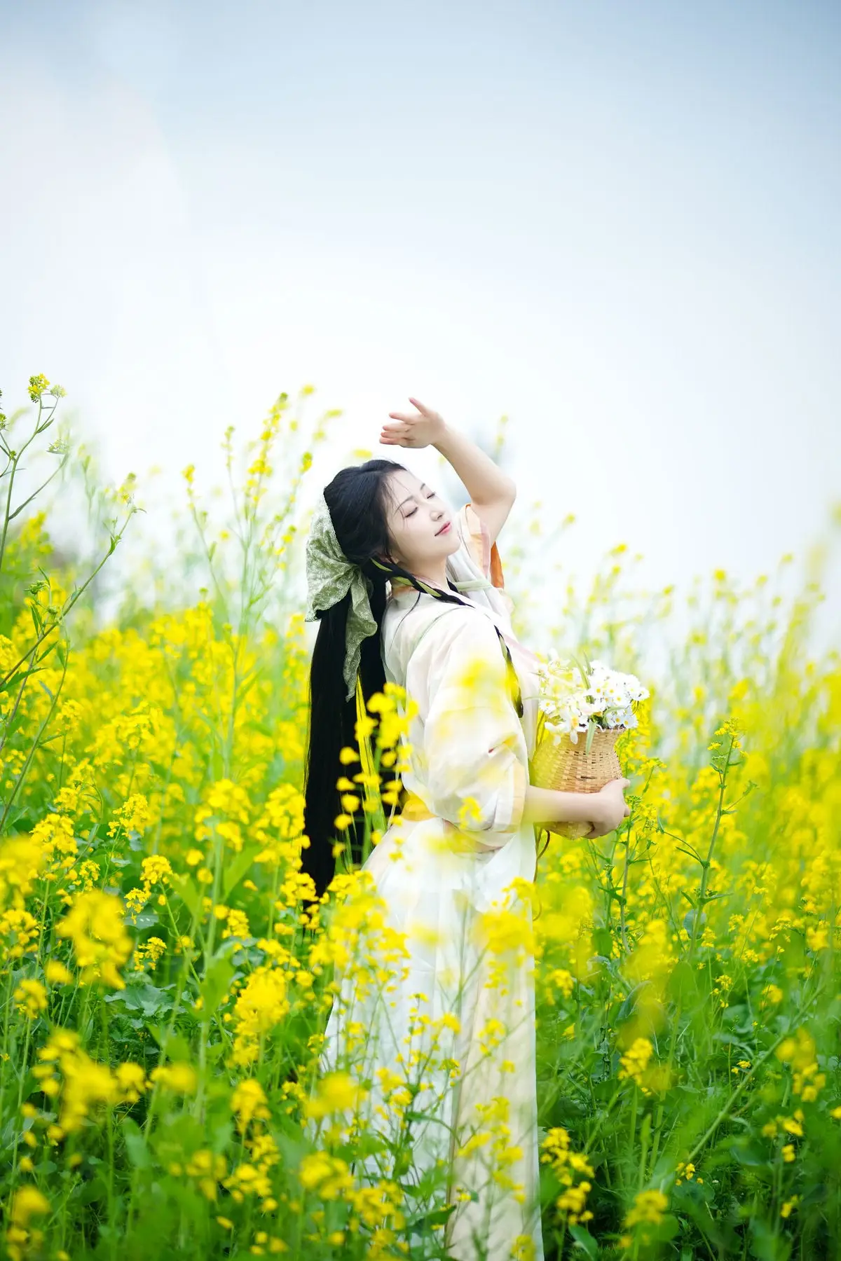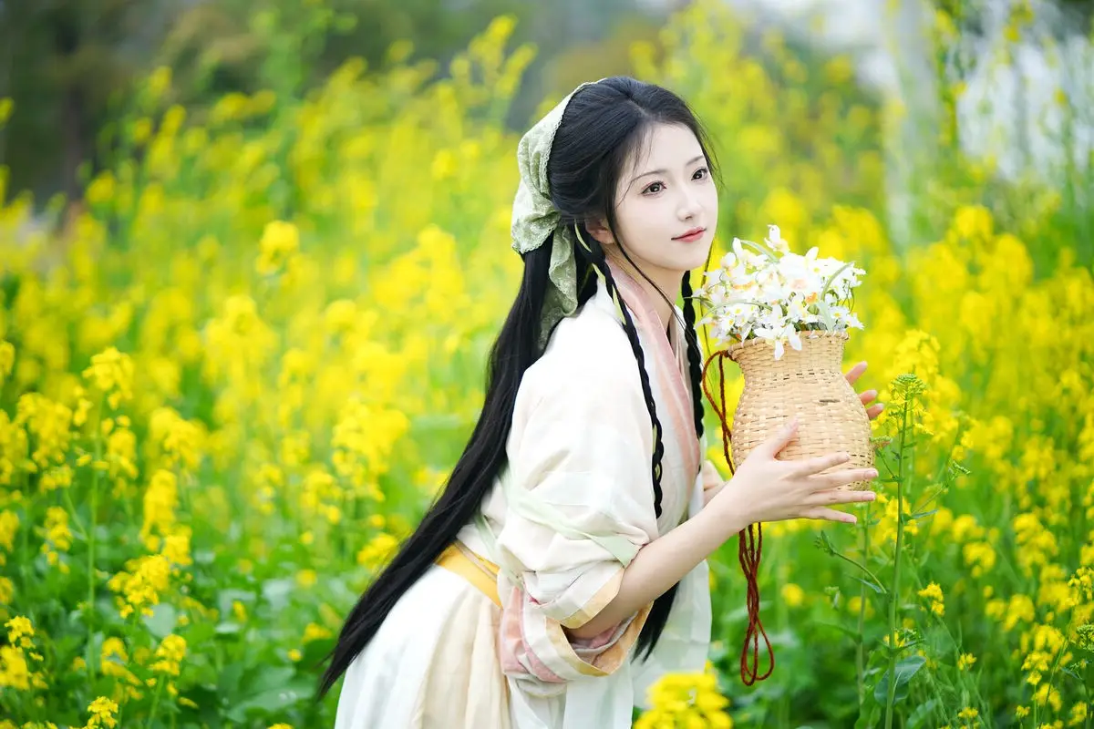 The YiTuYu Vol.8720 Tu Ya W collection transports viewers to a poetic setting where traditional beauty harmonizes with fresh nature. The image features a girl in a pristine white Hanfu gown her long dark hair elegantly braided exuding grace and gentleness. She holds a small woven basket filled with white flowers standing amidst a vibrant field of golden rapeseed flowers creating a vivid and lyrical tableau. Tu Ya W's clear eyes and gentle smile enhance her captivating charm evoking a sense of peace and nostalgia. This is a perfect blend of East Asian aesthetics and the majestic beauty of the natural world.#Hanfu #RapeseedFlowers #AsianBeauty #TuYaW #TraditionalFashion #YiTuYu