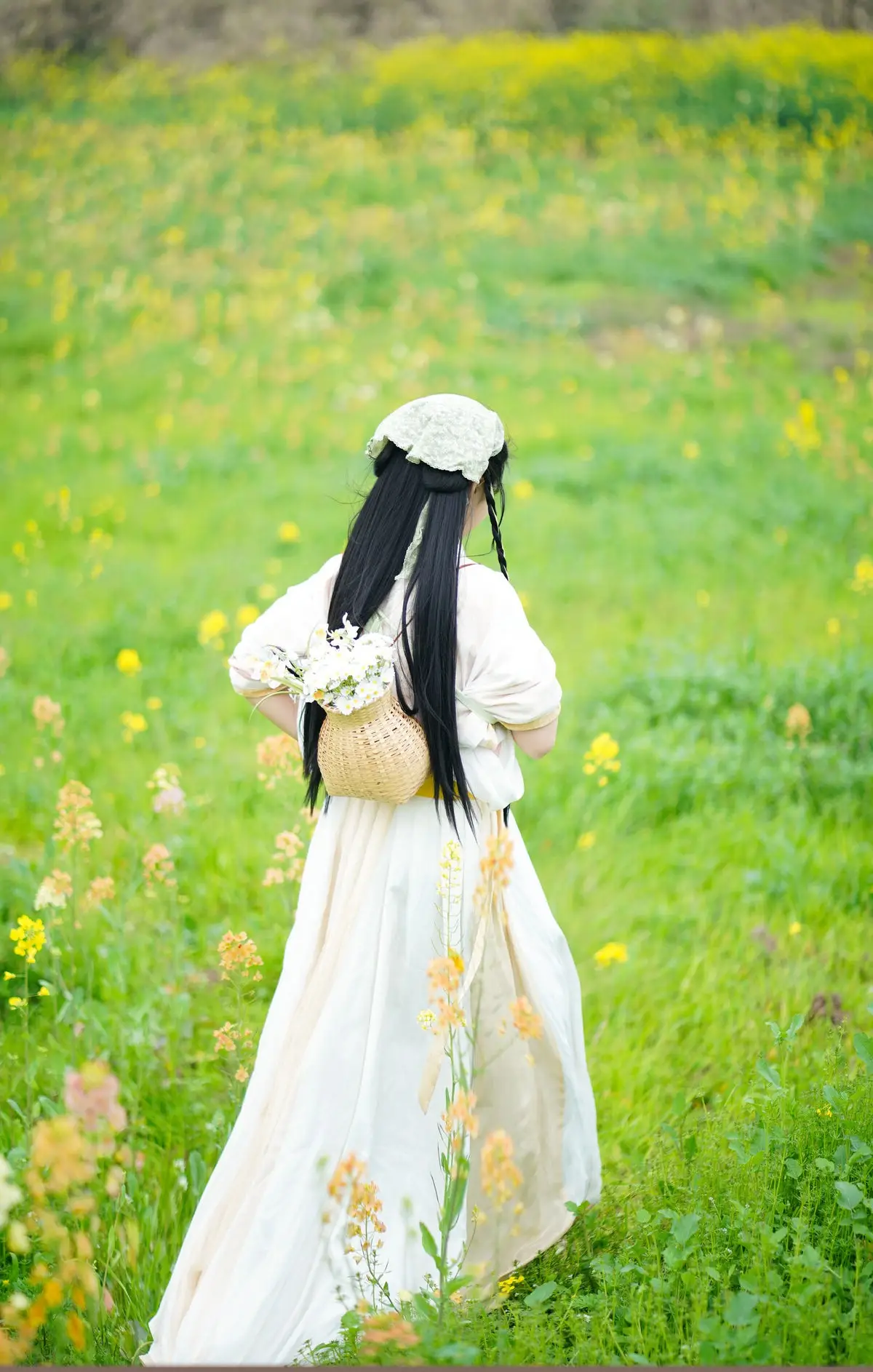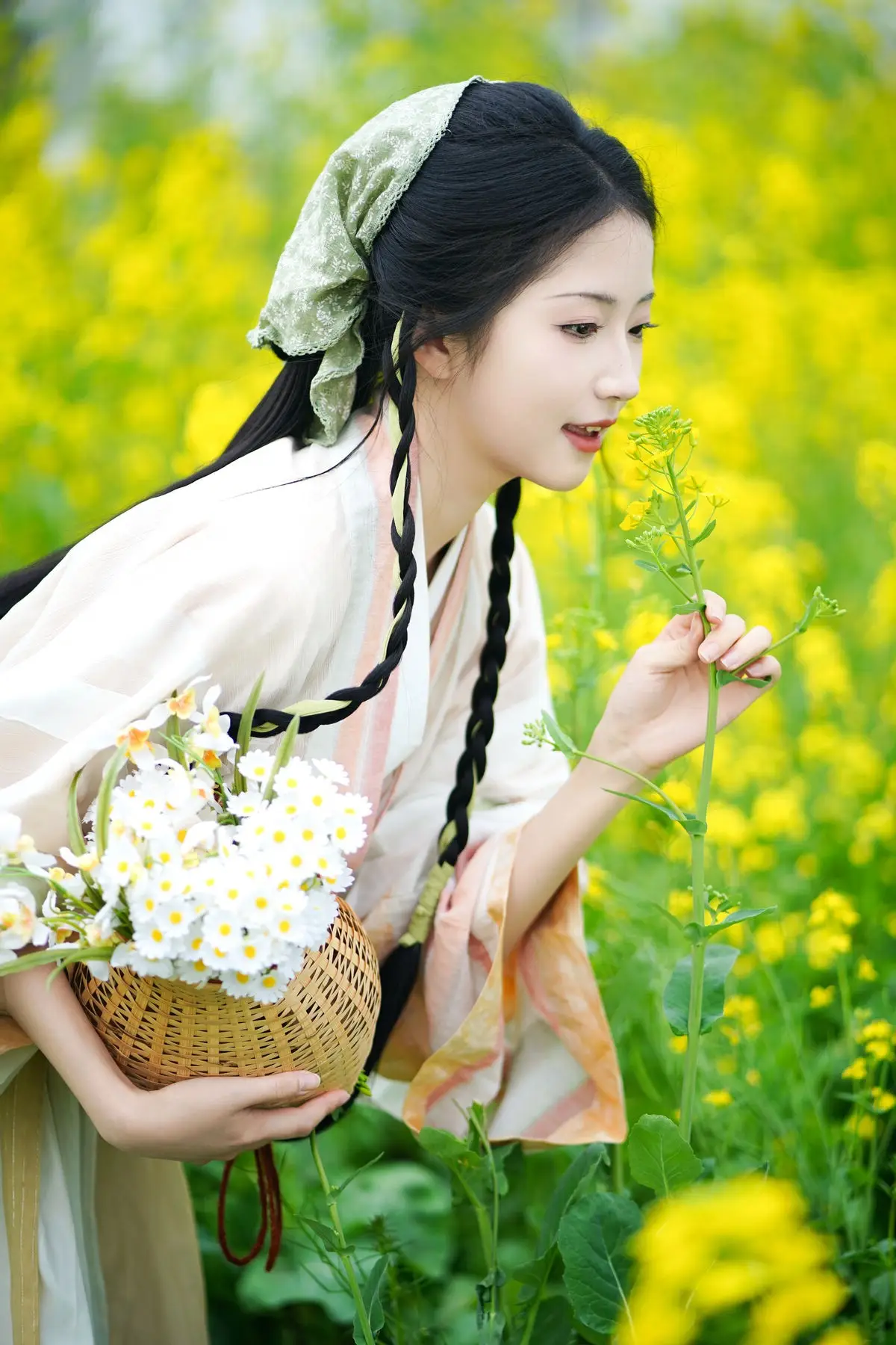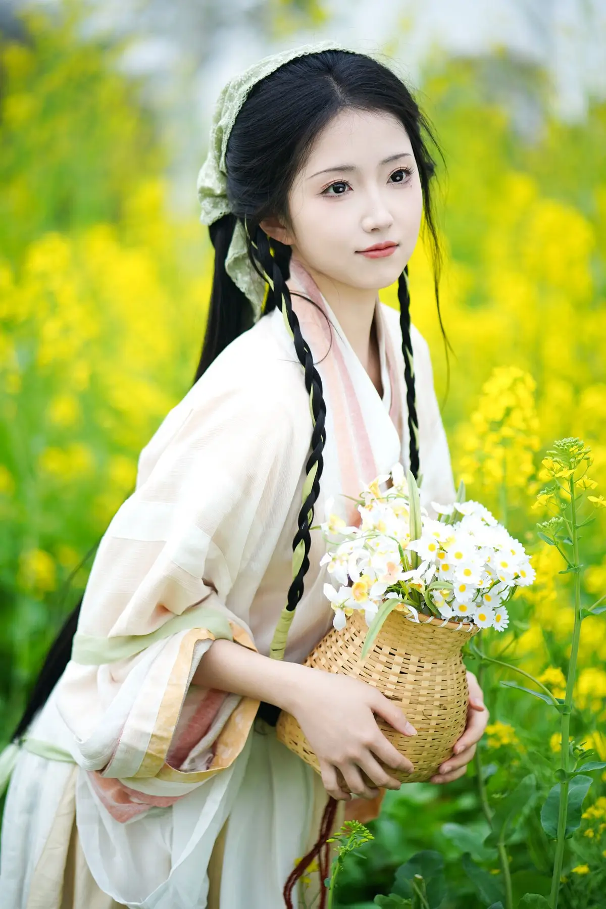 The YiTuYu Vol.8720 Tu Ya W collection transports viewers to a poetic setting where traditional beauty harmonizes with fresh nature. The image features a girl in a pristine white Hanfu gown her long dark hair elegantly braided exuding grace and gentleness. She holds a small woven basket filled with white flowers standing amidst a vibrant field of golden rapeseed flowers creating a vivid and lyrical tableau. Tu Ya W's clear eyes and gentle smile enhance her captivating charm evoking a sense of peace and nostalgia. This is a perfect blend of East Asian aesthetics and the majestic beauty of the natural world.#Hanfu #RapeseedFlowers #AsianBeauty #TuYaW #TraditionalFashion #YiTuYu