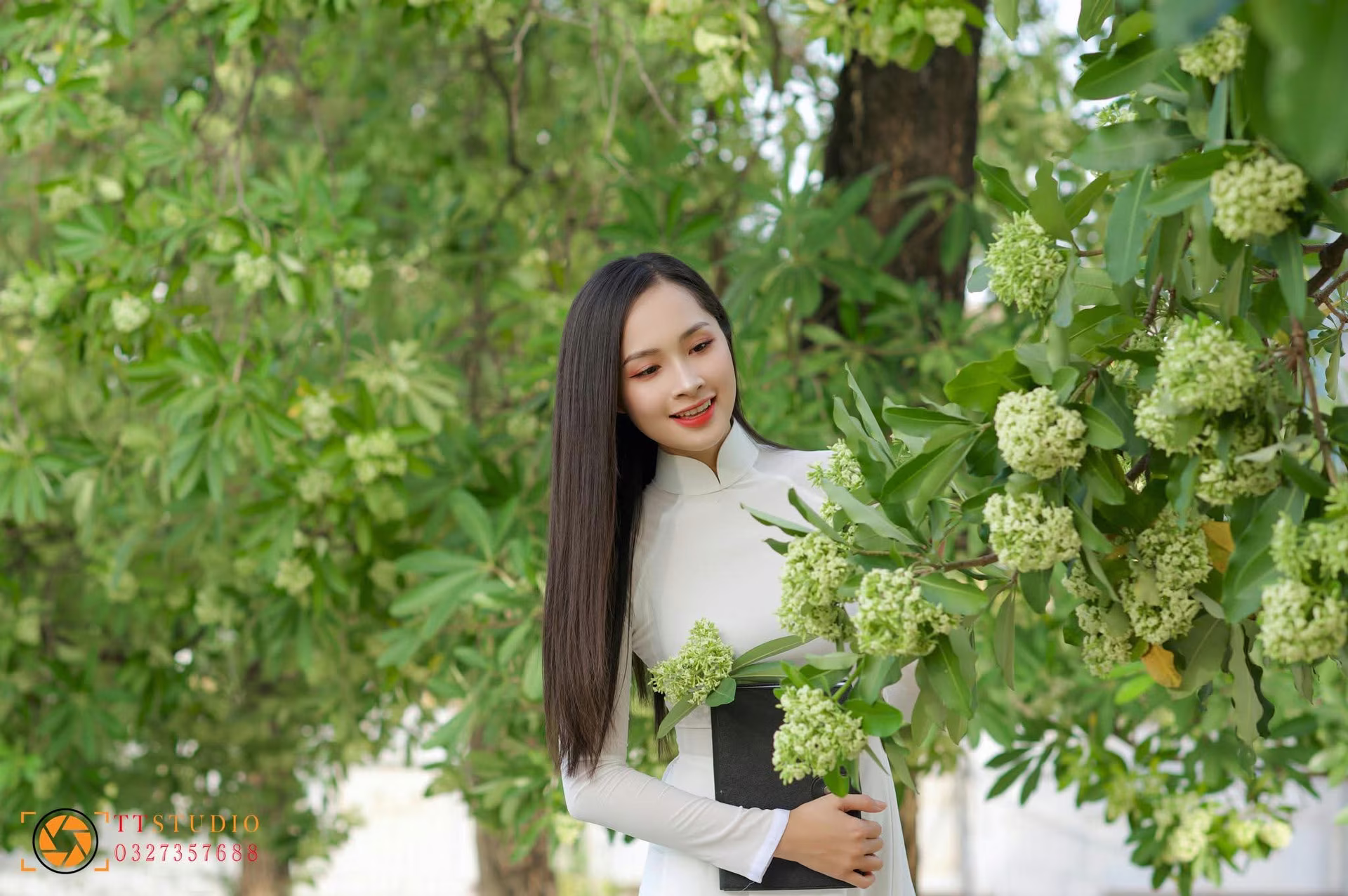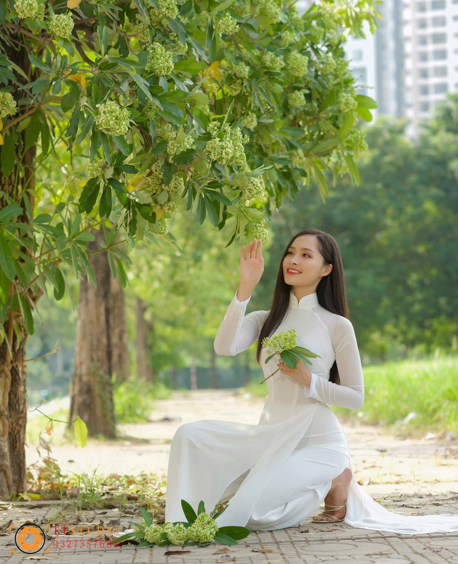In this photograph, a graceful Vietnamese girl adorned in a pristine white Ao Dai, a timeless symbol of traditional beauty, captures the essence of serene elegance. She kneels gently by the pathway, her delicate hand reaching up to touch the lush green foliage, possibly blossoming flowers, creating a beautiful moment of harmony between humanity and nature. Her radiant smile and gentle gaze exude tranquility and pure charm. The flowing white Ao Dai softly cascades onto the ground, further enhancing her graceful and refined appearance. Although an urban landscape is visible in the distance, this scene maintains a peaceful and romantic ambiance. This image is not merely a snapshot but a heartfelt tribute to Vietnamese cultural beauty, celebrating the elegance of a Vietnamese woman in her traditional attire, evoking feelings of serenity and timeless grace.