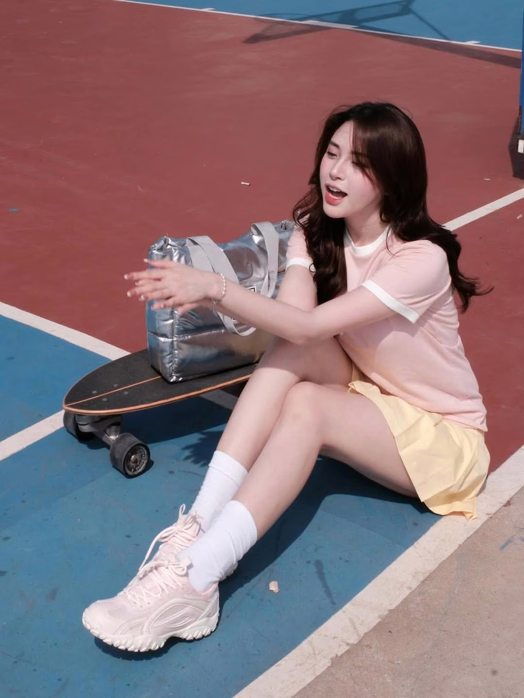 VGU No.152 captures the image of a young woman full of personality and energy, confidently showcasing her trendy sporty fashion style on a basketball court. She wears a gentle pink t-shirt paired with vibrant yellow shorts, along with pink and white sneakers and high socks, creating an overall look that is both athletic and feminine. Stylish headphones and a silver FILA branded bag are perfect accents, reflecting her modern aesthetic. With captivating eyes and a professional pose, the girl conveys a spirit of sportsmanship, freedom, and positive energy amidst the vast urban landscape. The basketball court setting and distant high-rise buildings further highlight her modern, free-spirited beauty.