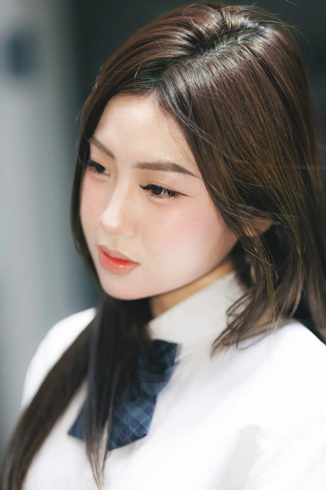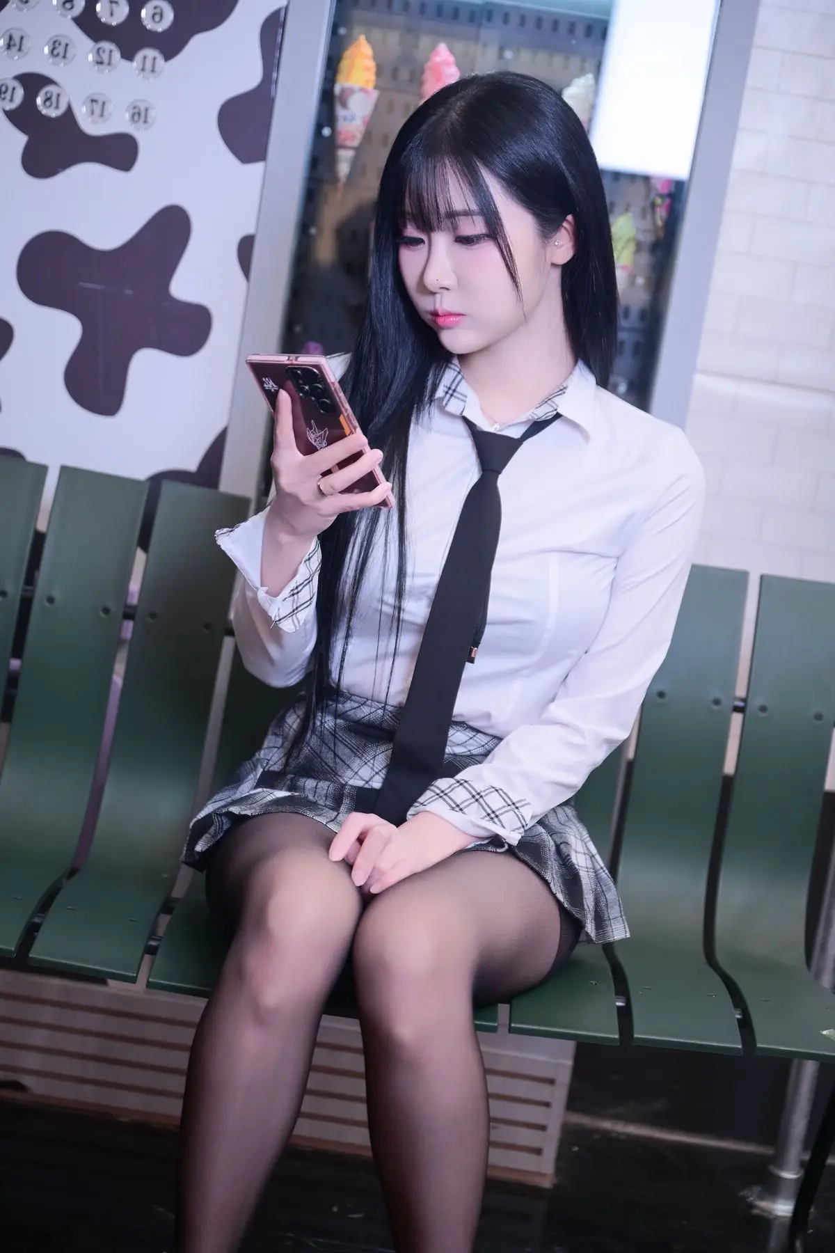 Bomi captivates in her elegant schoolgirl uniform, sitting thoughtfully on a subway station bench. Her long, lustrous black hair falls naturally, highlighting her beautiful face and gentle features. She wears a pristine white shirt paired with a plaid skirt and a black tie, creating the familiar image of a schoolgirl yet exuding a unique charm. The black stockings hugging her legs further enhance her graceful appearance. In the background, the reflected urban scenery hints at a bustling life, but Bomi offers a moment of quiet contemplation. This Bomi Schoolgirl In The Subway Part01 collection captures delicate perspectives, portraying her enchanting East Asian beauty amidst the busy public space.#Bomi #SchoolgirlUniform #SubwayGirl #AsianBeauty #UrbanFashion