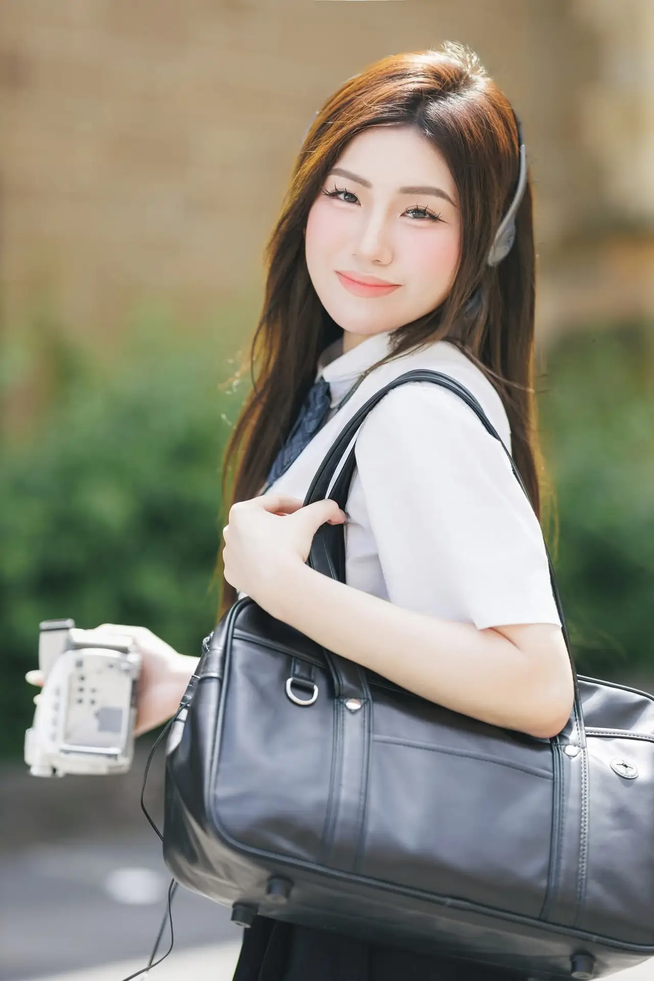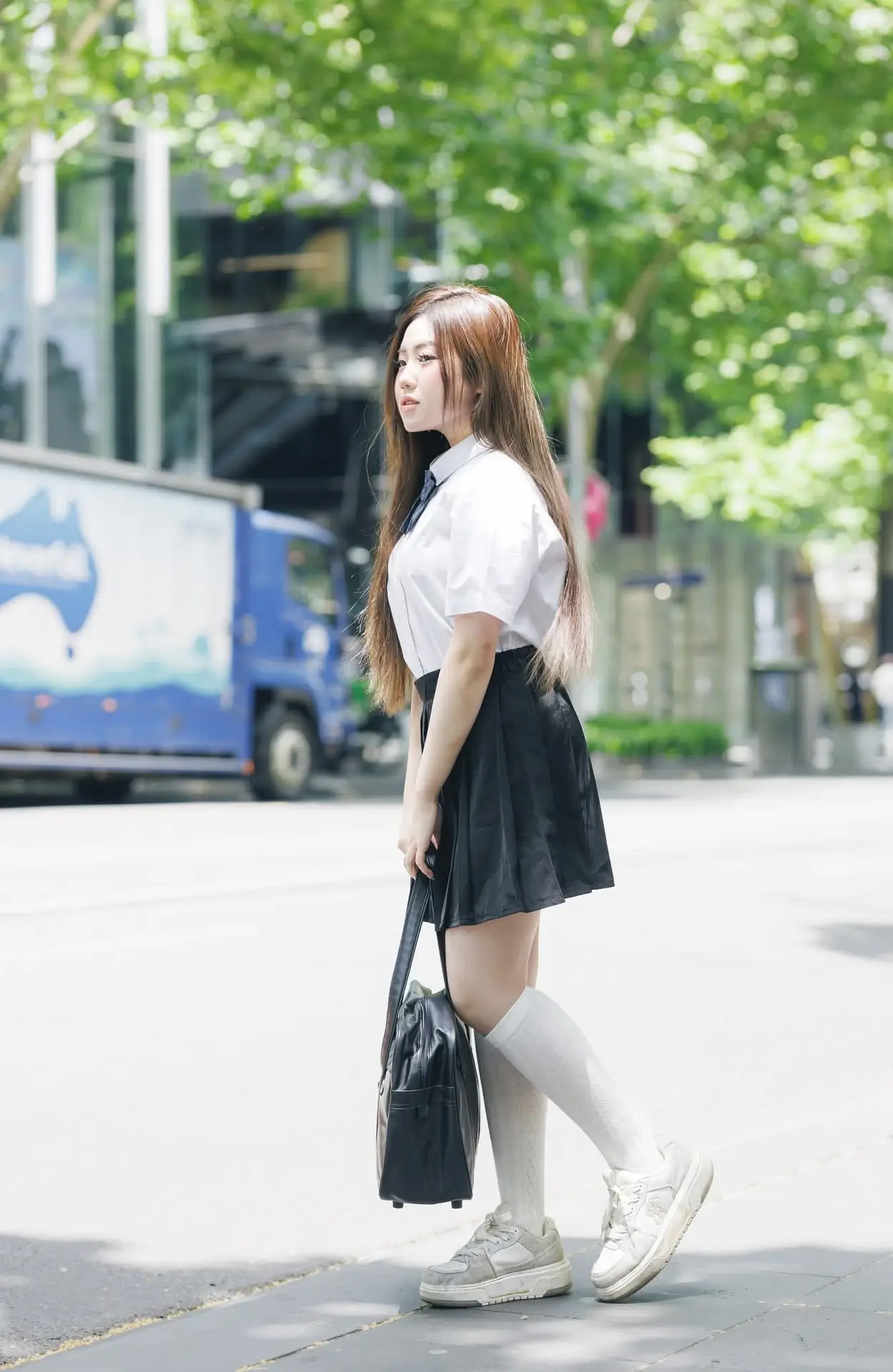 Charming Schoolgirl Embraces Street Style with Classic Uniform.