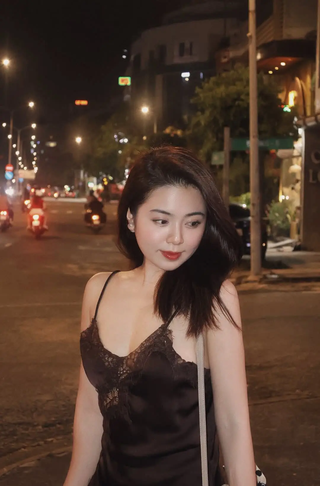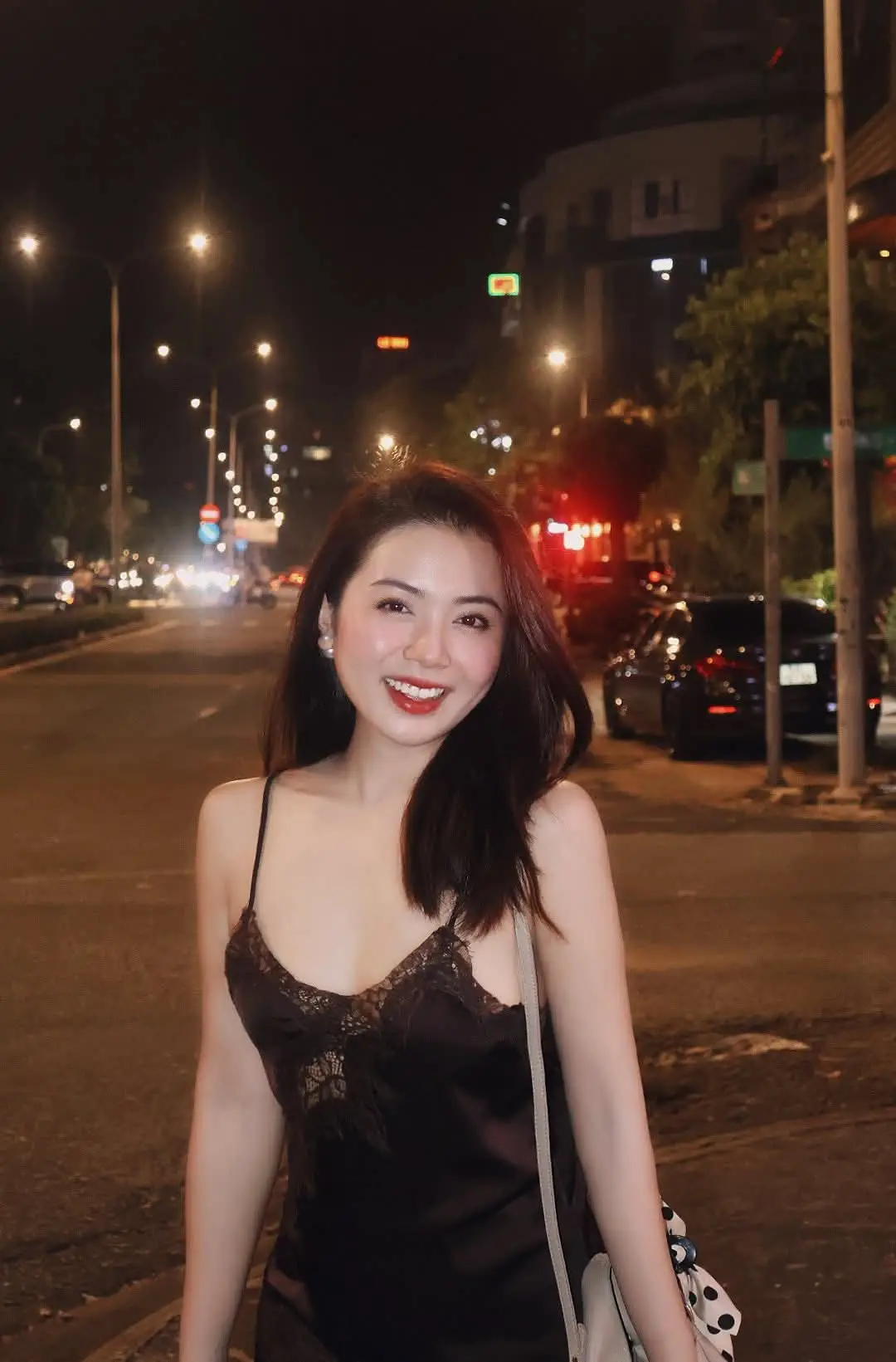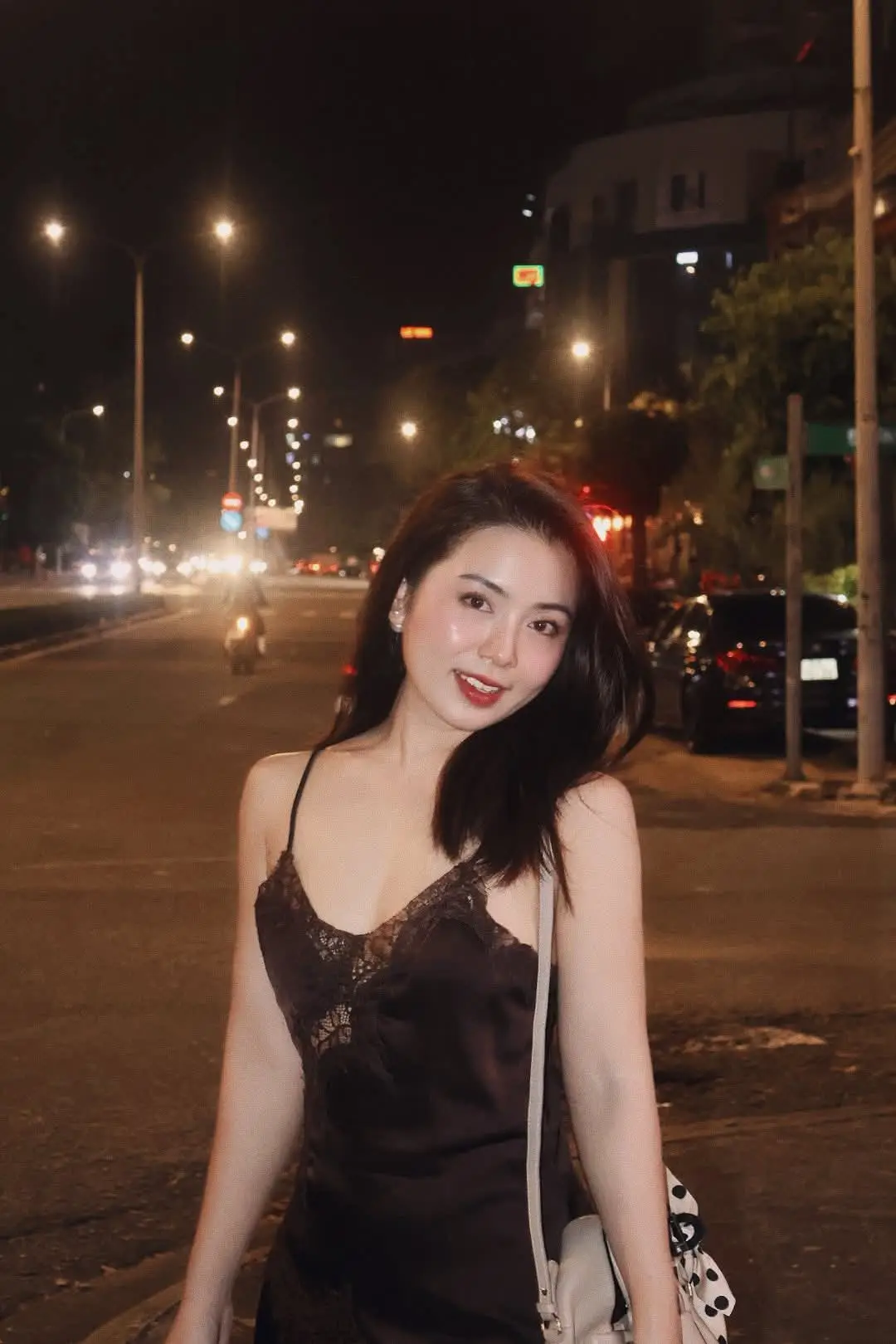 This stunning photograph captures a beautiful young woman with a radiant and confident smile glowing brightly amidst the bustling city night. The soft blur of streetlights and traffic in the background creates a romantic urban backdrop perfectly highlighting her natural beauty and self-assured demeanor. Dressed in an elegant dark spaghetti strap top with delicate lace details she exudes a sophisticated and modern charm. Her sparkling eyes and warm smile illuminate the street conveying a sense of joy and captivating allure. This image beautifully portrays the vibrant and stylish spirit of a woman enjoying a night out in the city.#VietnameseGirl #CityNight #RadiantSmile #UrbanFashion #NightOut