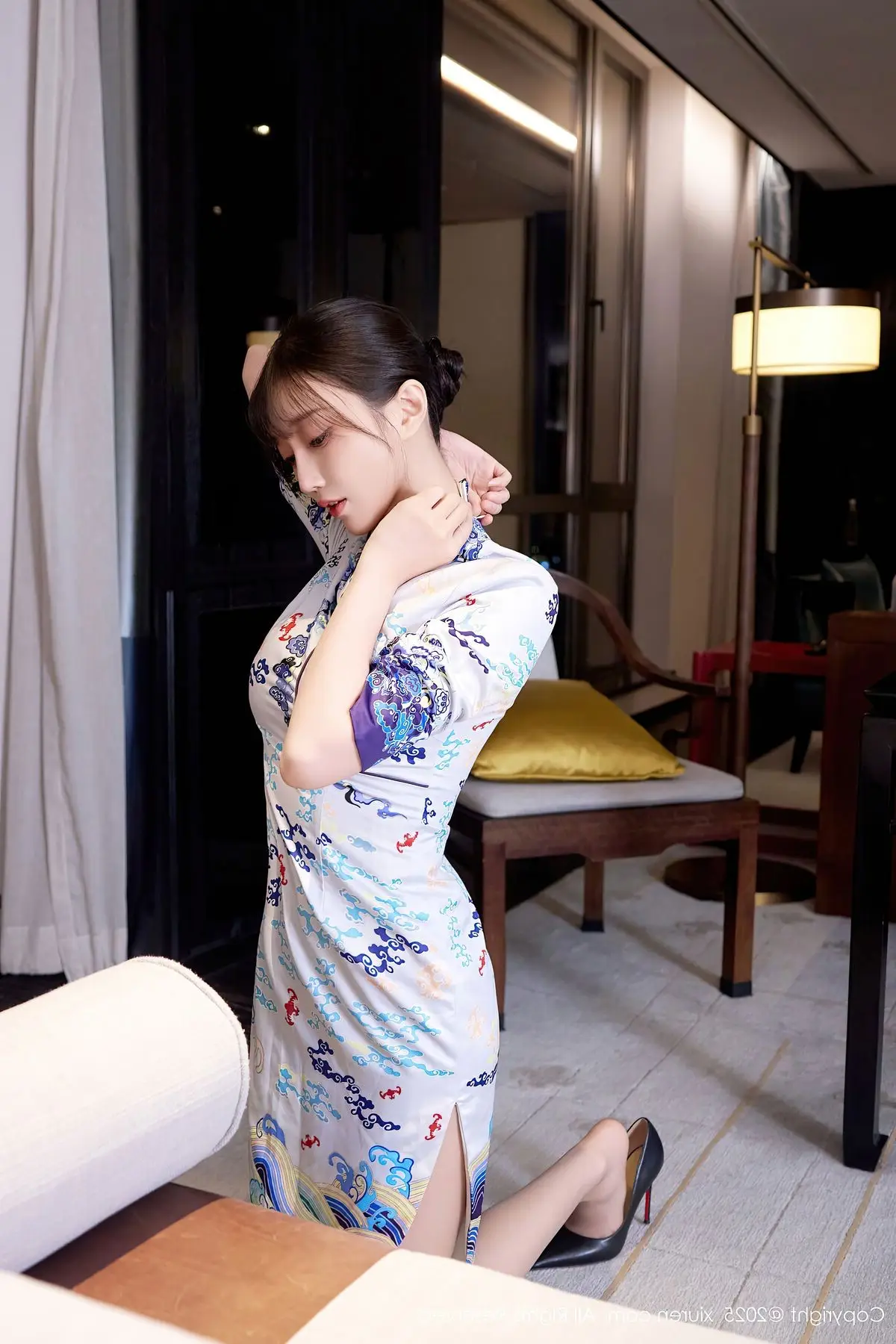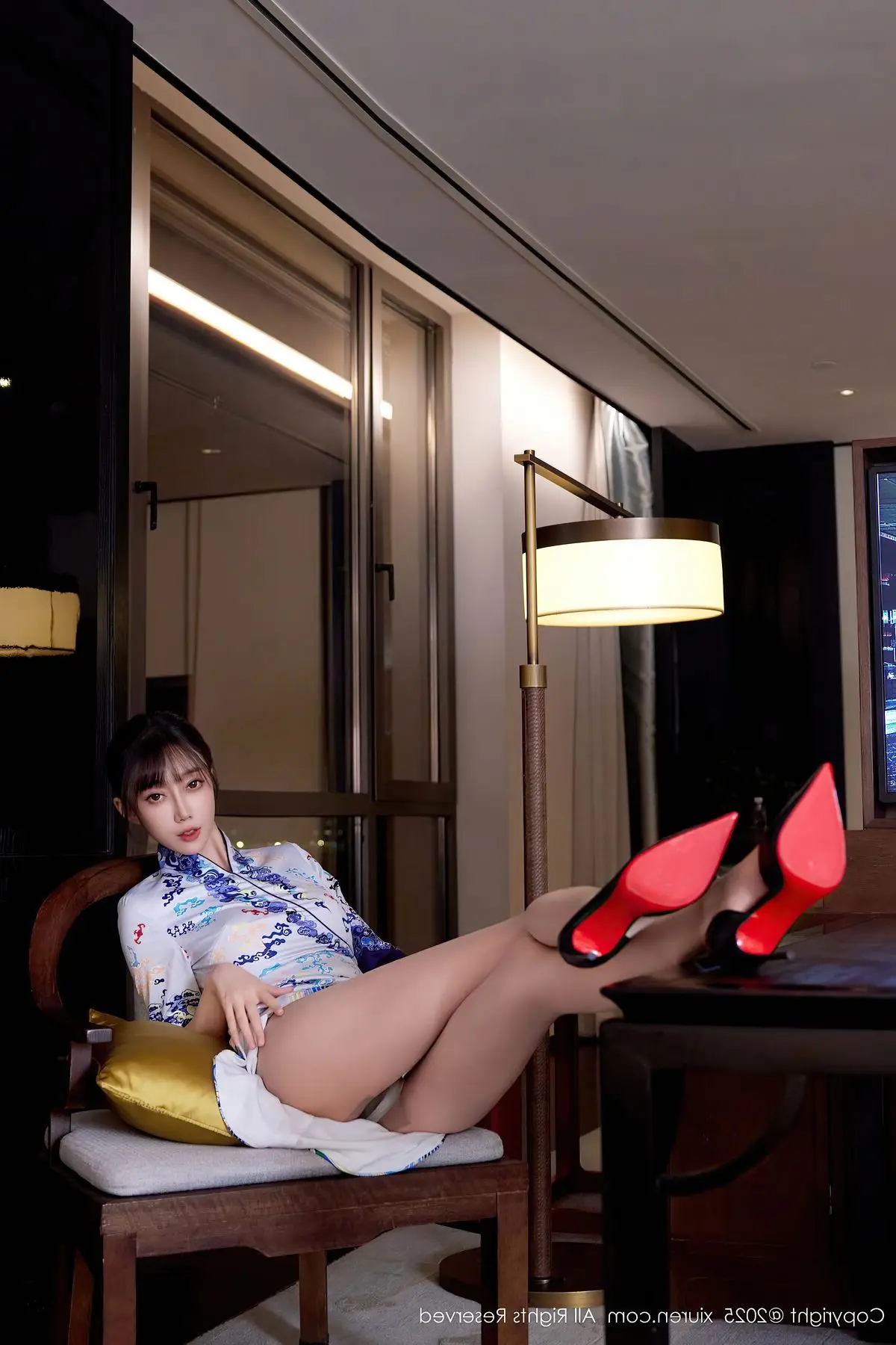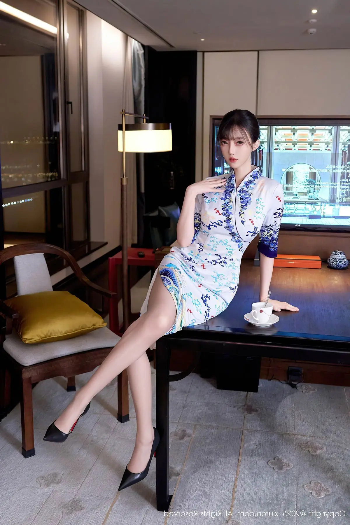 This captivating photograph showcases model Yue Er Yue Er in a moment of sheer elegance and allure. She is adorned in a modern white cheongsam, exquisitely detailed with delicate blue floral patterns, gracefully accentuating her slender figure and highlighting her serene East Asian beauty. Posed comfortably within a luxurious setting, the sparkling city lights visible through the window create a mesmerizing urban backdrop. Her poised posture and introspective gaze convey both confidence and a hint of intriguing mystery. This ensemble beautifully merges classic traditional aesthetics with contemporary fashion, presenting an image that is both sophisticated and deeply captivating.#XiuRen #YueErYueEr #Cheongsam #AsianBeauty #UrbanFashion