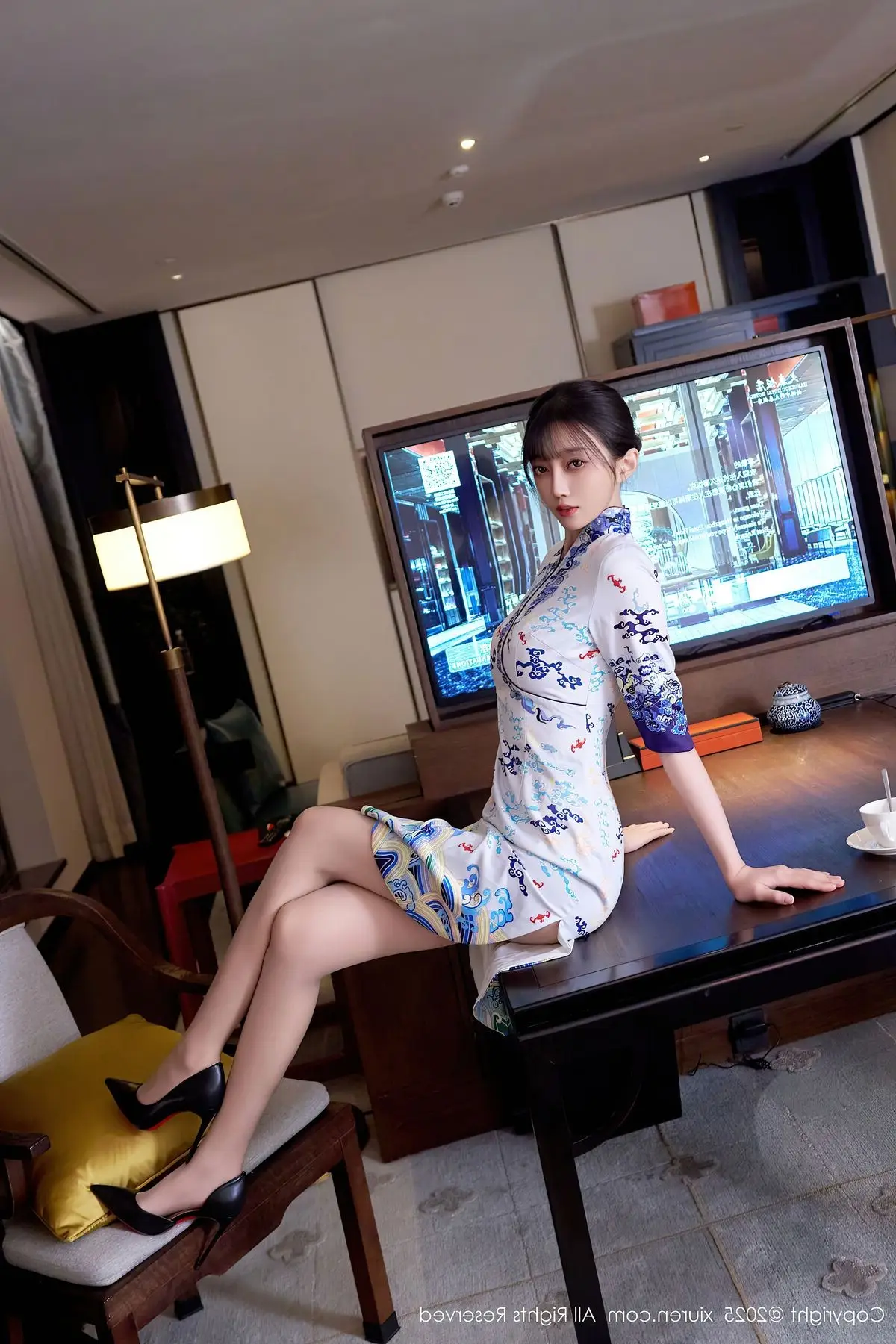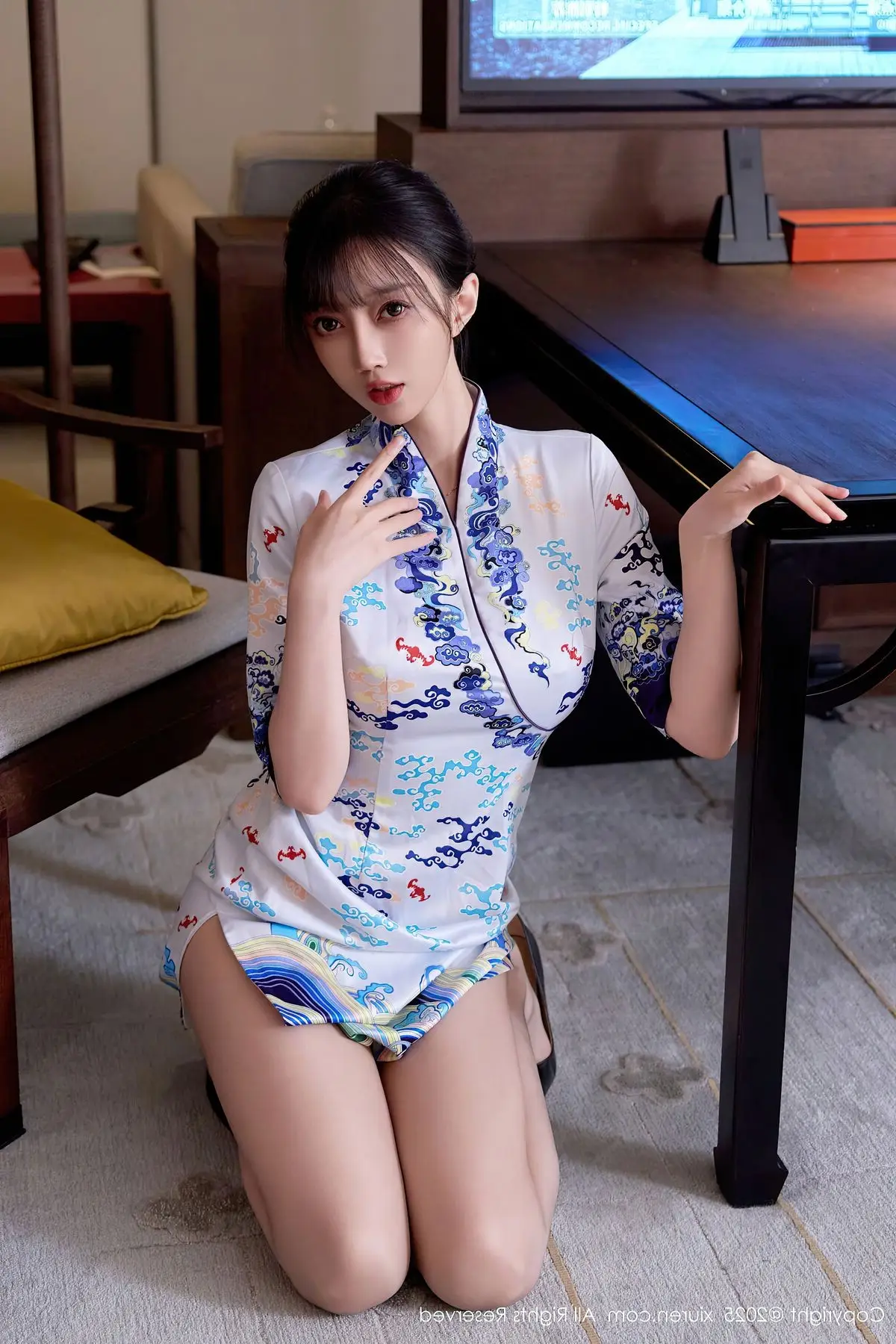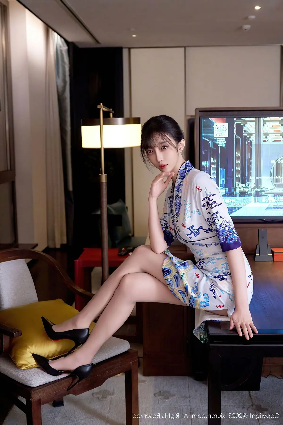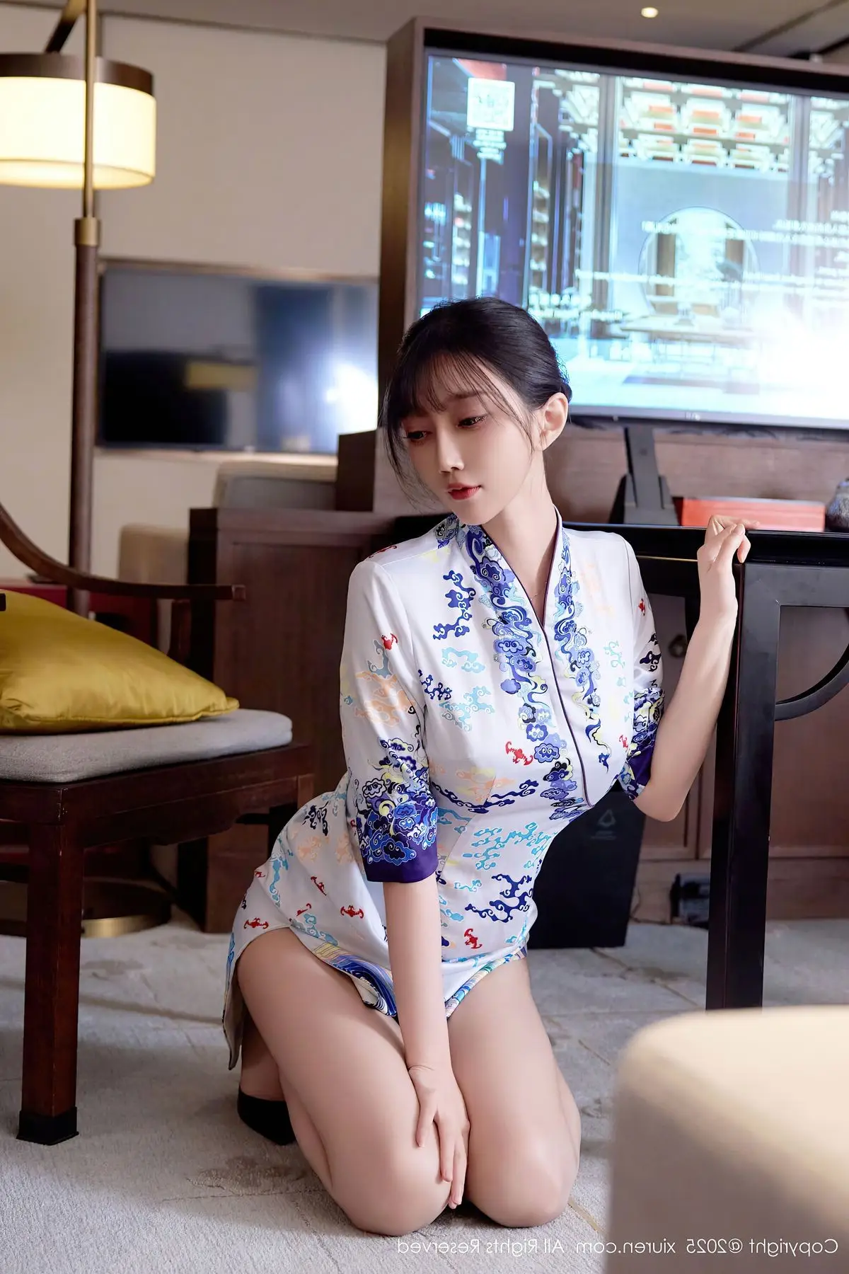 This captivating photograph showcases model Yue Er Yue Er in a moment of sheer elegance and allure. She is adorned in a modern white cheongsam, exquisitely detailed with delicate blue floral patterns, gracefully accentuating her slender figure and highlighting her serene East Asian beauty. Posed comfortably within a luxurious setting, the sparkling city lights visible through the window create a mesmerizing urban backdrop. Her poised posture and introspective gaze convey both confidence and a hint of intriguing mystery. This ensemble beautifully merges classic traditional aesthetics with contemporary fashion, presenting an image that is both sophisticated and deeply captivating.#XiuRen #YueErYueEr #Cheongsam #AsianBeauty #UrbanFashion