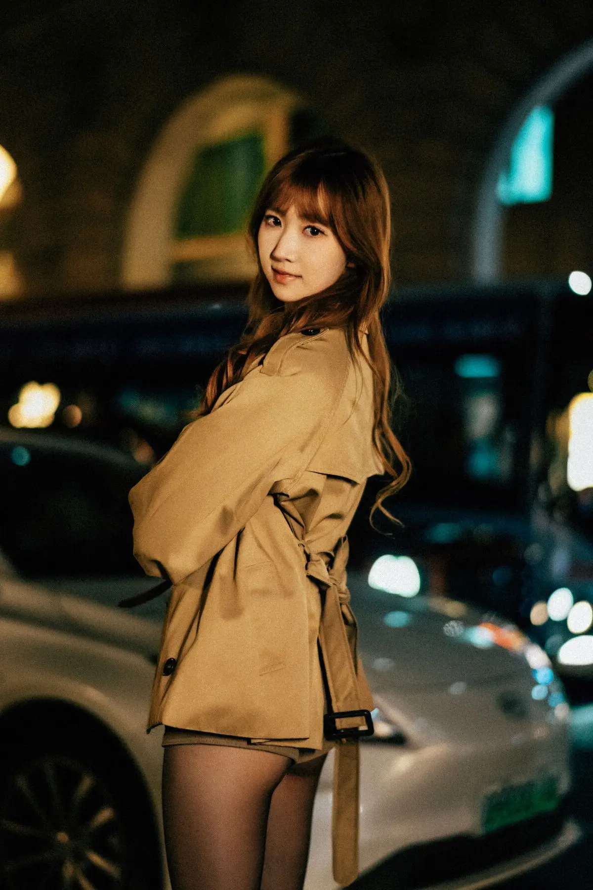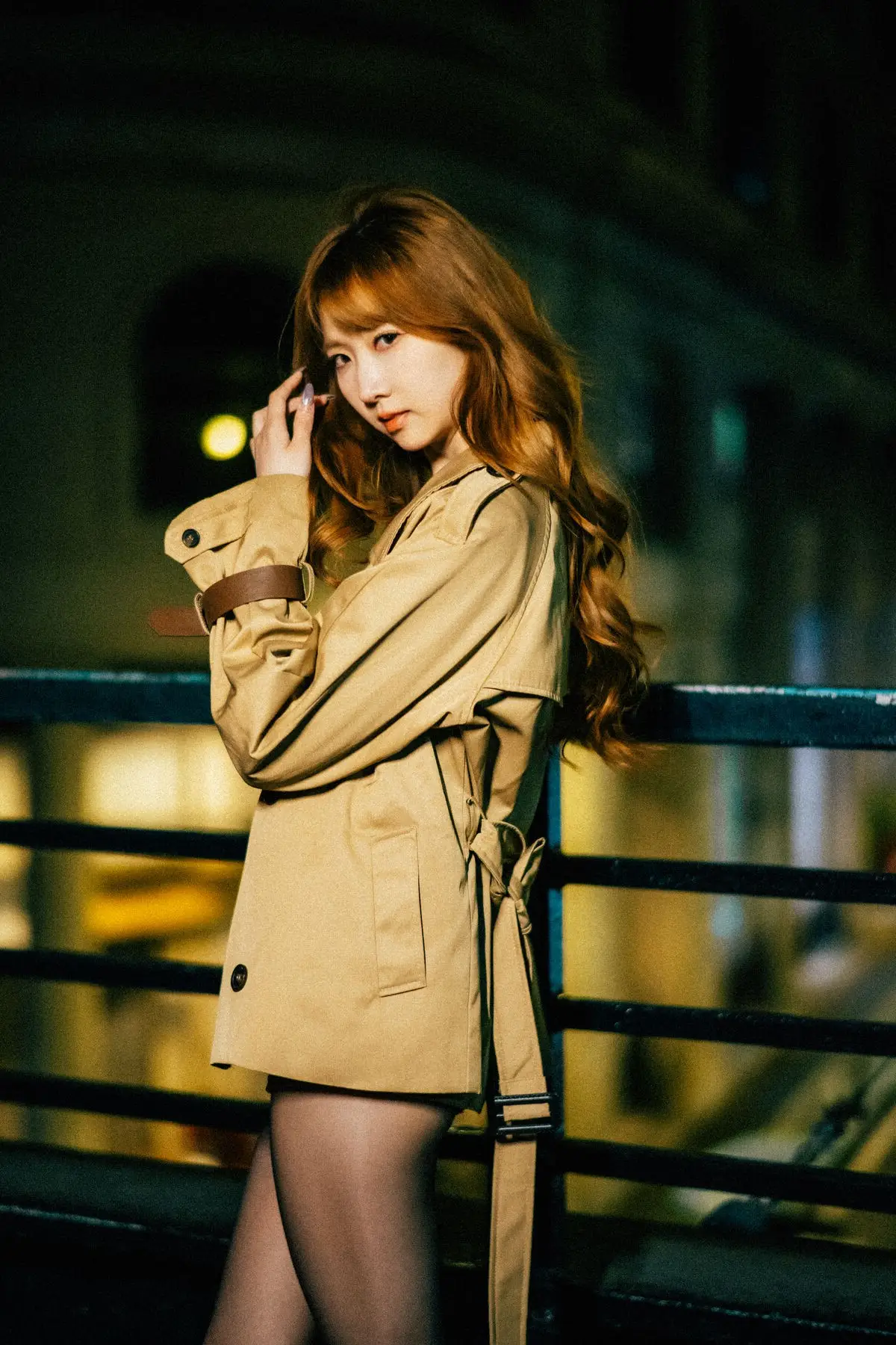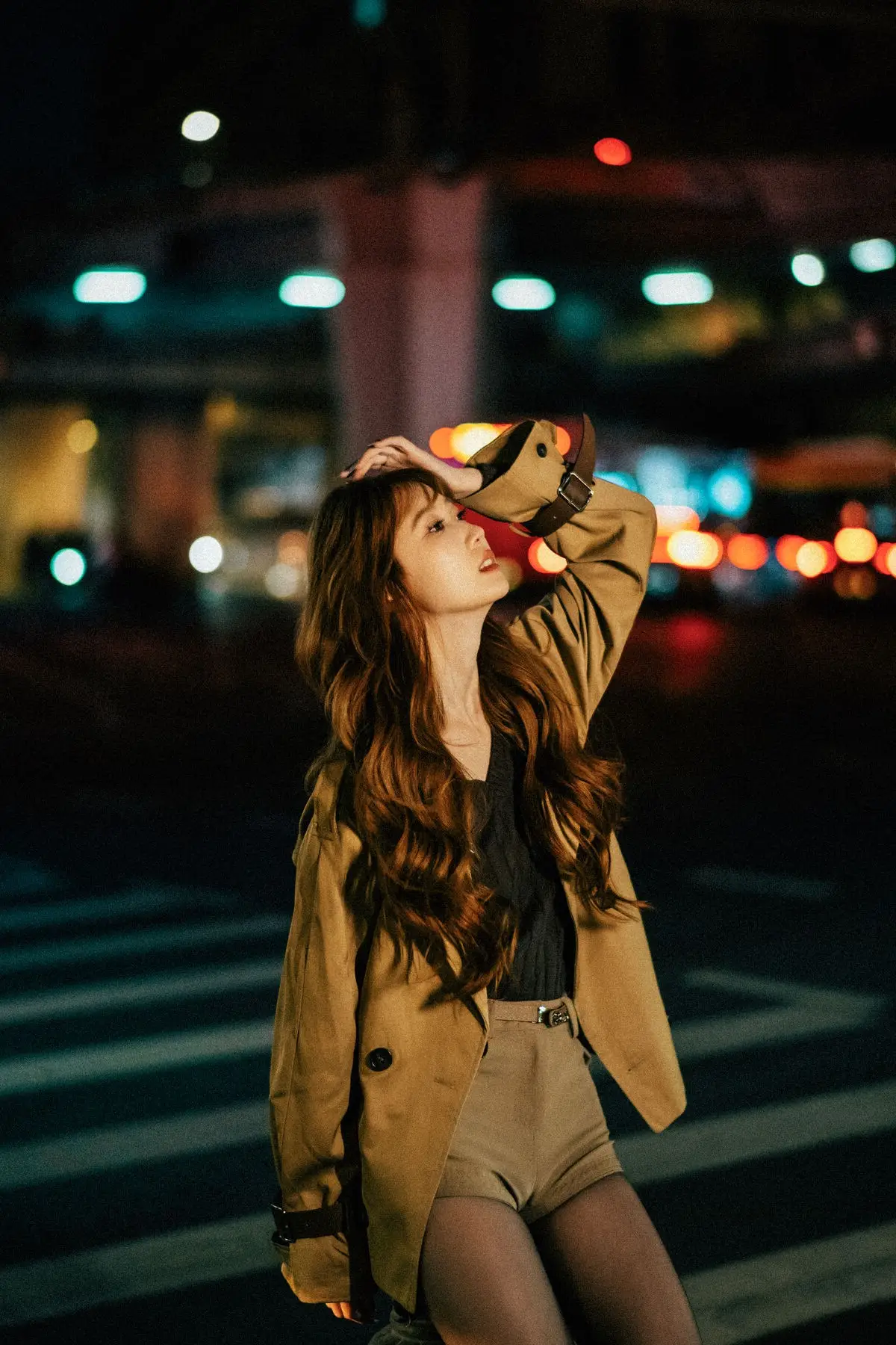In the YiTuYu Vol.8618 collection, Bu Chi Zao Fan Hui Gua captivates with her confident and alluring presence amidst the nocturnal city landscape. Her long, wavy, reddish-brown hair and captivating gaze perfectly complement the elegant beige trench coat she wears, creating a look that is both modern and distinctively chic. The urban street setting, illuminated by the soft blur of city lights and car trails, provides a dynamic and romantic backdrop. Her poised stance on the crosswalk evokes a sense of independence and freedom, embodying a woman confidently navigating and owning her space within the bustling city. This series beautifully merges high fashion with contemporary urban aesthetics, transforming ordinary street corners into an inspiring art stage.#YiTuYu #BuChiZaoFanHuiGua #UrbanFashion #NightCityStyle #AsianModel