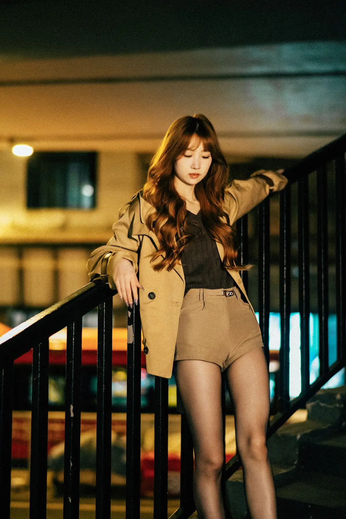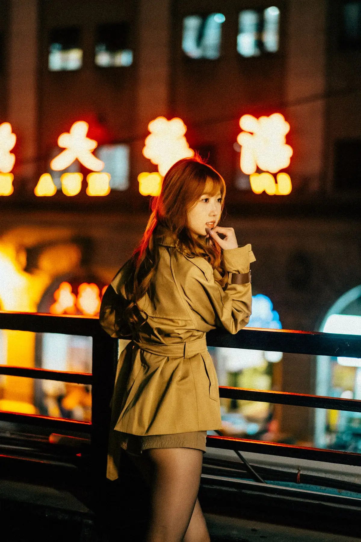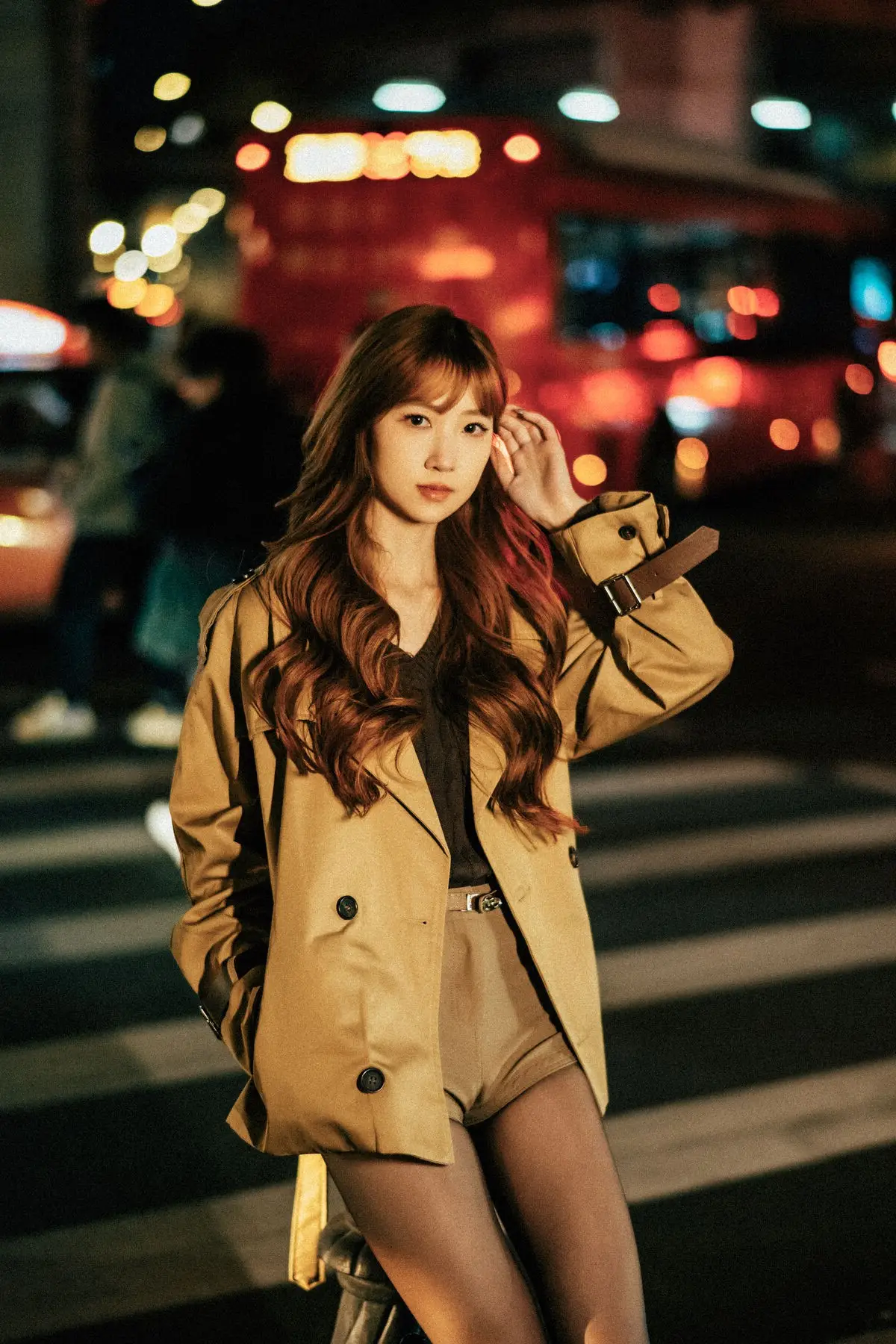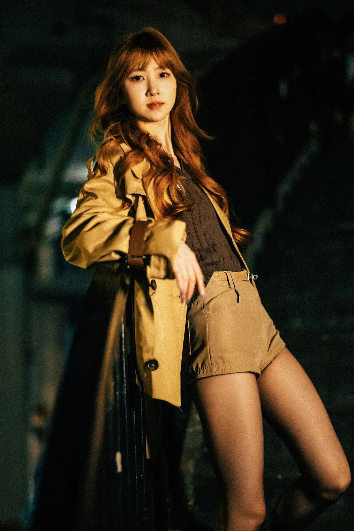 In the YiTuYu Vol.8618 collection, Bu Chi Zao Fan Hui Gua captivates with her confident and alluring presence amidst the nocturnal city landscape. Her long, wavy, reddish-brown hair and captivating gaze perfectly complement the elegant beige trench coat she wears, creating a look that is both modern and distinctively chic. The urban street setting, illuminated by the soft blur of city lights and car trails, provides a dynamic and romantic backdrop. Her poised stance on the crosswalk evokes a sense of independence and freedom, embodying a woman confidently navigating and owning her space within the bustling city. This series beautifully merges high fashion with contemporary urban aesthetics, transforming ordinary street corners into an inspiring art stage.#YiTuYu #BuChiZaoFanHuiGua #UrbanFashion #NightCityStyle #AsianModel