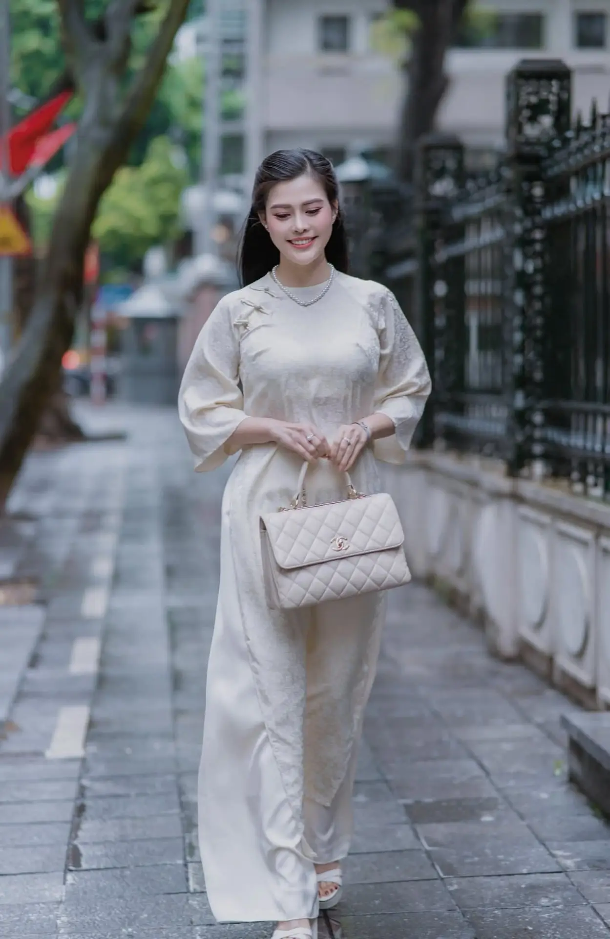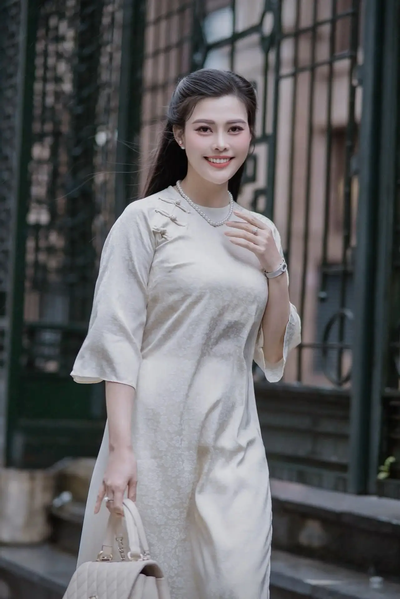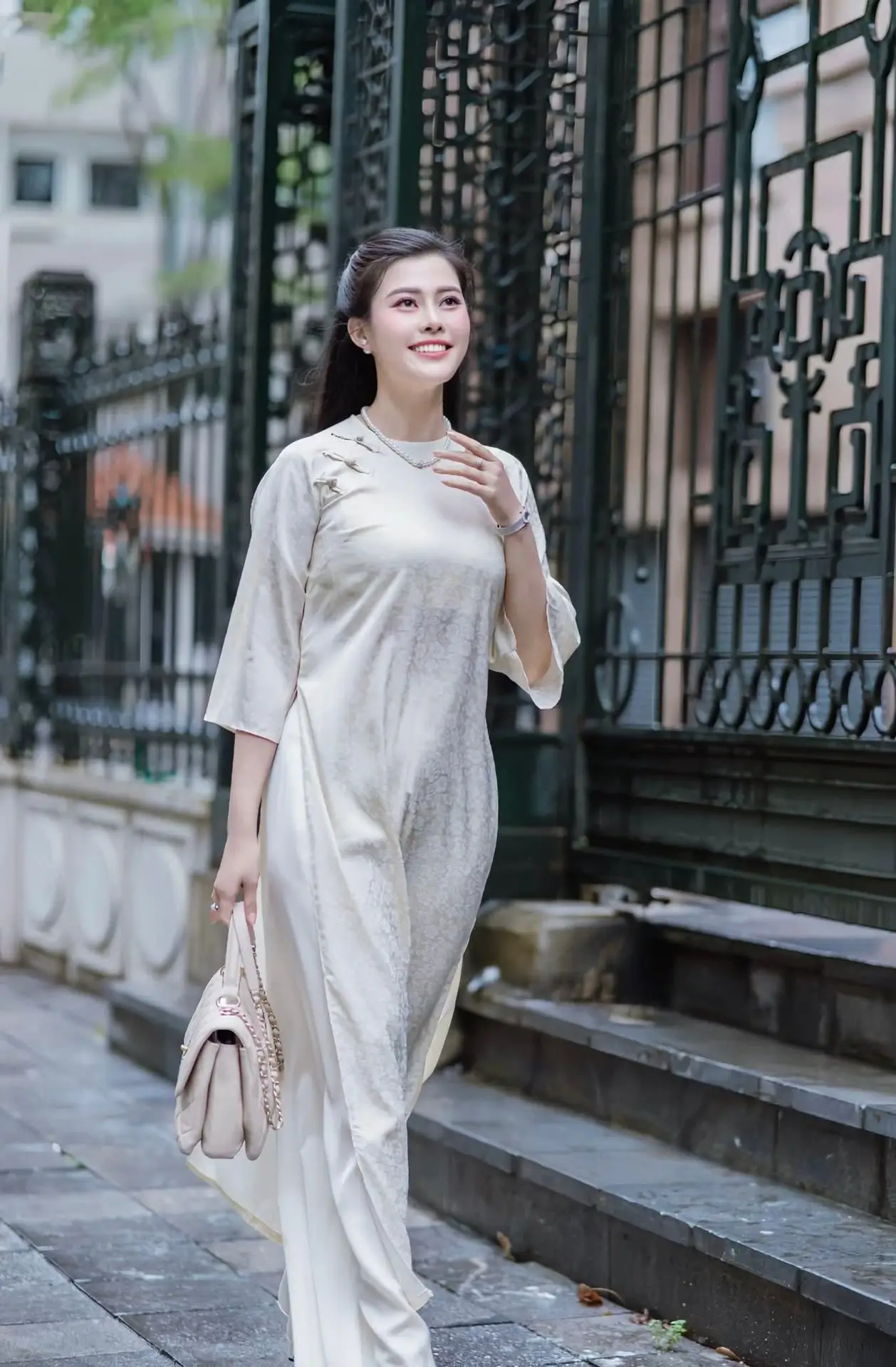 The VGU No162 image beautifully captures a young Vietnamese woman gracefully walking in a modern ao dai. Her gentle steps on the urban street exude an elegant and refined beauty. The sophisticated cream-colored ao dai paired with a matching handbag not only flatters her figure but also highlights her luxurious fashion sense. Her charming smile harmonizes with the city backdrop creating a picturesque scene that beautifully merges traditional aesthetics with contemporary life. This portrayal embodies the confidence and timeless allure of Vietnamese women showcasing their ability to radiate beauty and style in any setting.