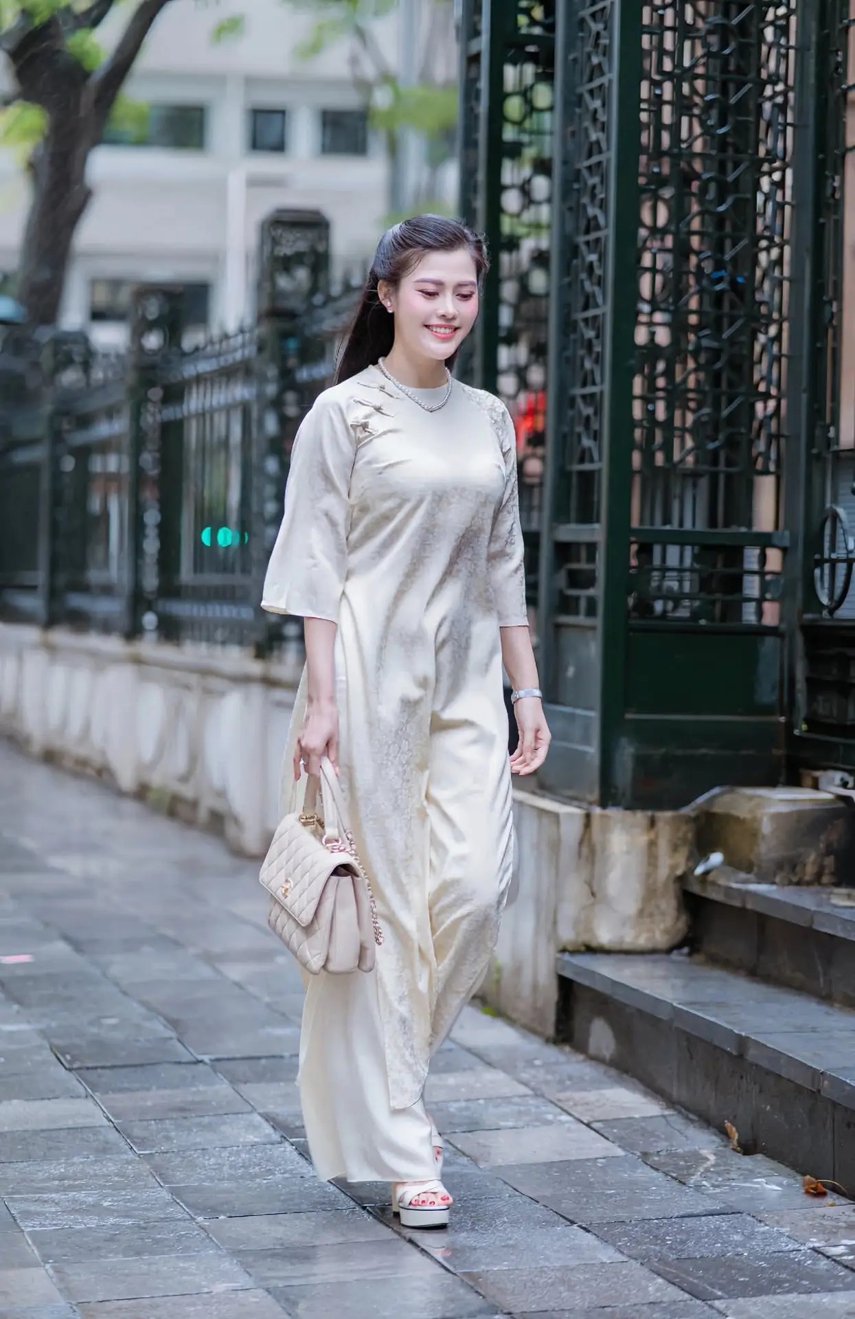 VGU No.162: Modern Ao Dai Grace: Vietnamese Woman's Elegant Style & Allure on City Streets.