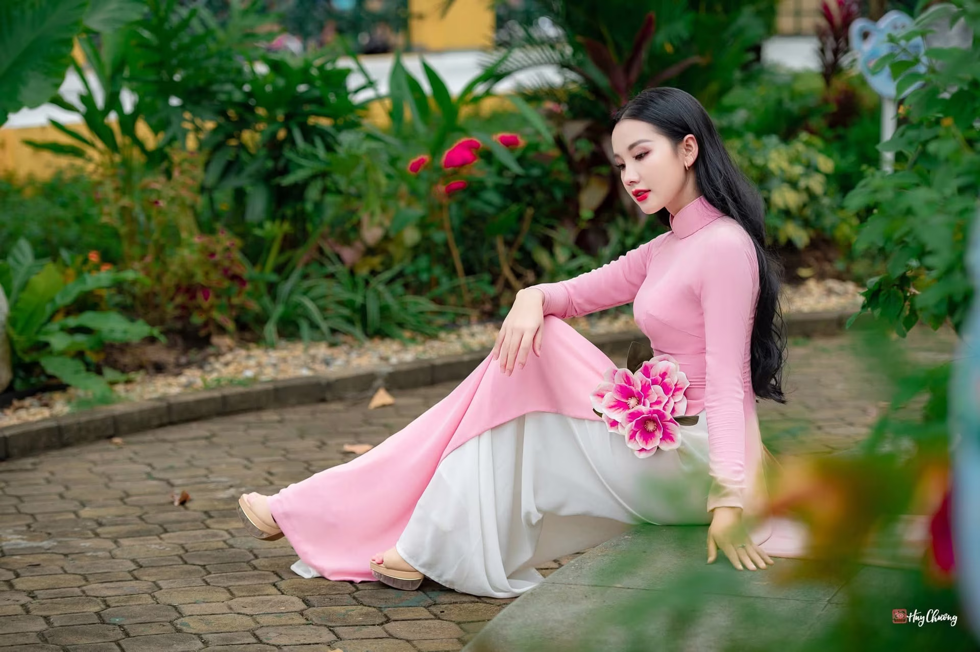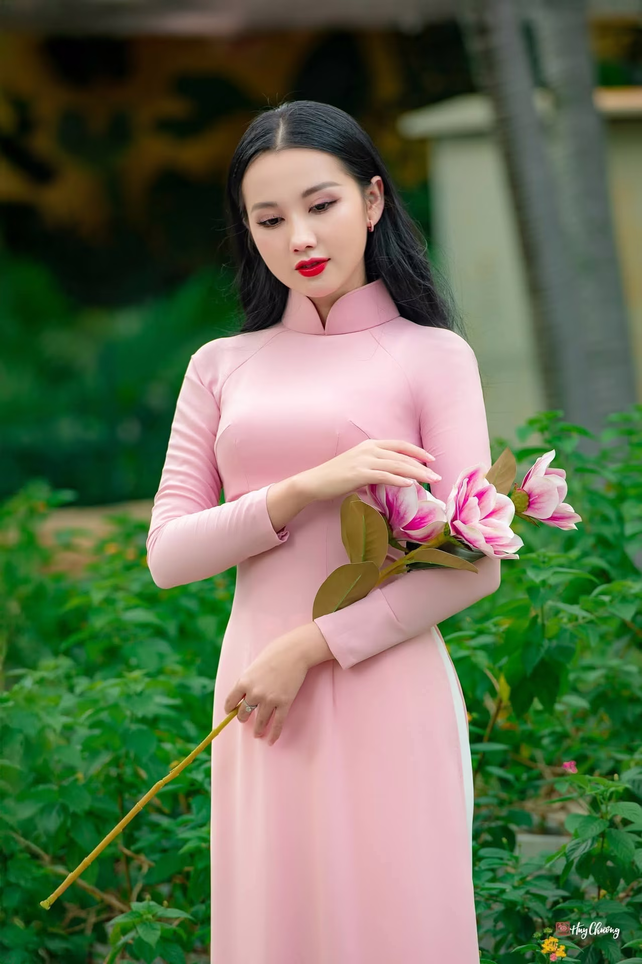 VGU No.160: Discover the Gentle Beauty of a Pink Ao Dai Maiden in a Dreamy Garden