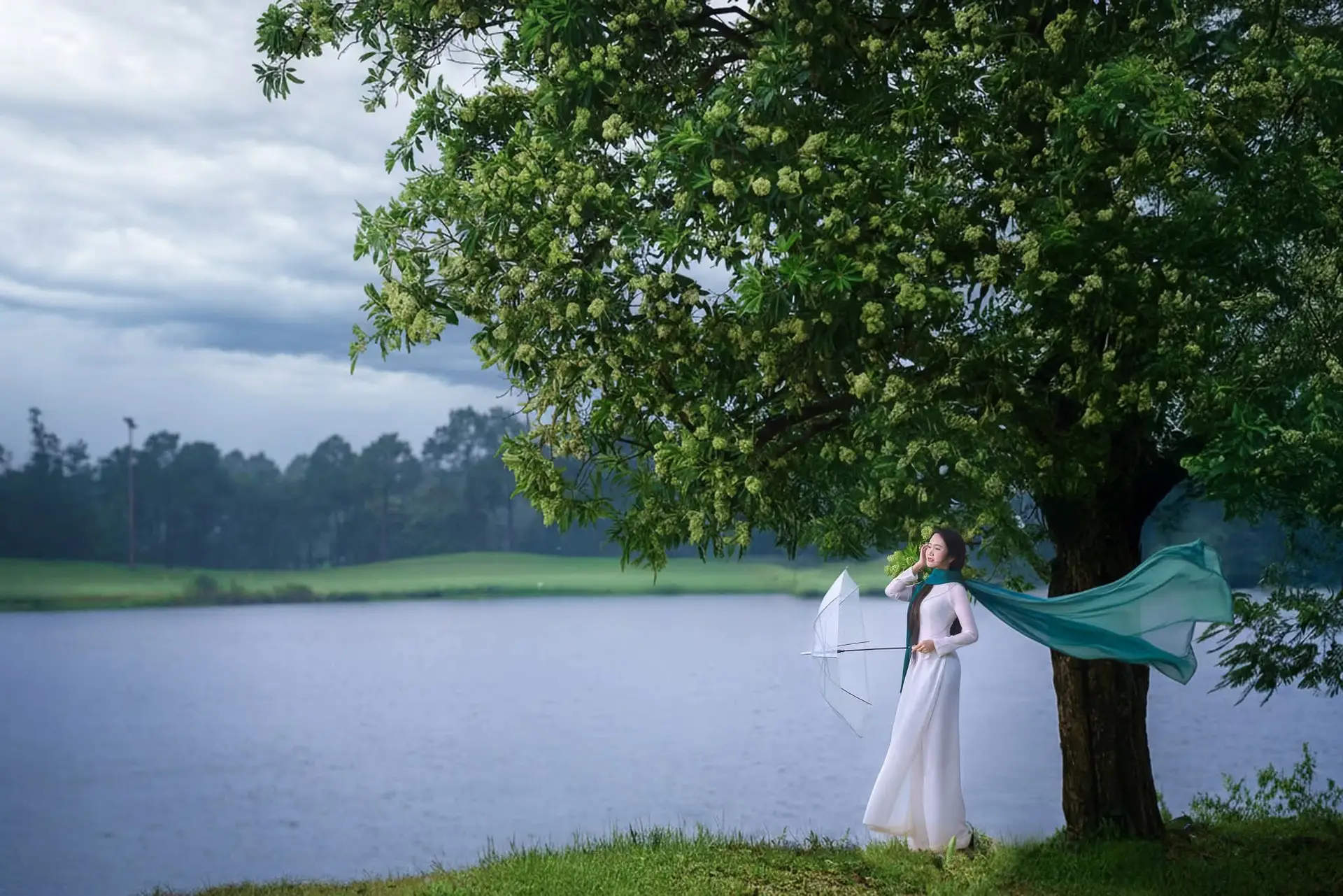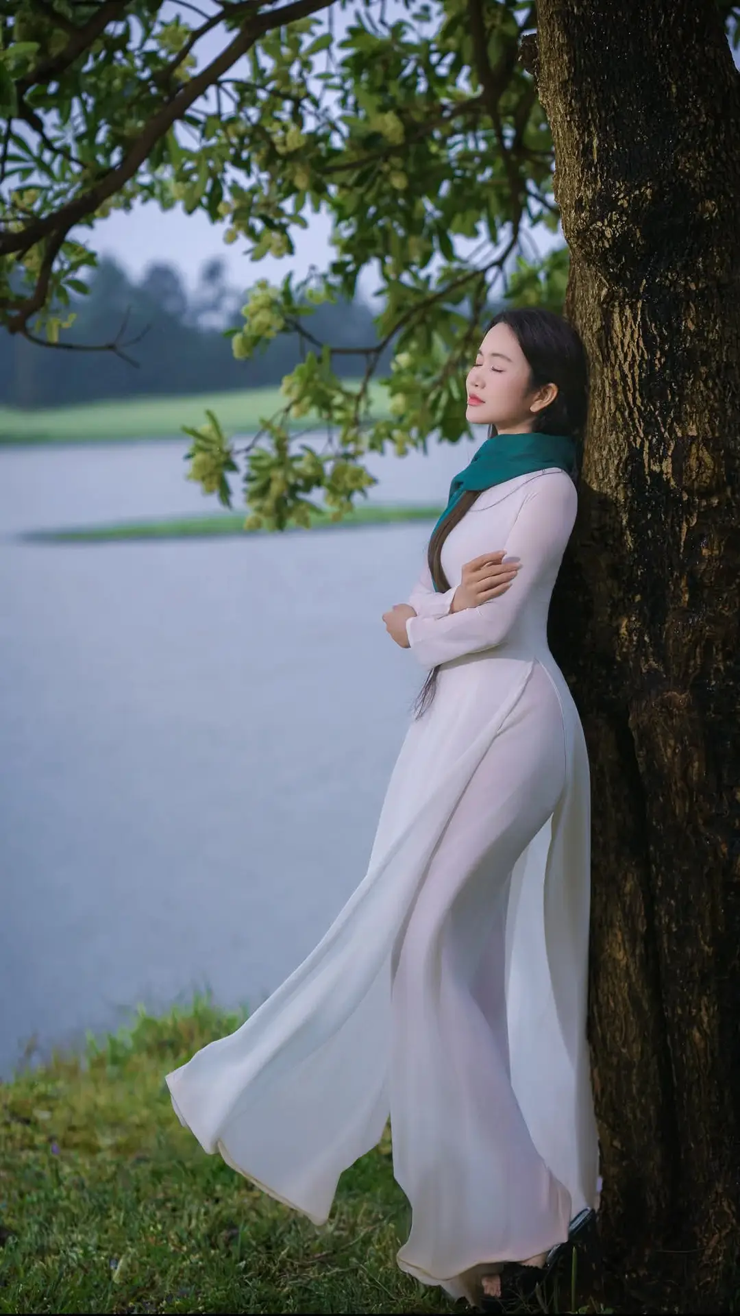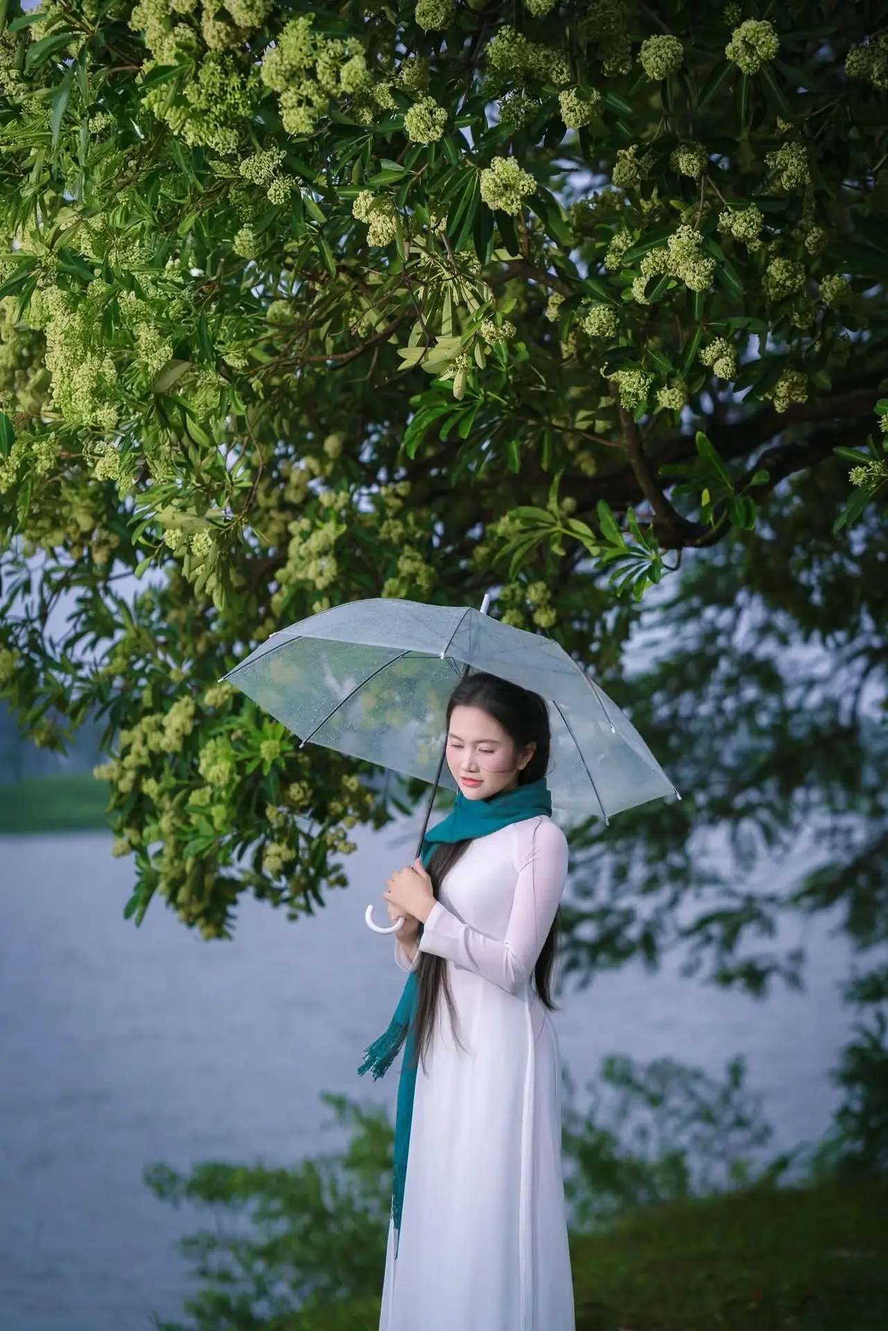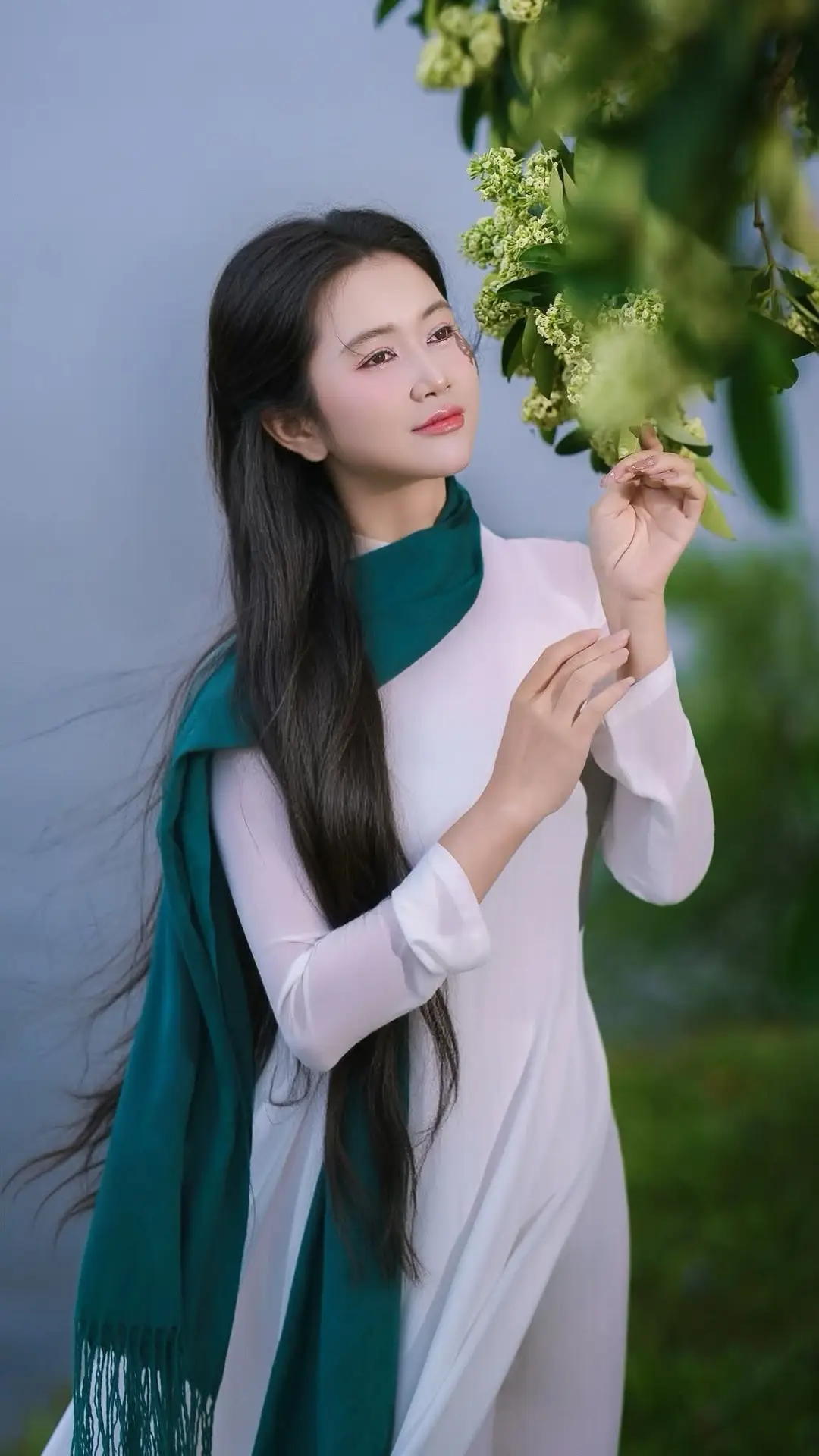 This stunning photograph captures a beautiful Vietnamese student in a pristine white Ao Dai. Her long flowing hair frames a serene face as she gently reaches out to touch clusters of green blossoms, her gaze lost in a dreamy contemplation. The elegant teal scarf draped around her neck adds a touch of sophistication and charm to this traditional attire. More than just a portrait, this image symbolizes the gentle and pure beauty of Vietnamese women, especially the iconic Ao Dai student, cherished across generations. Her graceful presence harmonizes perfectly with the surrounding nature, creating a peaceful and poetic scene.