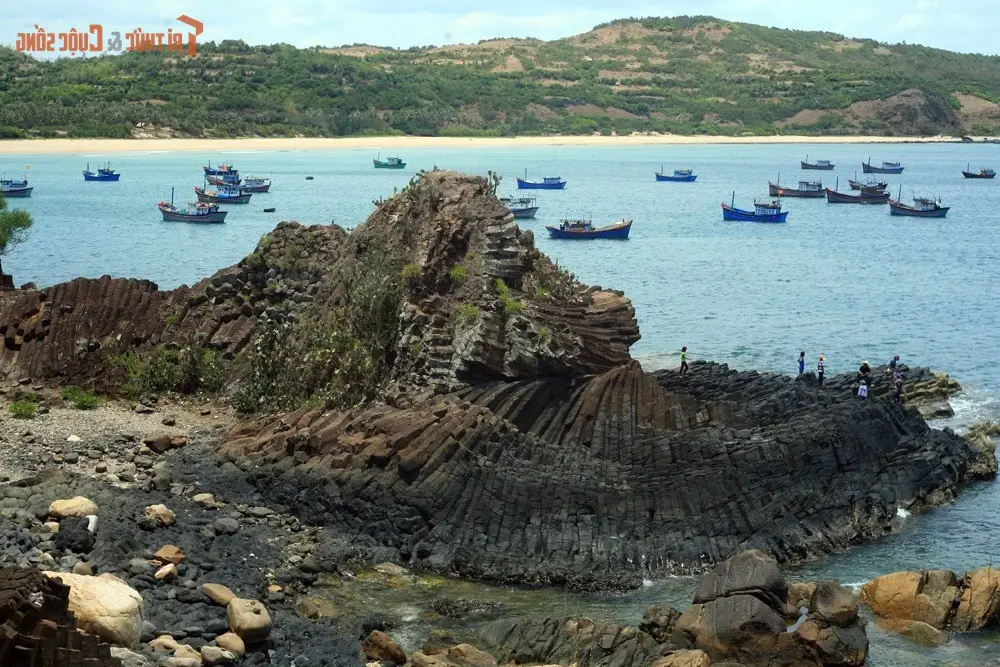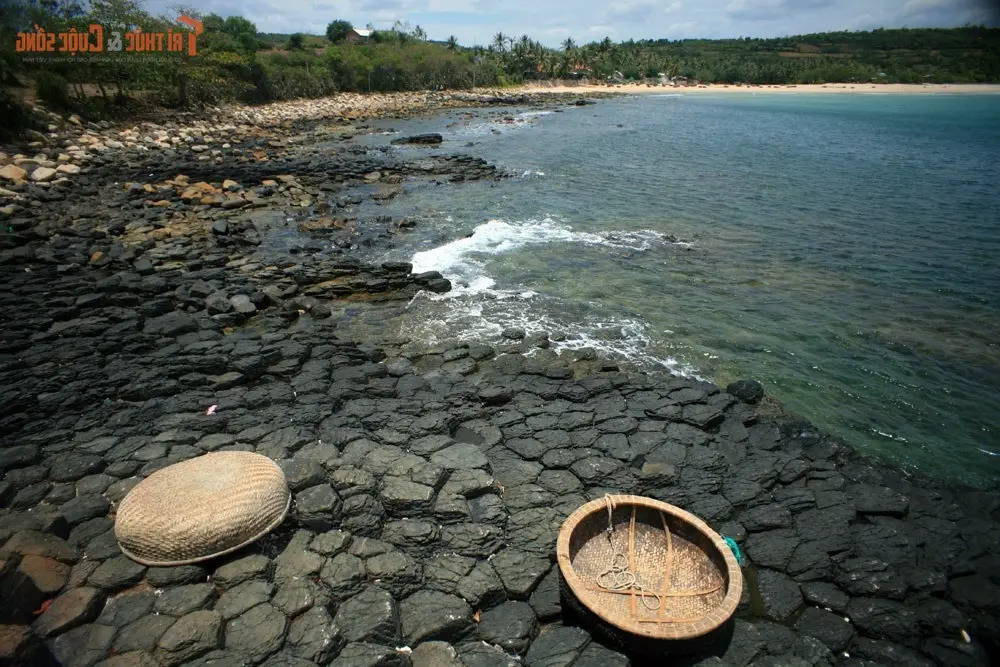 Ganh Da Dia Dak Lak emerges as a unique natural masterpiece where time and ancient volcanic activity have sculpted a rare landscape. The photograph unveils a spectacular scene featuring hexagonal basalt columns stacked meticulously along the coastline, forming a strange yet captivating stone plate beach. The emerald blue of the ocean cradles small fishing boats, adding a serene touch to the tranquil vista. In the distance, a long sandy beach stretches, backed by rolling hills veiled under a cloudy sky, all harmoniously blending into a beauty that is both wild and romantic. This truly is an exceptional natural wonder, an unmissable destination for those who love to explore the mystical allure of creation.#GanhDaDia #NaturalWonder #VolcanicLandscape #DakLakTravel #VietnamScenery