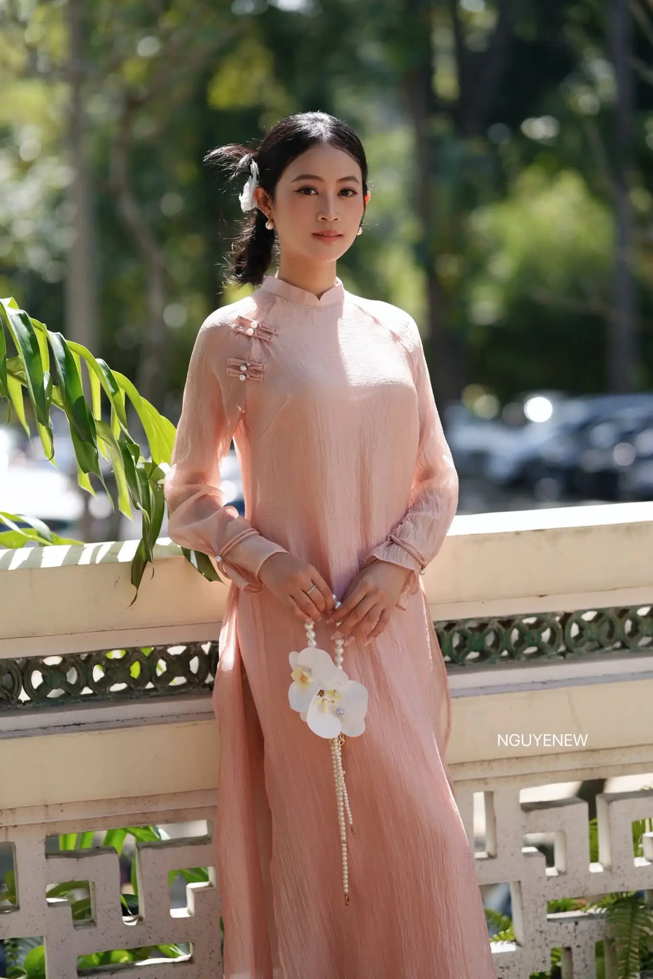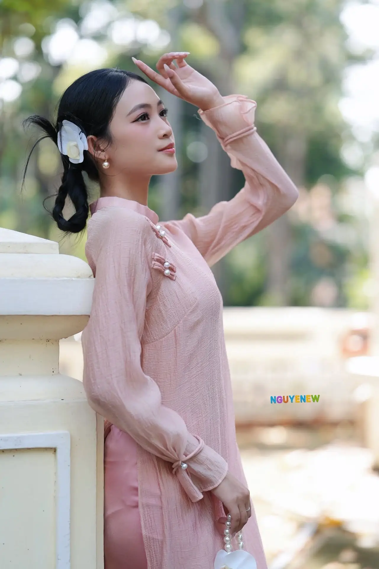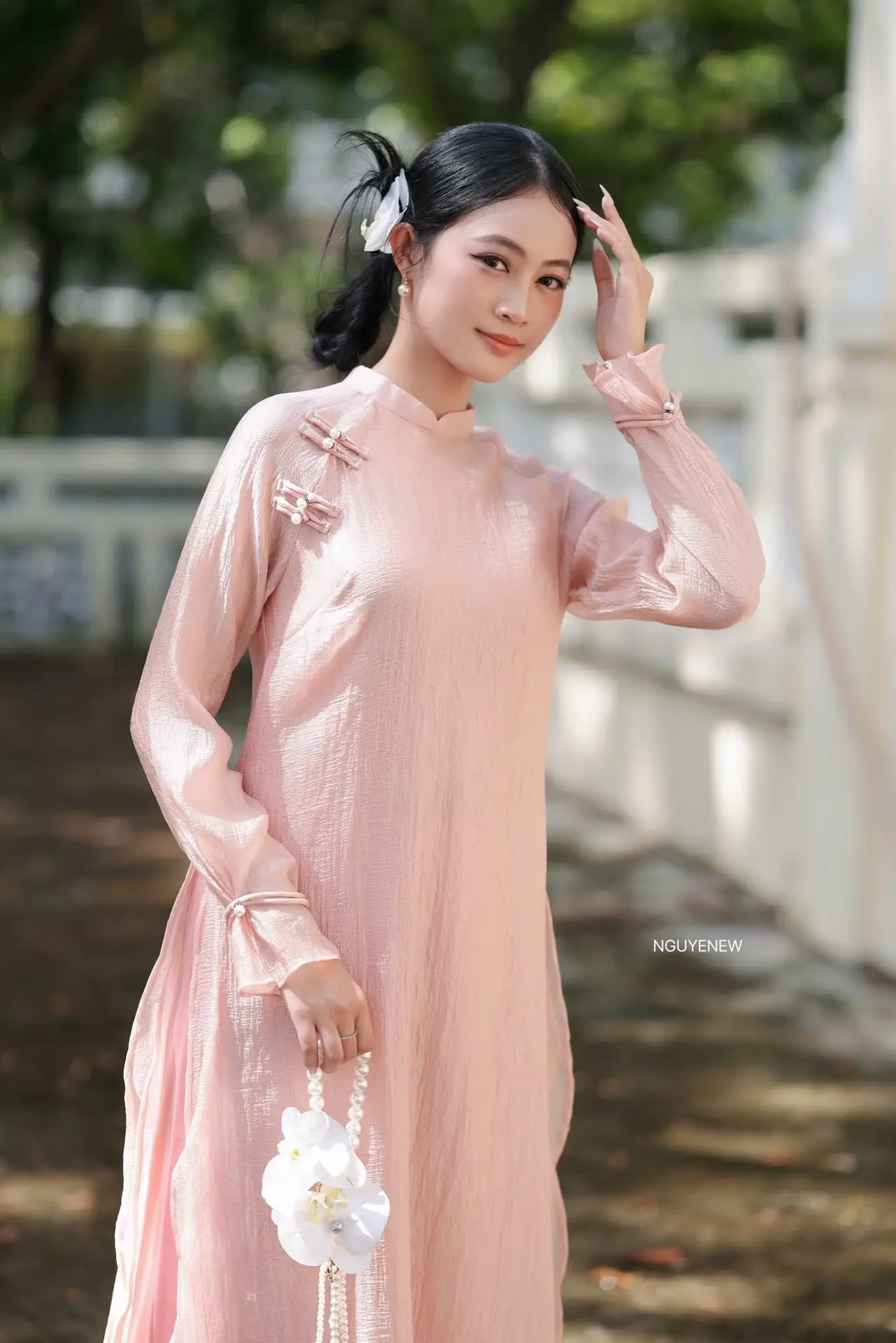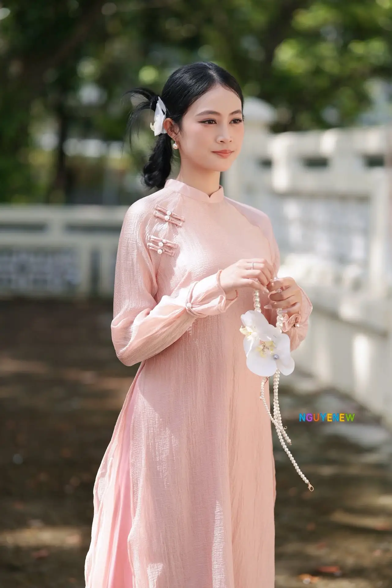 This stunning photograph captures a graceful Vietnamese young woman adorned in a delicate pink Ao Dai. She exudes an elegant and gentle beauty, characteristic of traditional East Asian charm. The Ao Dai, an iconic cultural symbol of Vietnam, is exquisitely designed, accentuating her slender figure and refined demeanor. With a white flower delicately placed in her hair and a string of pearls in her hand, she appears even more sophisticated and pure. Her subtle smile and captivating gaze seem to tell a story of serenity and timeless grace. This image is not merely a portrait but an artistic tribute celebrating the inherent beauty of Vietnamese women and their traditional national dress, the Ao Dai.#Vietnamese #AoDai #VietnameseBeauty #TraditionalDress #AoDaiGirl #VietnamCulture