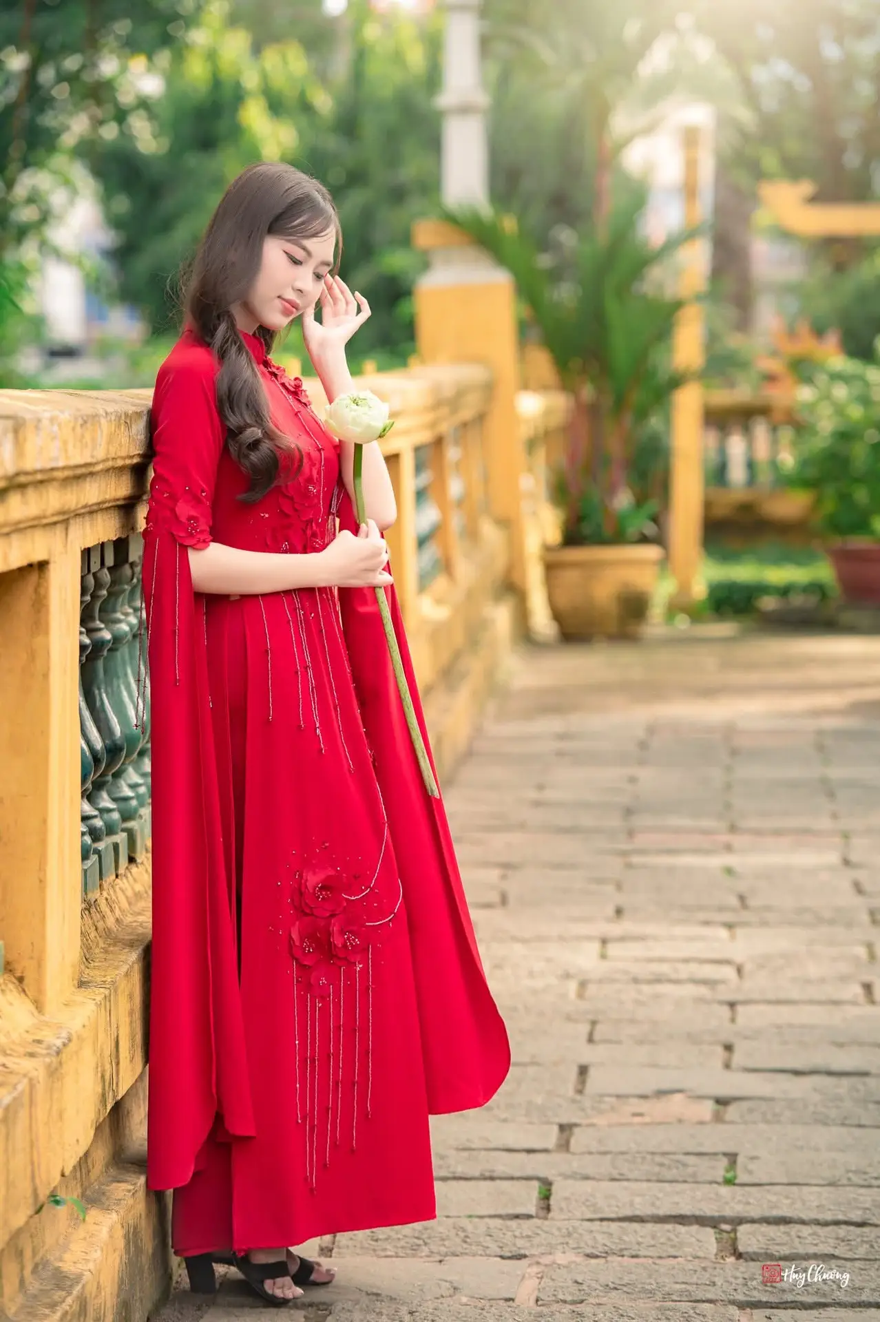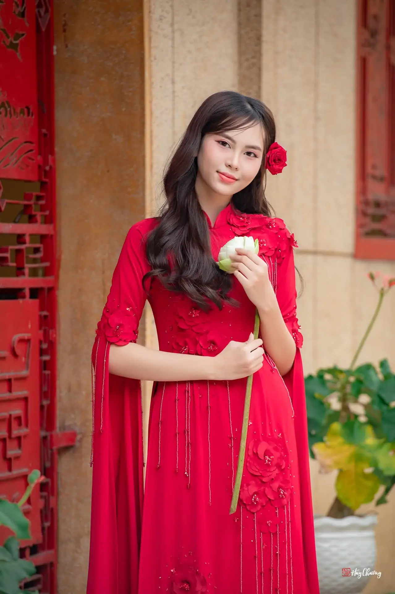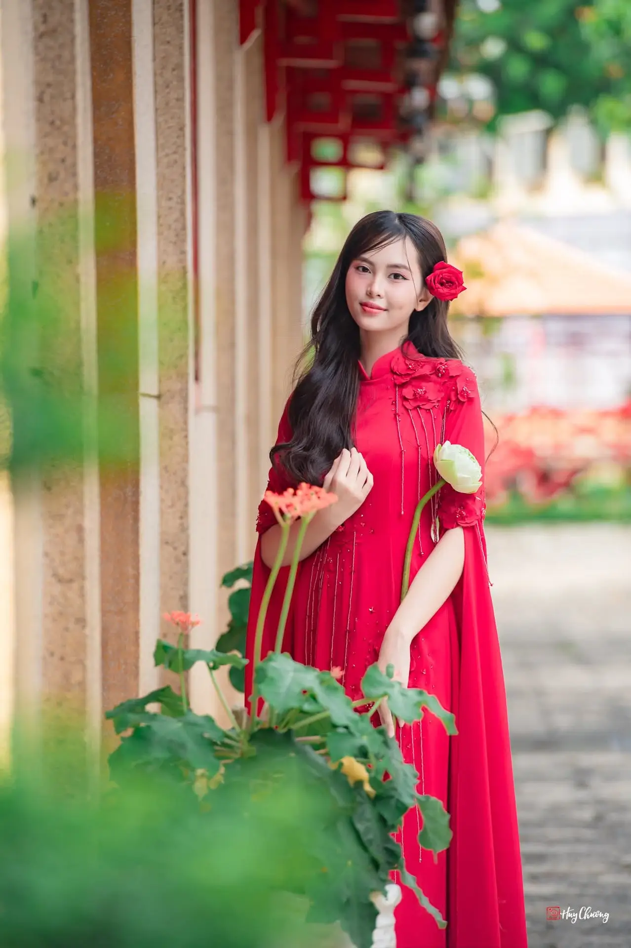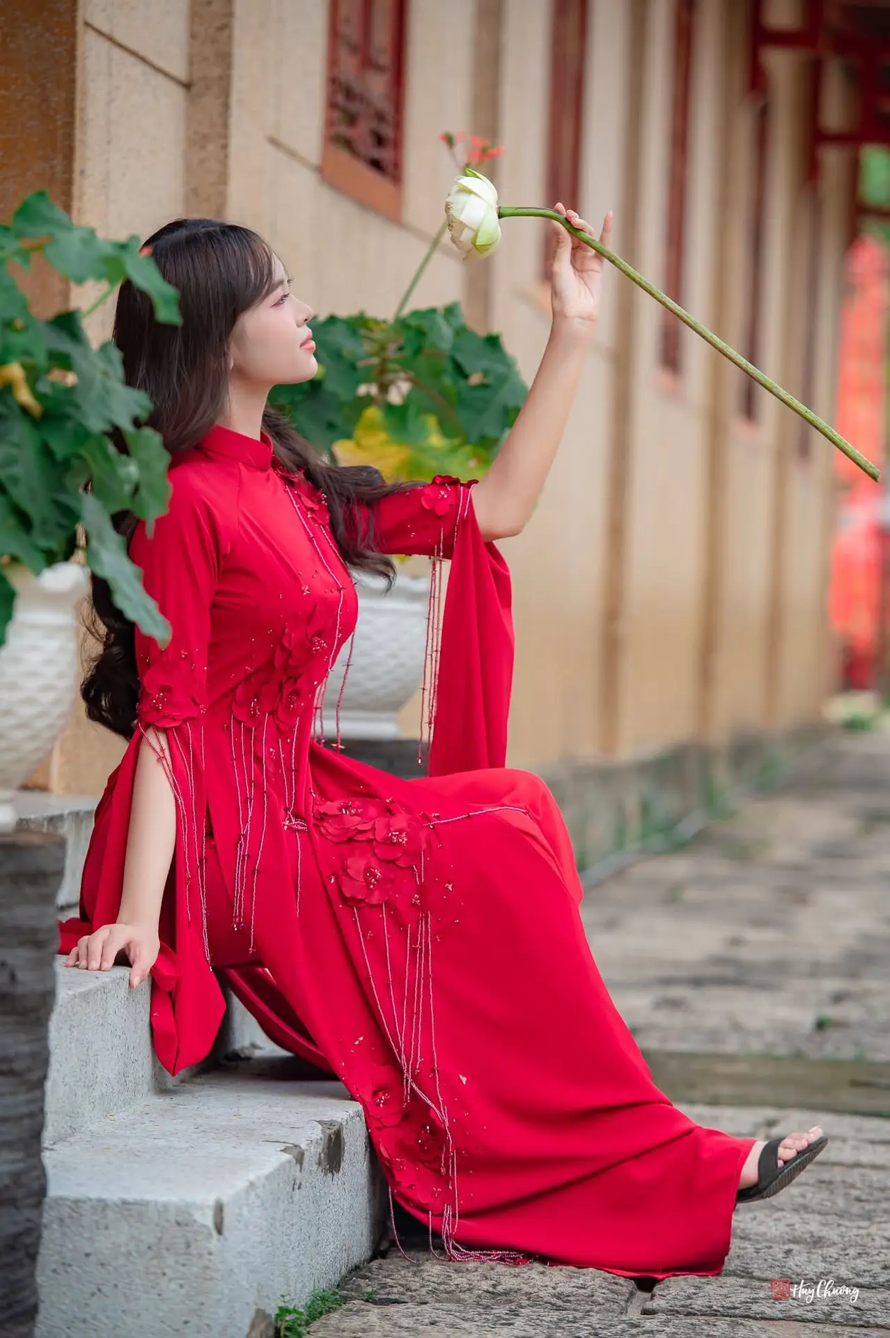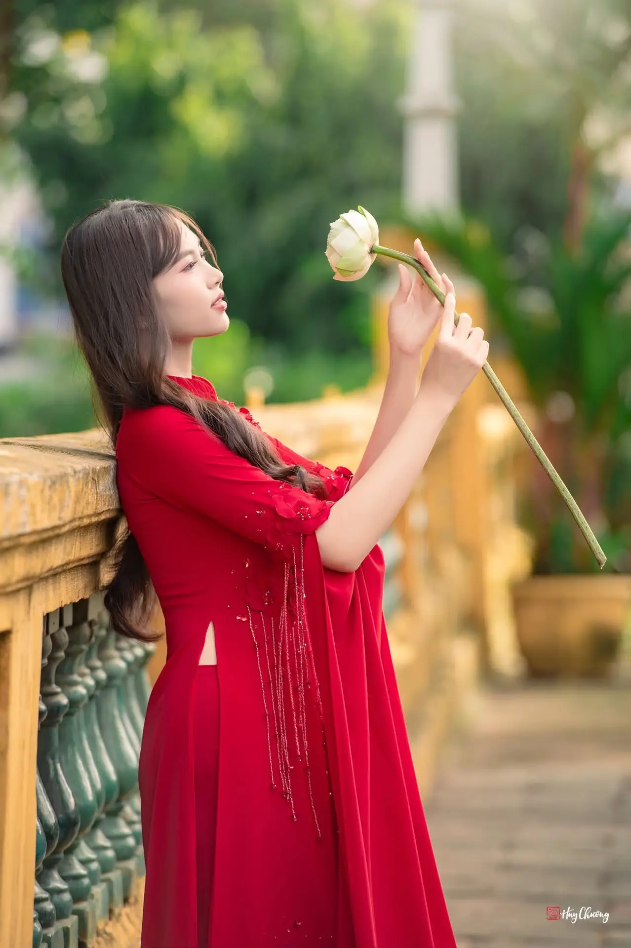 VGU No.188: Captivating Elegance: Vietnamese Beauty in Red Áo Dài with Sacred Lotus Flower.