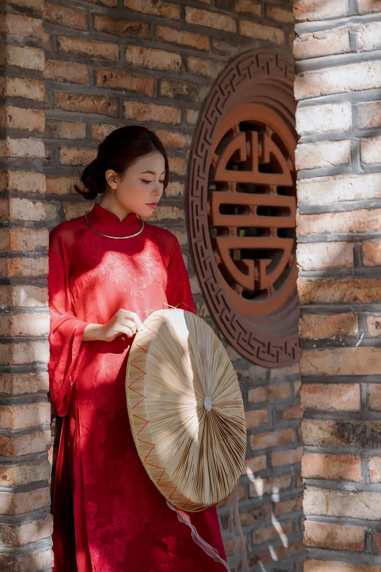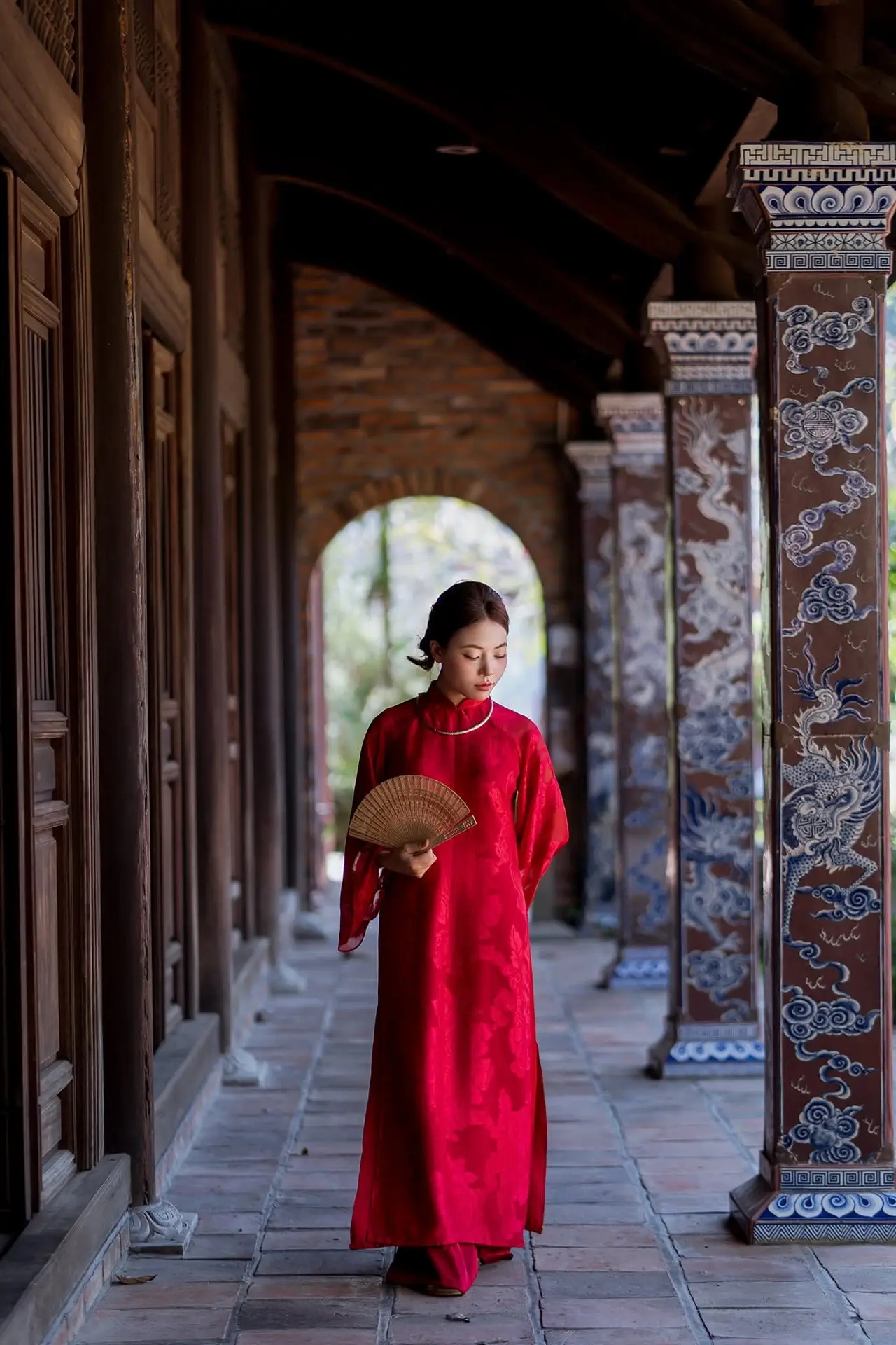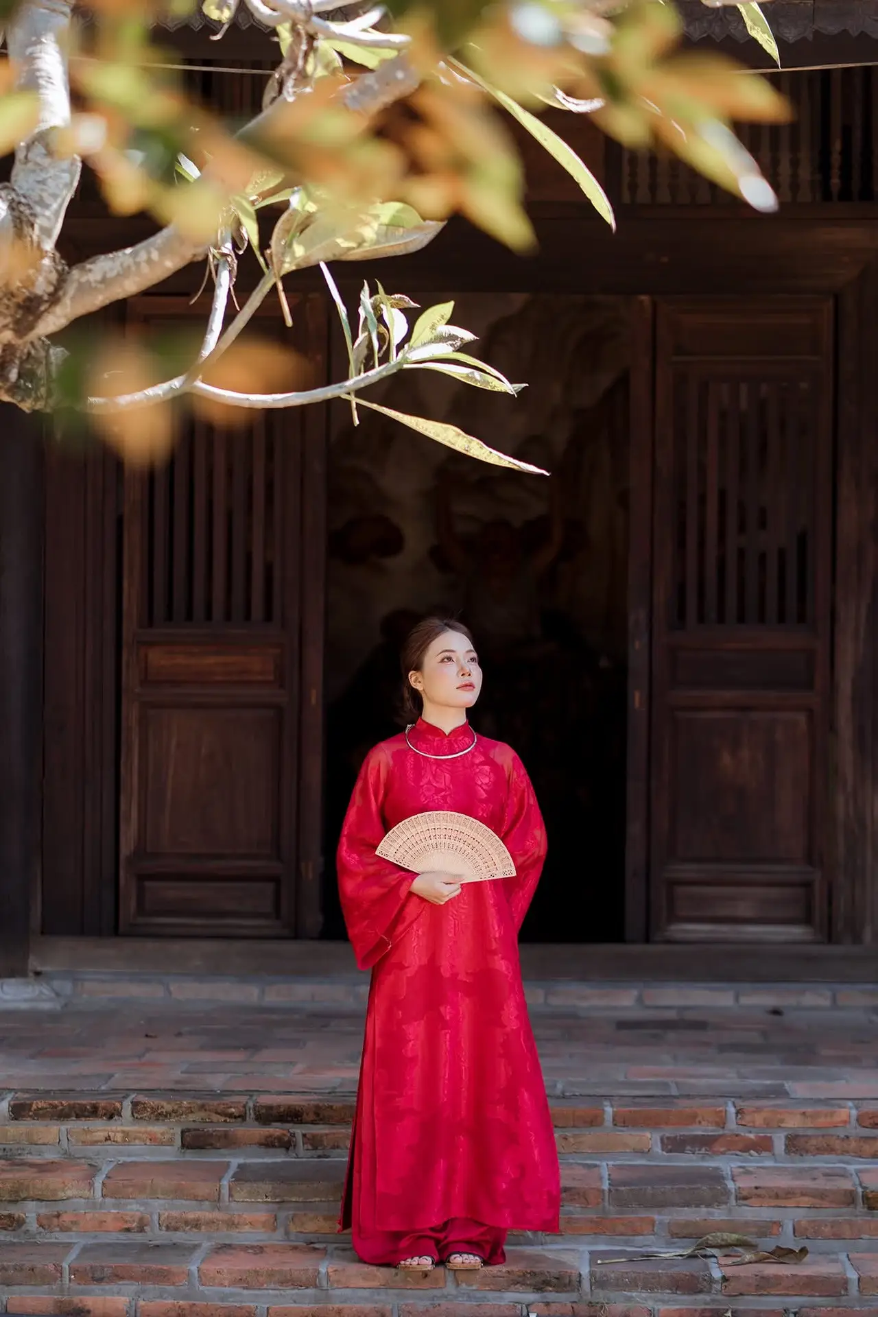 This image captures a serene moment of a graceful Vietnamese woman in a vibrant red Ao Dai. She sits calmly on a traditional wooden porch, holding a classic fan, exuding a gentle and elegant beauty. The Ao Dai is more than just an outfit; it's a profound cultural symbol of Vietnam. Traditional elements are evident through the wooden architecture and the warm golden sunlight, creating a harmonious, distinctly Asian scene. This photograph evokes nostalgia for traditional values and the graceful beauty of Vietnamese women, showcasing a connection between past and present. It is a timeless and captivating beauty.#Vietnamese #AoDai #TraditionalBeauty #VietnameseWoman #VietnamCulture #AsianElegance