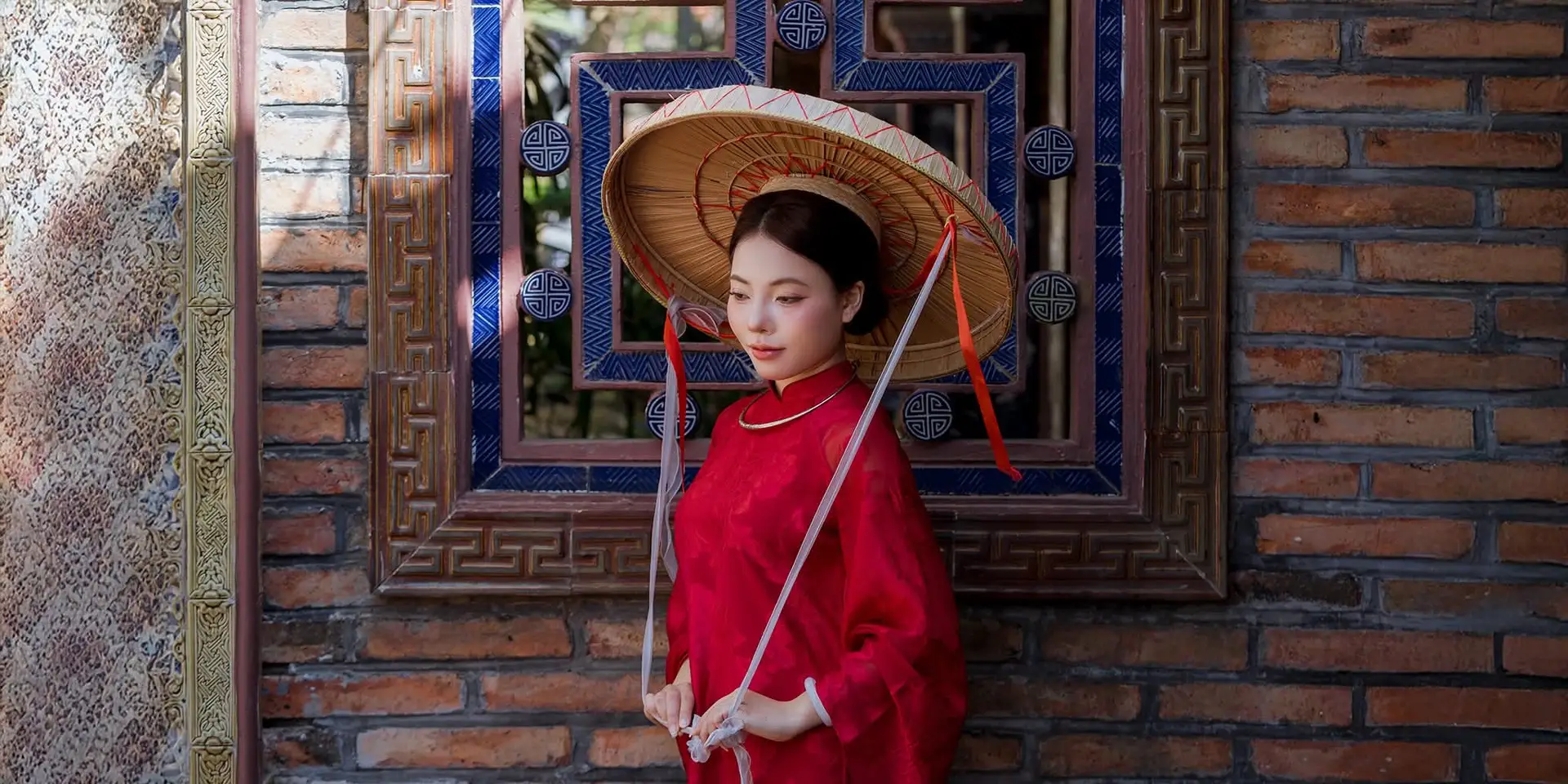 Timeless Elegance: Vietnamese Woman in Traditional Ao Dai Amidst Serene Backdrop