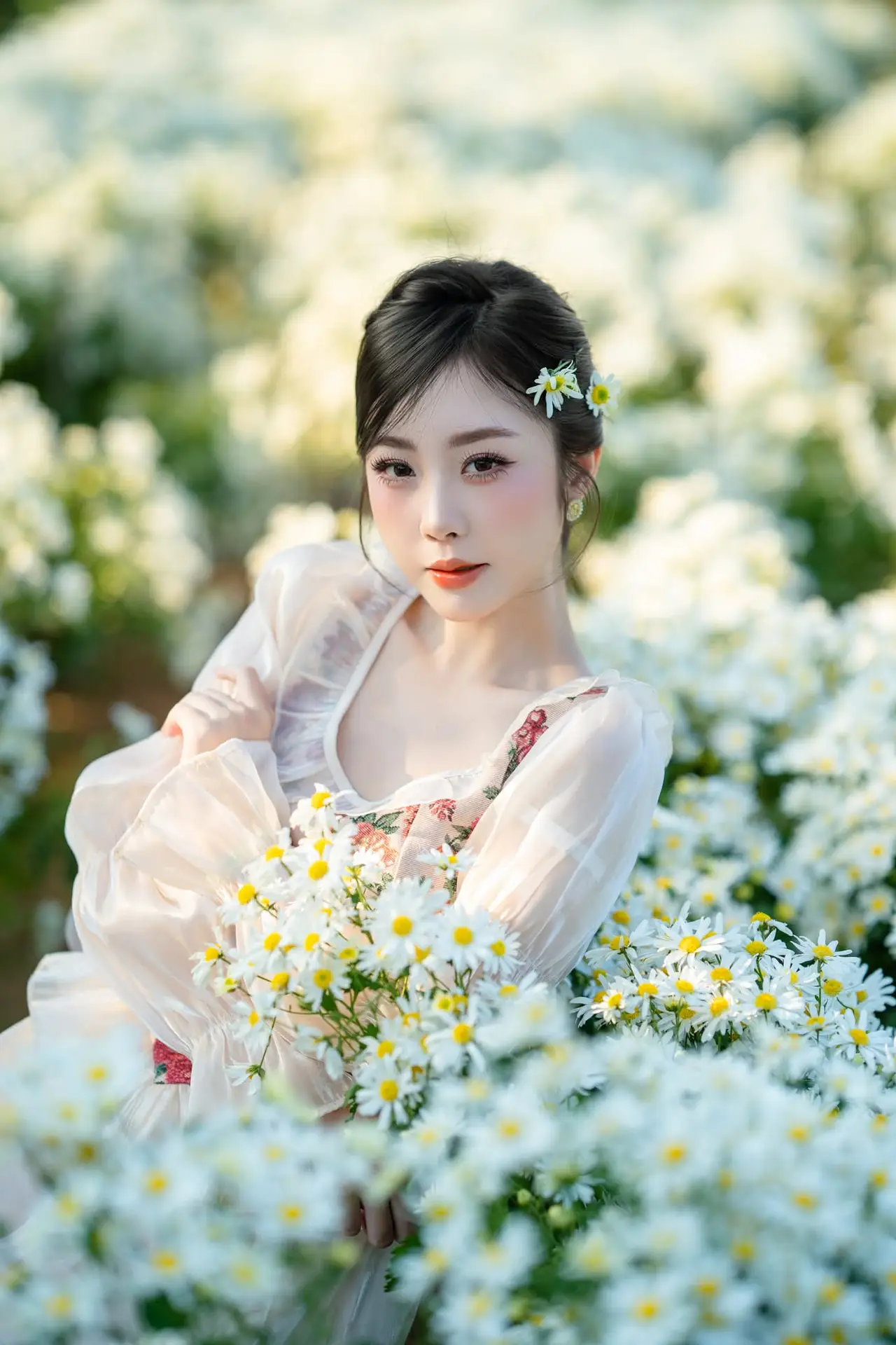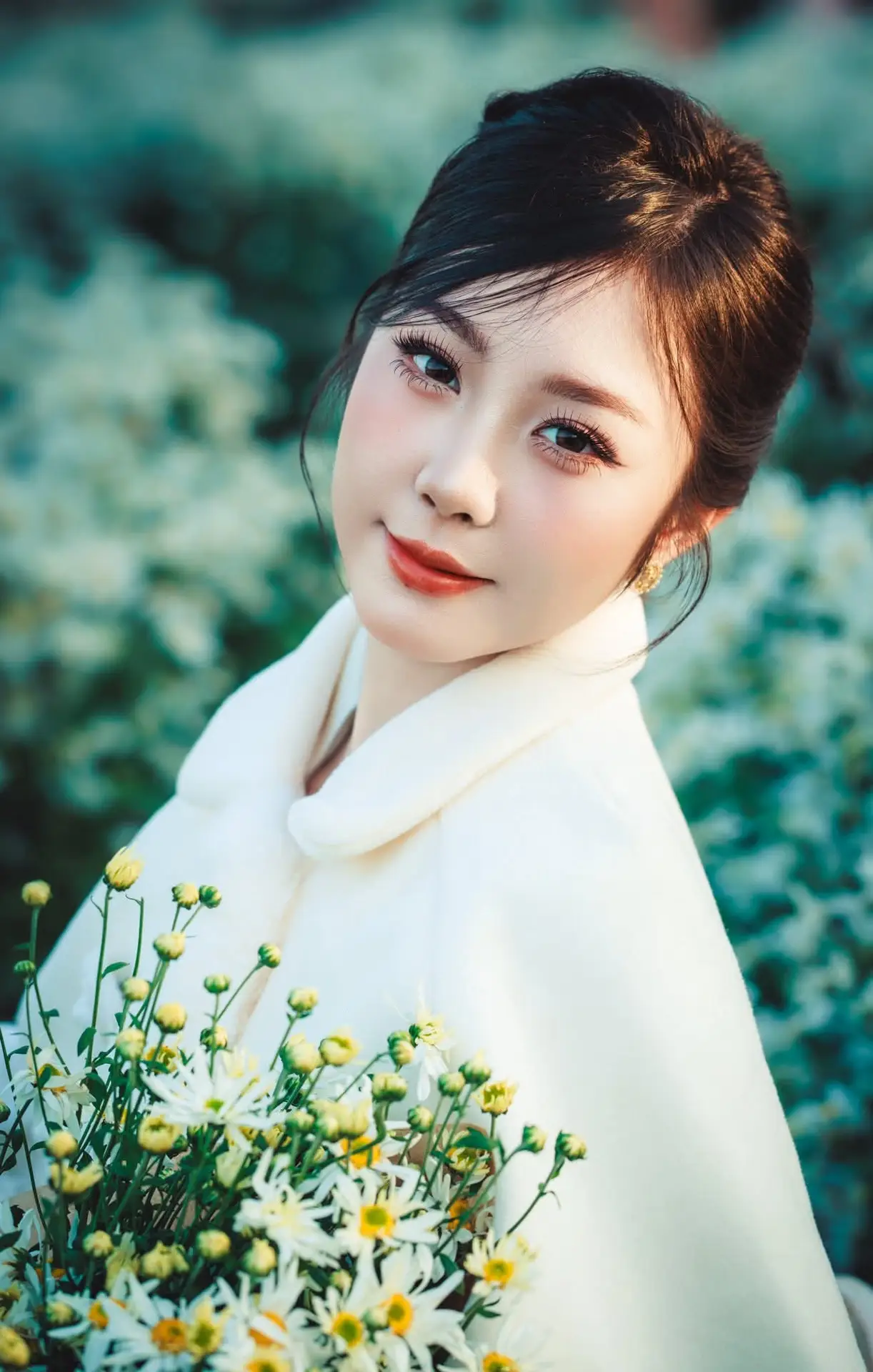 #VietnameseGirl #WhiteDaisies #YouthfulBeauty #NaturePortrait #WinterStyle