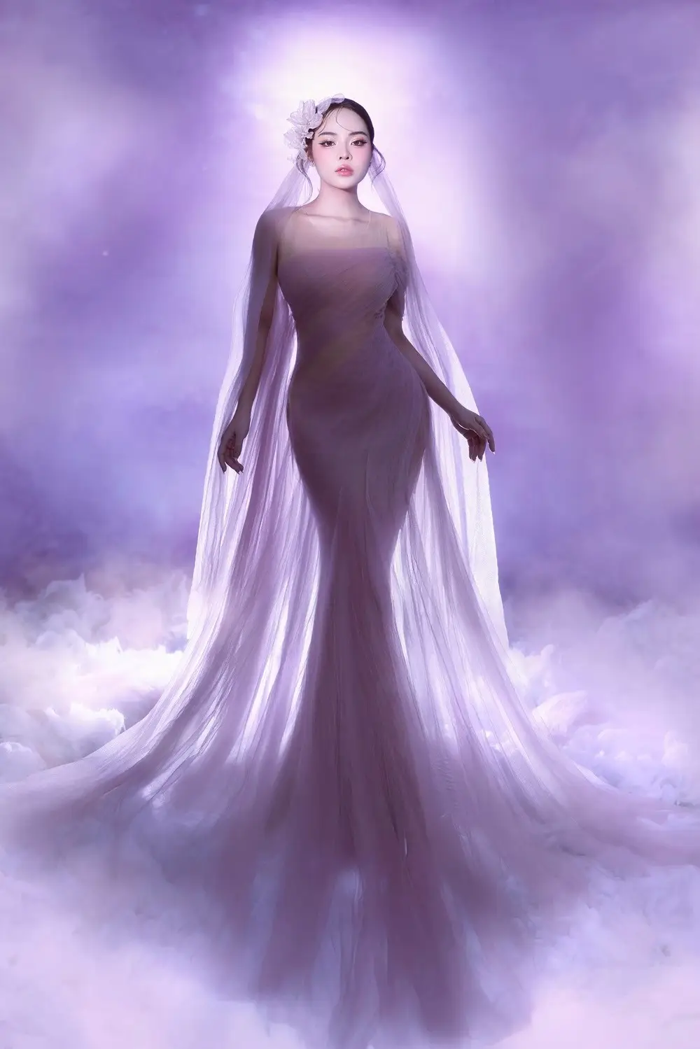 This stunning photograph captures singer Mai Diệu Ly in a dreamy and poetic setting. She appears like an ethereal muse, adorned in a flowing purple gown reminiscent of clouds, her hair embellished with delicate accessories, gazing upwards with a contemplative and awakened expression. This image perfectly embodies the message of a full and profound life that she conveys in her new album titled 'A Lifetime to Remember'. This is Mai Diệu Ly's second music project of the year promising to deliver deeply emotional Ballad tracks that will touch listeners' hearts. Her mystical beauty and serene demeanor in the picture will surely pique audience curiosity to explore this heartfelt album further.