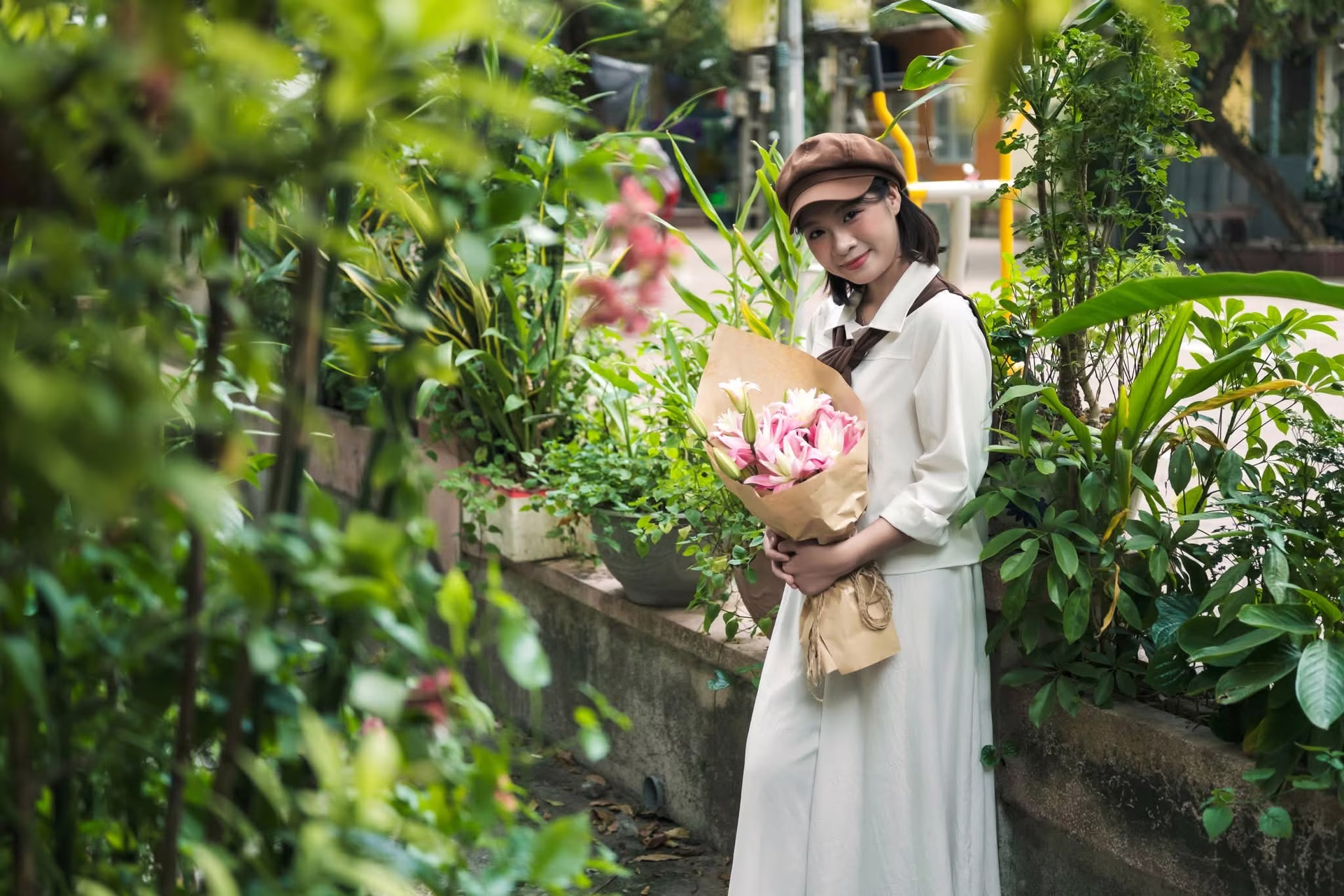 In this enchanting photograph, a young woman with an elegant beauty stands out amidst a picturesque flower garden. She wears a delicate cream-colored vintage dress with romantic puffed sleeves, evoking a captivating classic style. Her pristine white gloves and the small cherished bouquet further enhance her gentle and graceful demeanor. Soft sunlight filters through the leaves illuminating each blooming rose petal and the lush green lawn creating an ideal setting for an outdoor photoshoot. This image not only celebrates natural beauty but also exudes peace and romance transporting viewers into a world full of dreams and nostalgia.
