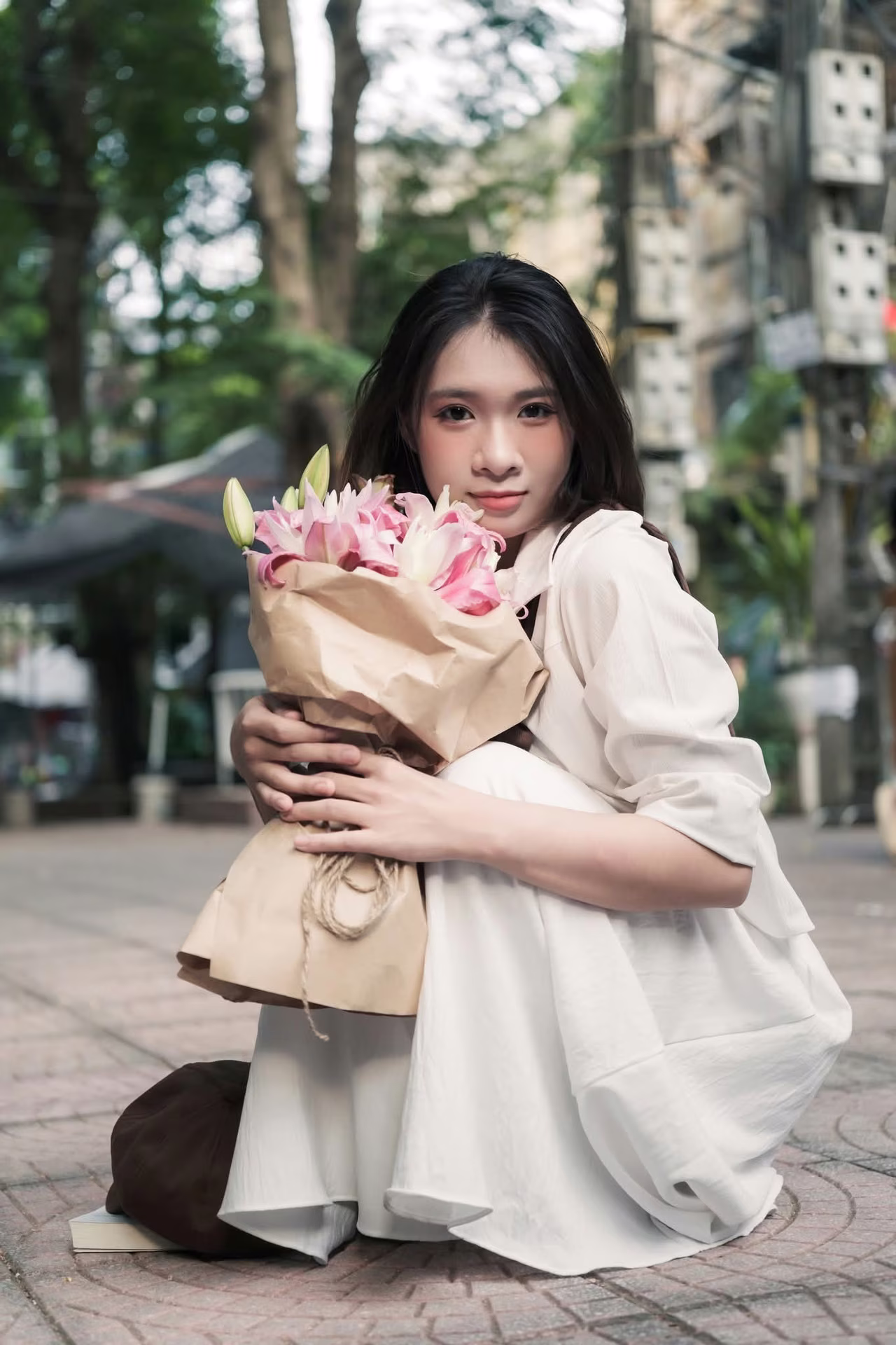VGU No.56: The nostalgic beauty of a Vietnamese girl with gentle flowers, a dreamy and emotional gaze