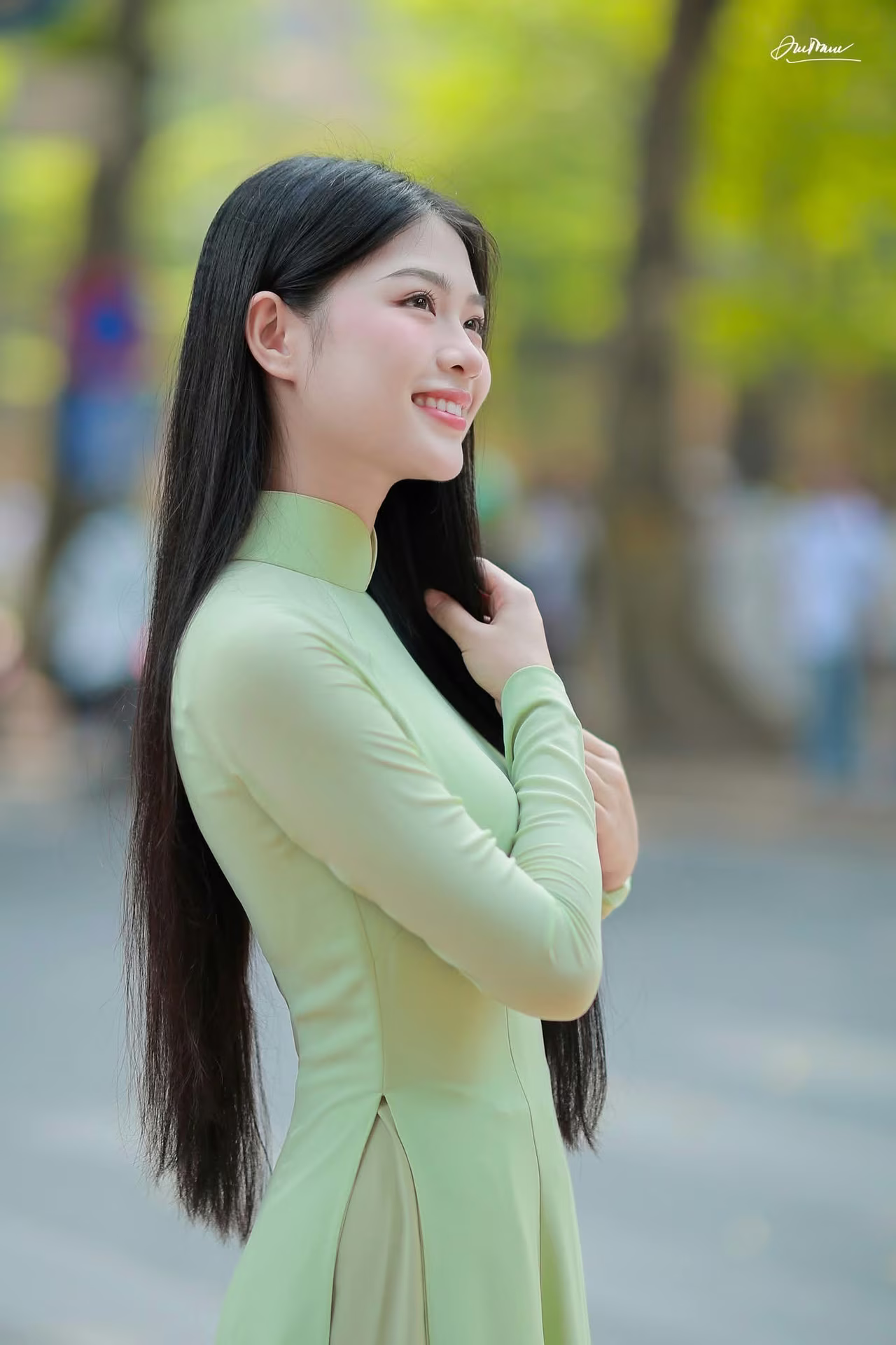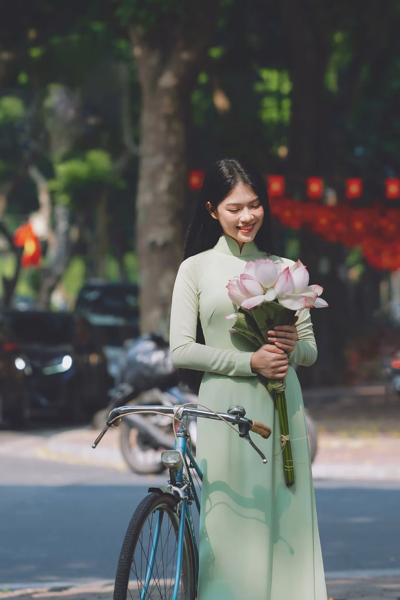 This image XVG No48 captures a beautiful moment of a Vietnamese girl in a gentle light green Ao Dai. Her radiant smile blends with traditional beauty creating a captivating and serene image. Standing beside a vintage bicycle adorned with colorful fresh flowers the girl exudes elegance and the distinctive grace of Vietnamese women. The tree-lined street with vibrant red lanterns in the distance evokes a nostalgic and poetic atmosphere. This is a perfect fusion of human beauty natural scenery and the unique cultural essence of Vietnam. The photograph is not just a mere moment but a story of tranquility eternal beauty and the Vietnamese soul.