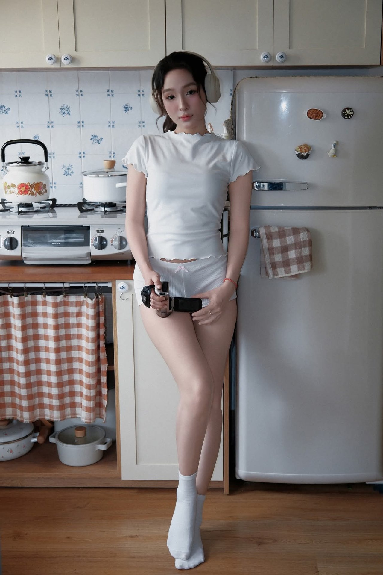 This image captures a serene moment of a young woman unwinding at home. Sitting comfortably on the warm wooden floor in a familiar kitchen setting, she is immersed in her world of music through headphones. Her simple, comfortable attire of a white t-shirt, shorts, and socks highlights her natural beauty and relaxed state. In the background, a vintage refrigerator and a tidy kitchen space create a cozy, inviting atmosphere, reflecting a comfortable home lifestyle. This scene evokes a feeling of tranquility, enjoying private moments away from life's hustle and bustle. It's an ideal depiction of recharging, listening to oneself, and finding peace within the comfort of one's own home.Vintage Ao Dai Beauty: Elegant Vietnamese Woman with Flowers in a Nostalgic Setting