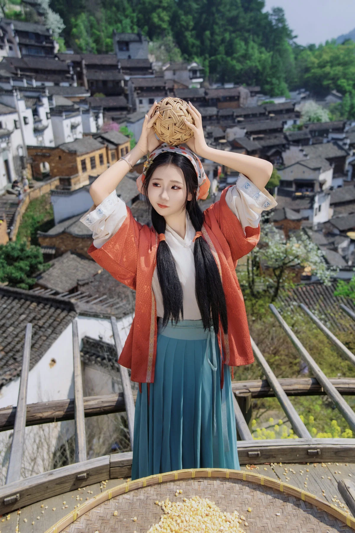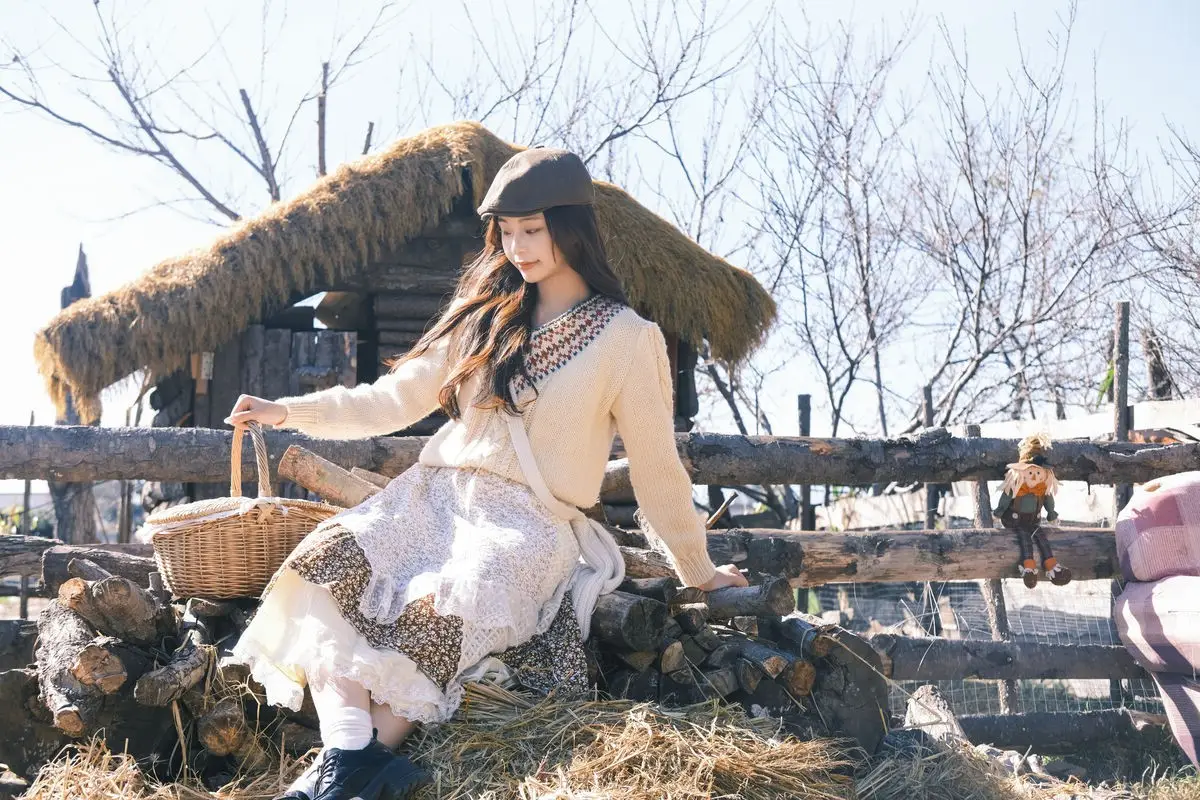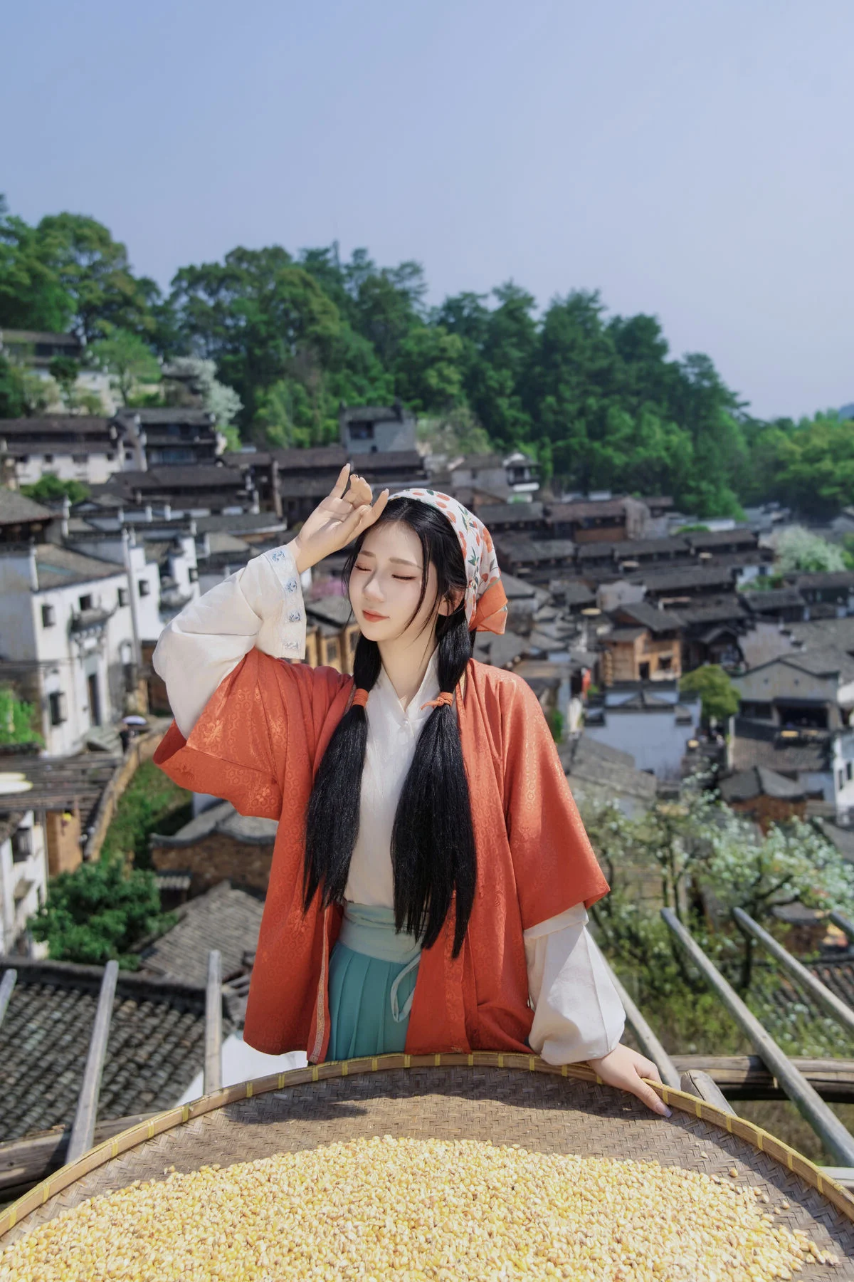 This collection captures a serene moment that feels like a scene from a classic cinematic masterpiece. Gao Yu Qin radiates a pure and gentle aura, her soft gaze meeting the lens amidst a vibrant field of yellow blossoms. Her outfit is a masterful blend of traditional aesthetics and rustic charm, featuring a warm terracotta outer layer paired with a graceful blue skirt. The addition of a delicate floral headscarf adds a touch of vintage elegance, highlighting her youthful and ethereal features. The choice of natural fabrics and a muted yet rich color palette evokes a sense of timeless beauty and a deep connection to nature. Set against the backdrop of weathered stone walls and soft morning light, the visual composition creates a poetic atmosphere that is both nostalgic and refreshing. It is a beautiful tribute to pastoral life and the enduring grace of heritage-inspired fashion, perfect for those seeking artistic inspiration and a peaceful escape into the countryside charm.