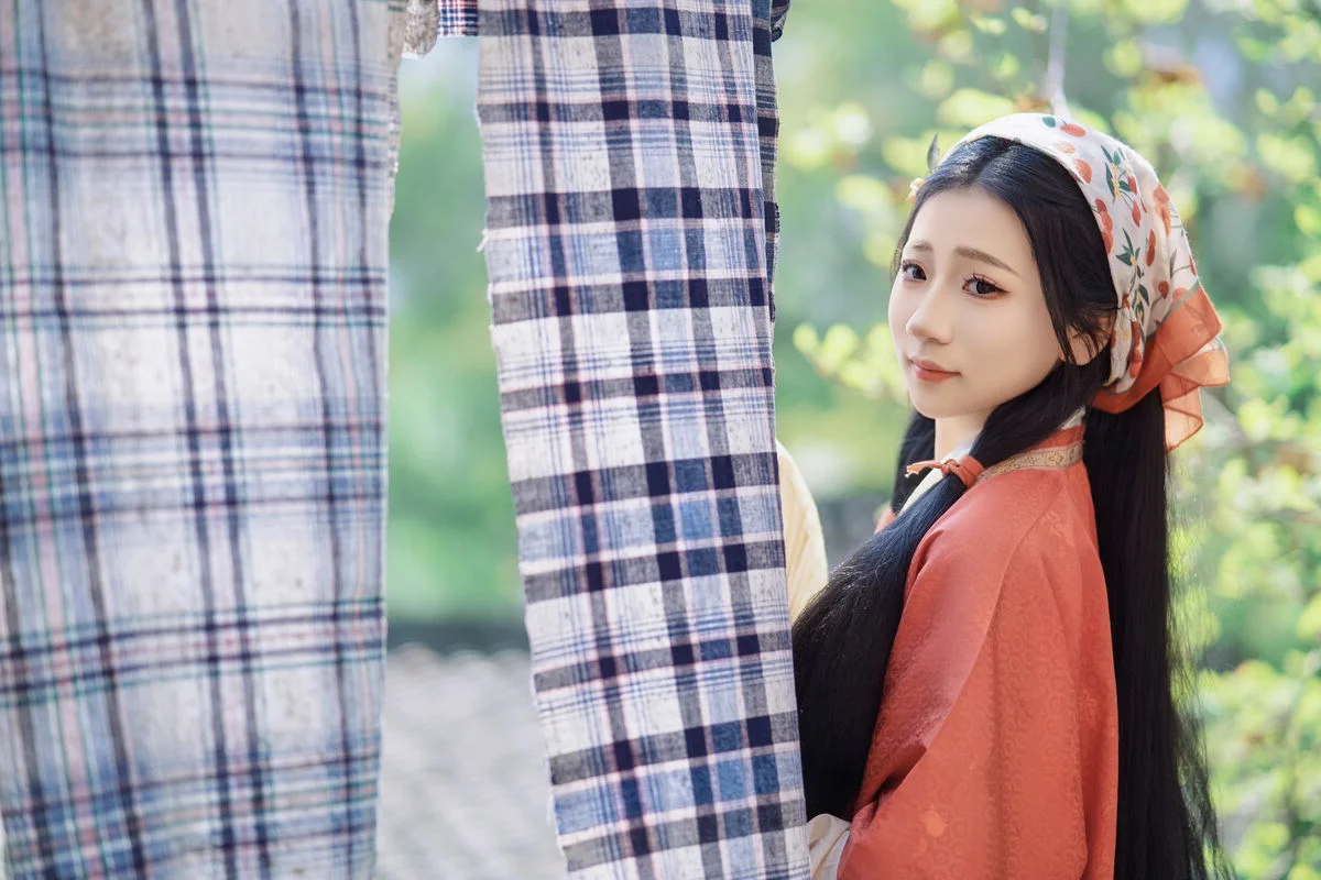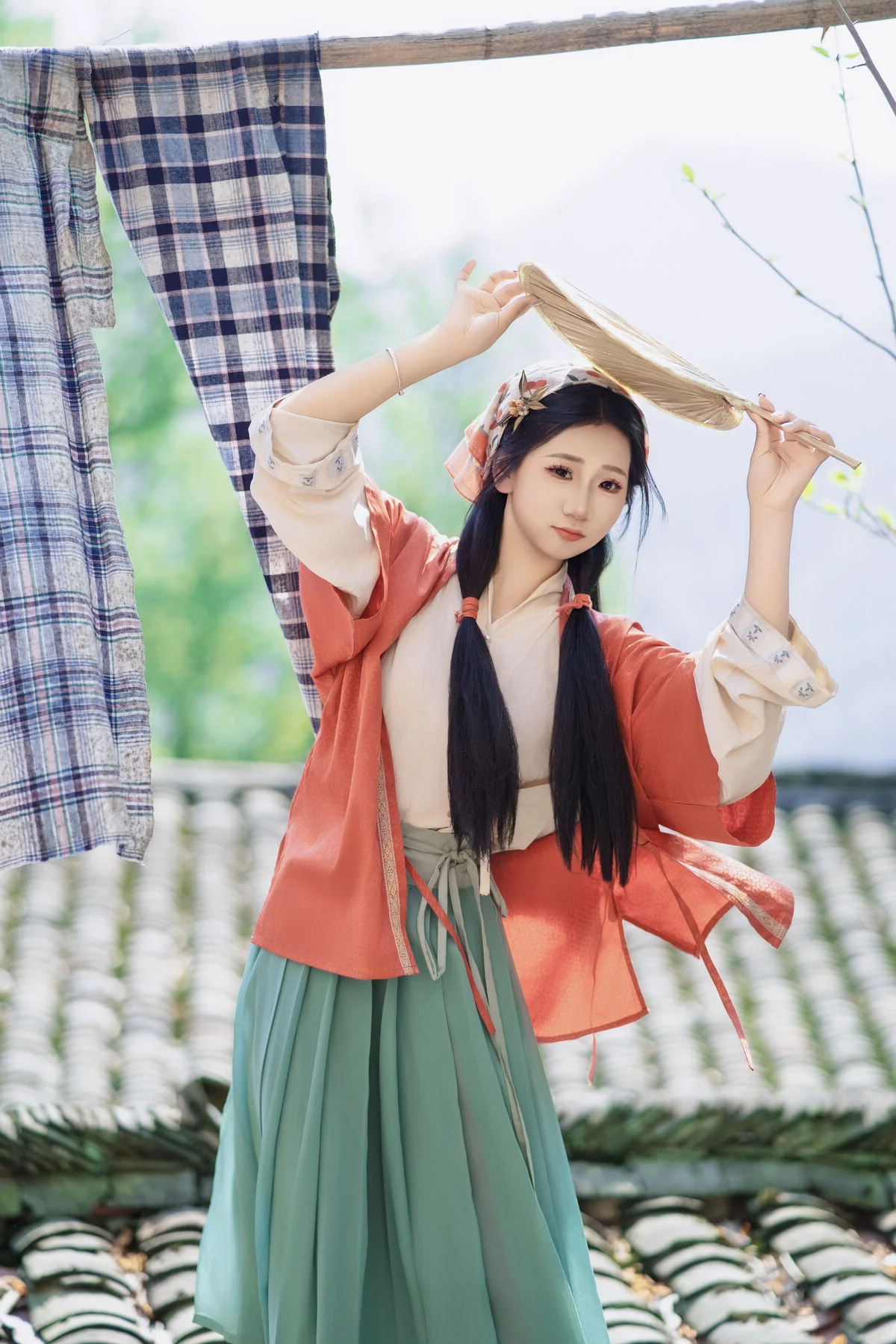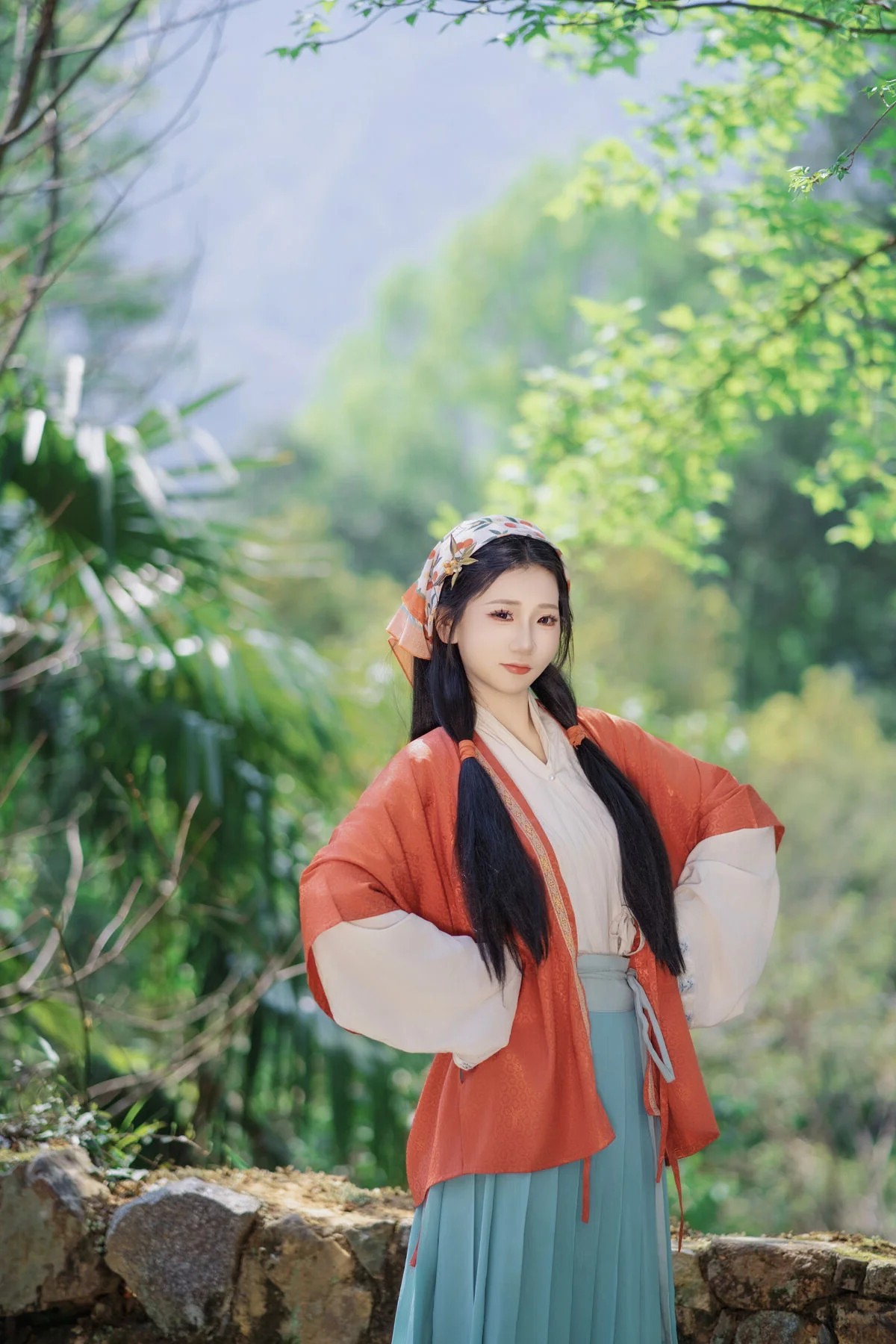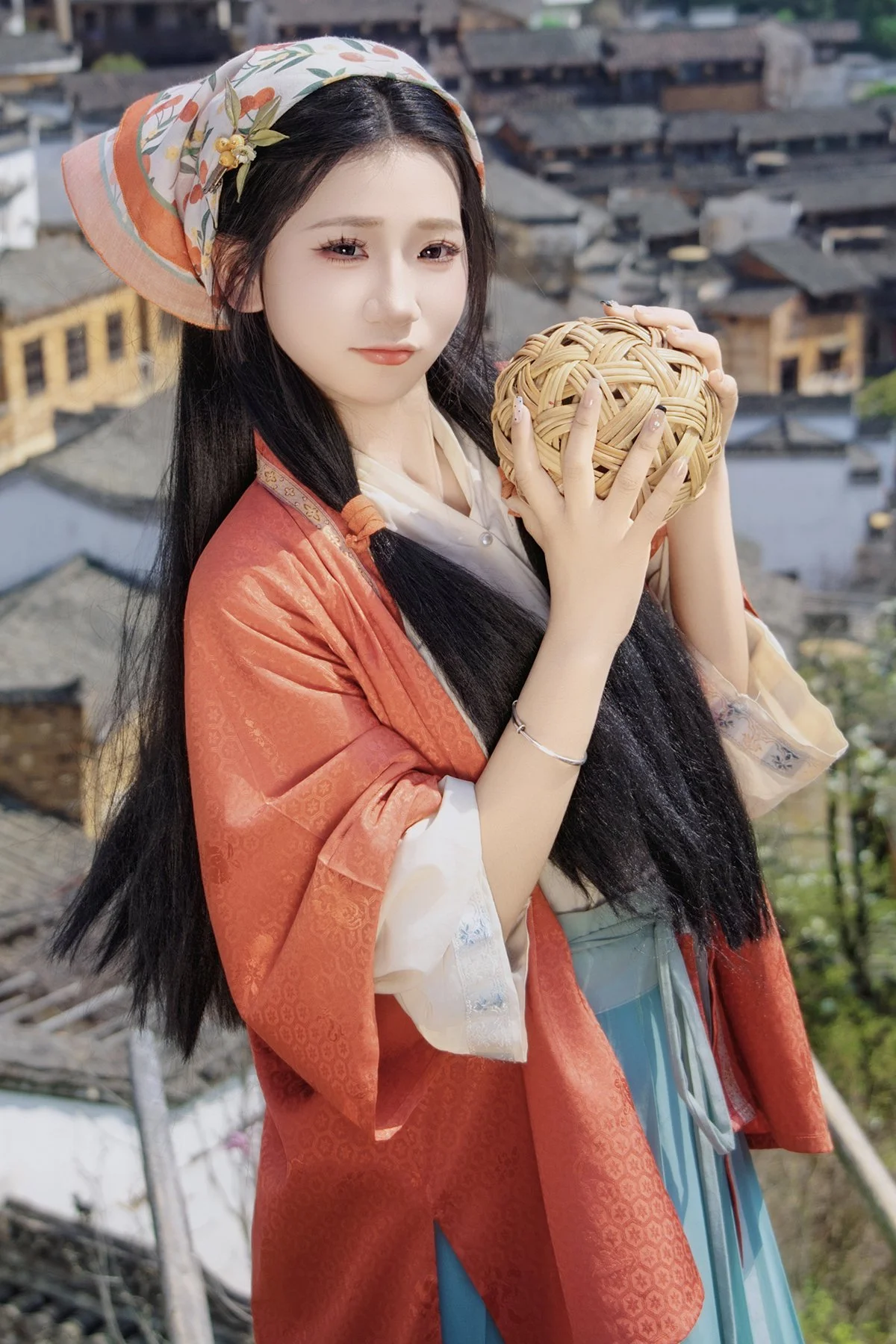 This collection captures a serene moment that feels like a scene from a classic cinematic masterpiece. Gao Yu Qin radiates a pure and gentle aura, her soft gaze meeting the lens amidst a vibrant field of yellow blossoms. Her outfit is a masterful blend of traditional aesthetics and rustic charm, featuring a warm terracotta outer layer paired with a graceful blue skirt. The addition of a delicate floral headscarf adds a touch of vintage elegance, highlighting her youthful and ethereal features. The choice of natural fabrics and a muted yet rich color palette evokes a sense of timeless beauty and a deep connection to nature. Set against the backdrop of weathered stone walls and soft morning light, the visual composition creates a poetic atmosphere that is both nostalgic and refreshing. It is a beautiful tribute to pastoral life and the enduring grace of heritage-inspired fashion, perfect for those seeking artistic inspiration and a peaceful escape into the countryside charm.