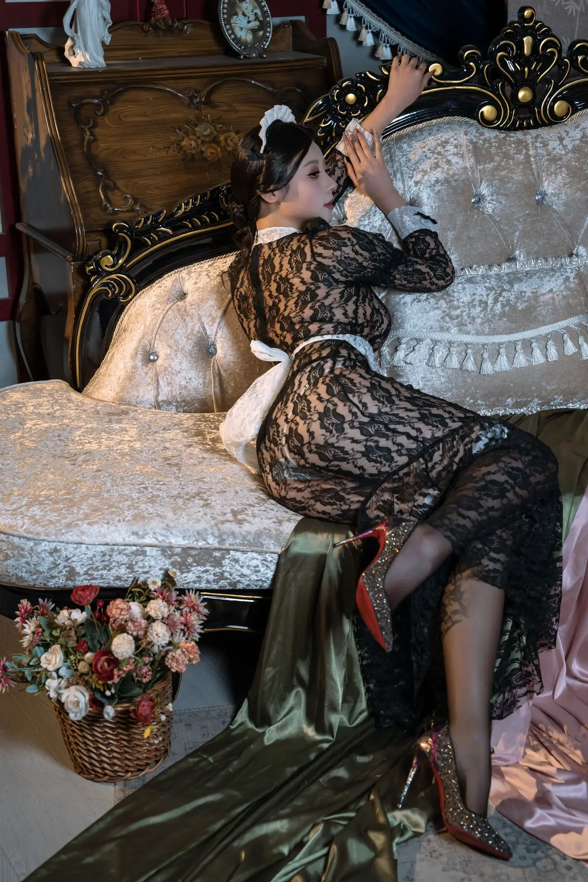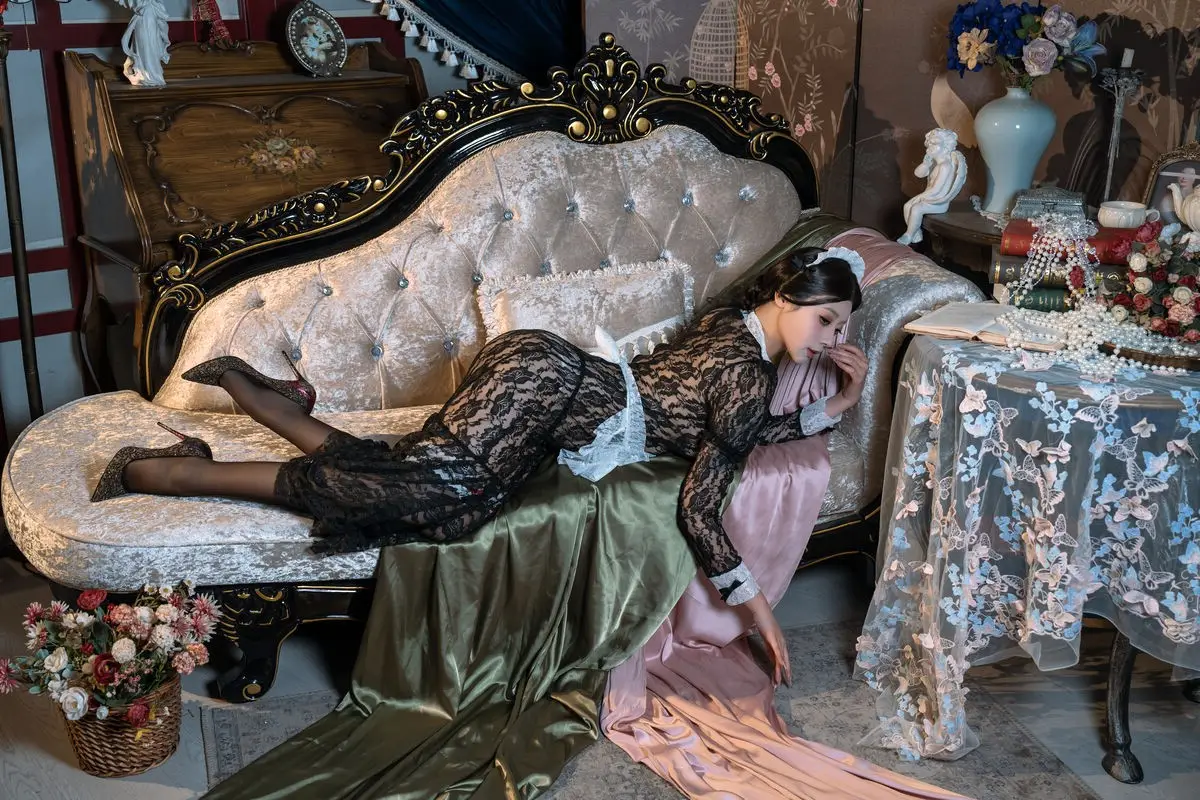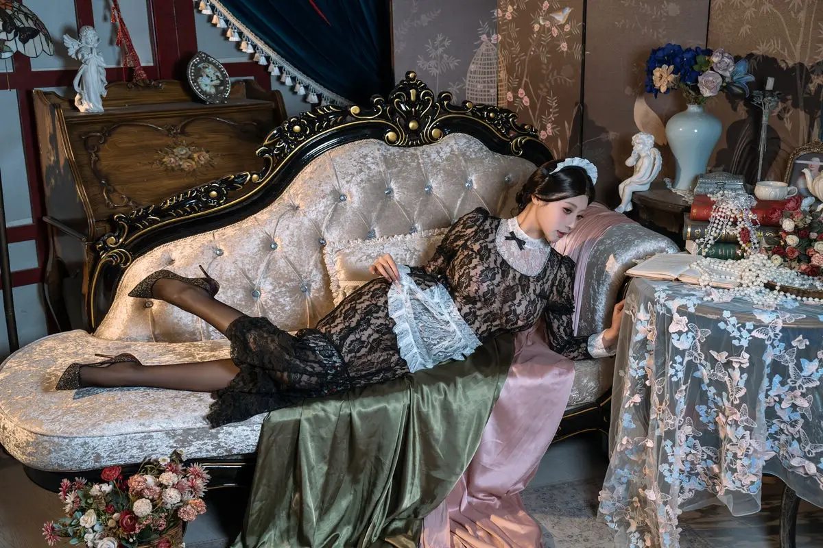 Step into an enchanting world with Coser Yunx1x1 elegantly portraying a classic maid in a sophisticated ensemble. This captivating image reveals a graceful and contemplative beauty amidst a luxurious vintage interior evoking romantic tales of old. Yunx1x1 exudes an air of refined elegance with every delicate gesture perfectly harmonizing with the opulent classical setting. From the intricate black lace dress to the pristine white apron every detail is meticulously crafted creating a mesmerizing and alluring visual narrative. Discover this emotionally rich artistic moment.