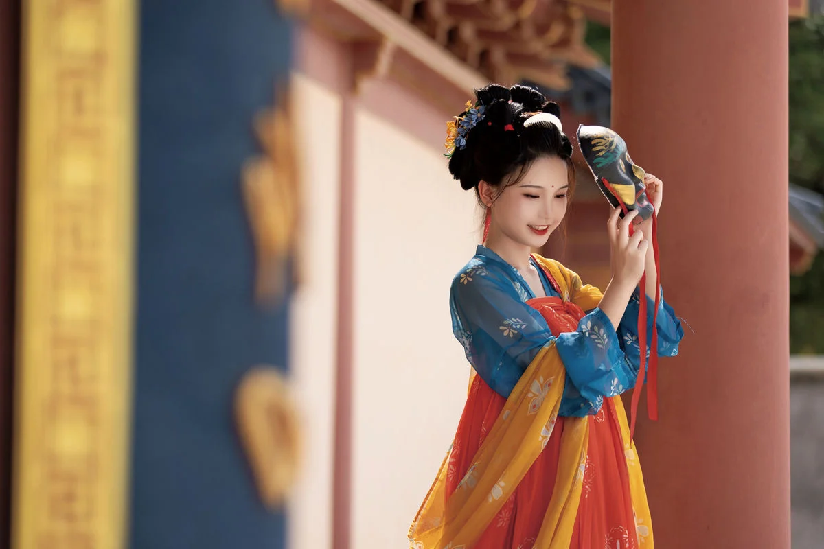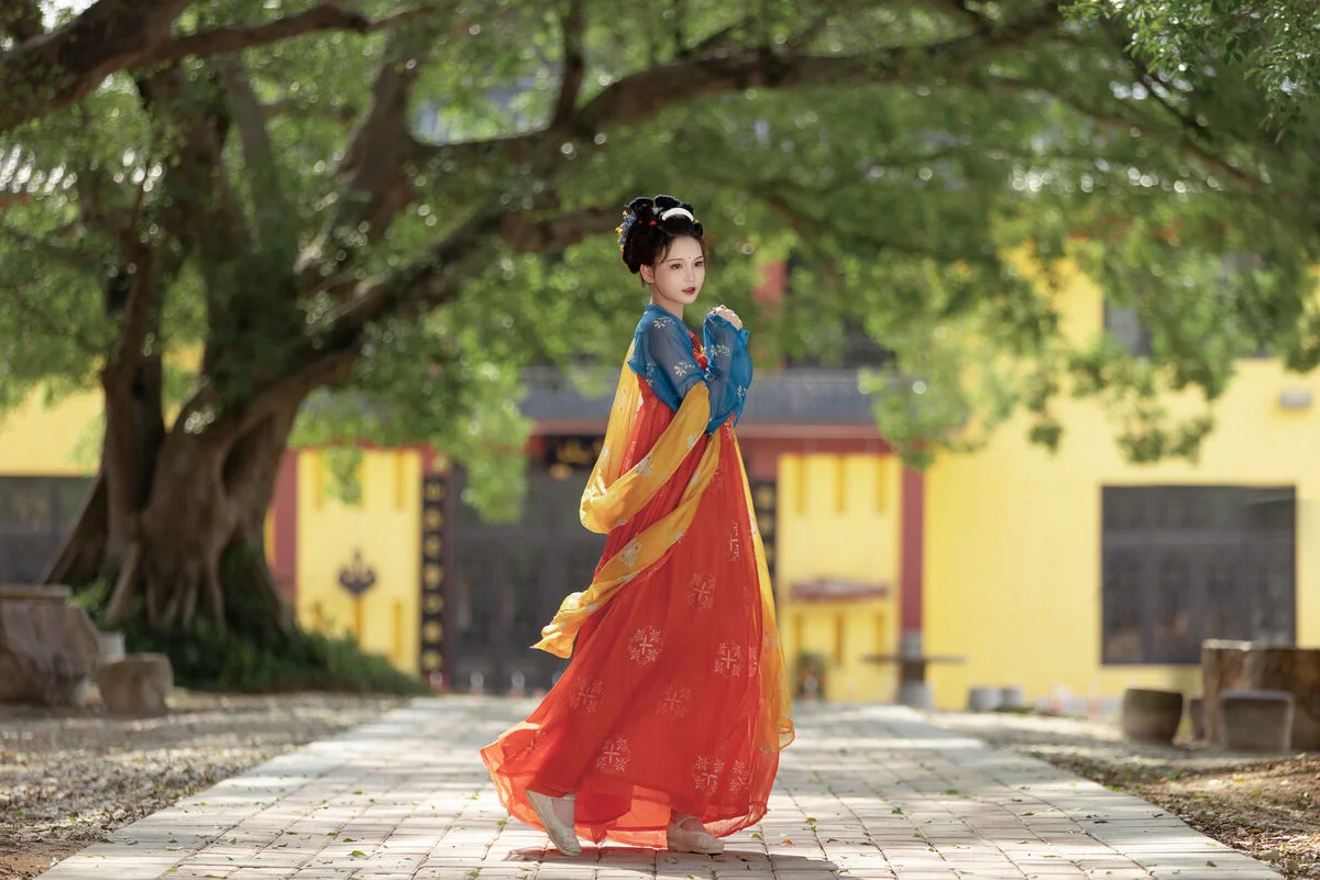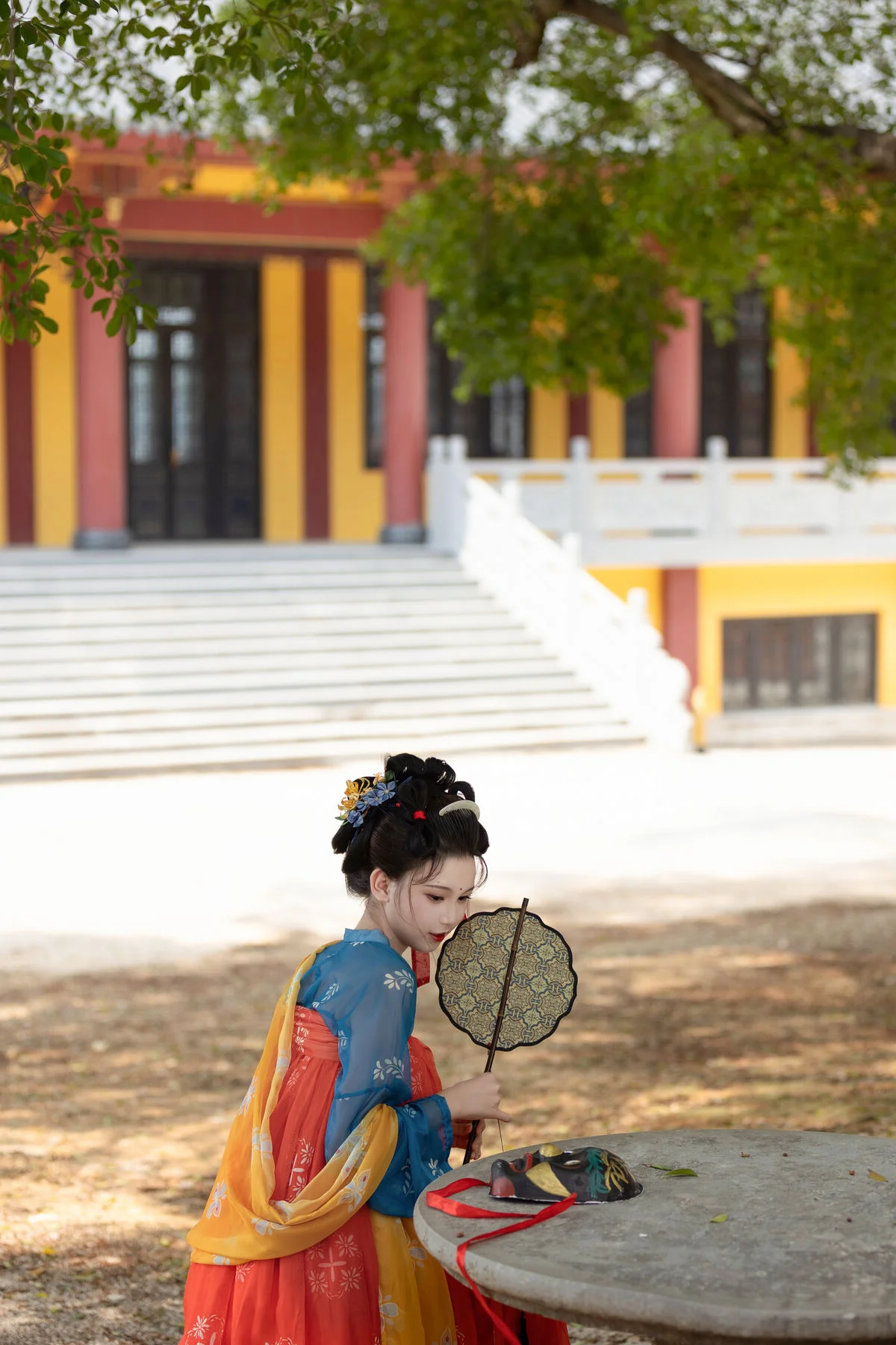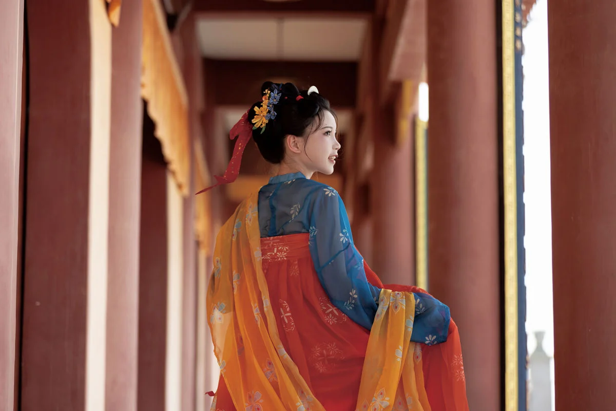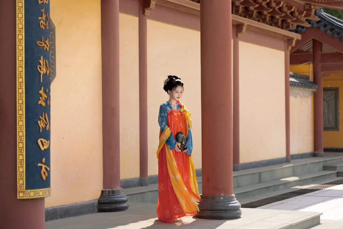 Step into a poetic realm with YiTuYu Art Language Vol.8852, where traditional aesthetics meet modern artistic vision in a breathtaking display of grace. The model, E E Chi Bu Bao, embodies a serene elegance, dressed in a stunning Hanfu ensemble that beautifully contrasts deep azure with vibrant tangerine hues. Seated by a weathered stone table under the gentle shade of ancient trees, she holds a delicate silk fan, her presence evoking the quiet strength and beauty of a bygone era. The background, featuring classic yellow walls and red pillars, provides a majestic backdrop that enhances the overall vintage atmosphere and mood. Every detail, from the intricate embroidery to the classic hair ornaments, speaks of a rich cultural heritage and a sophisticated sense of style. This visual narrative captures more than just fashion; it evokes a profound sense of nostalgia and tranquility, inviting the viewer to appreciate the enduring charm of historical beauty through a contemporary and soulful lens.