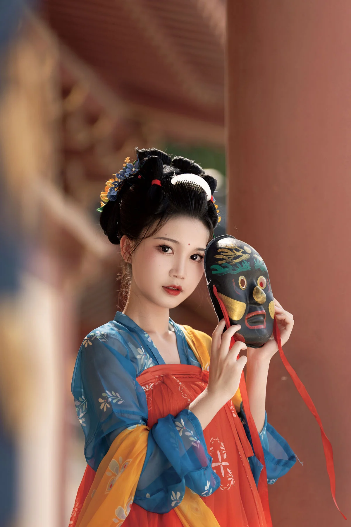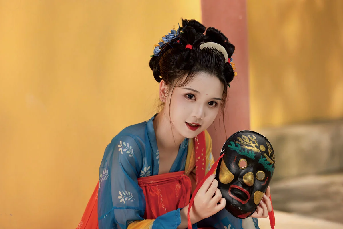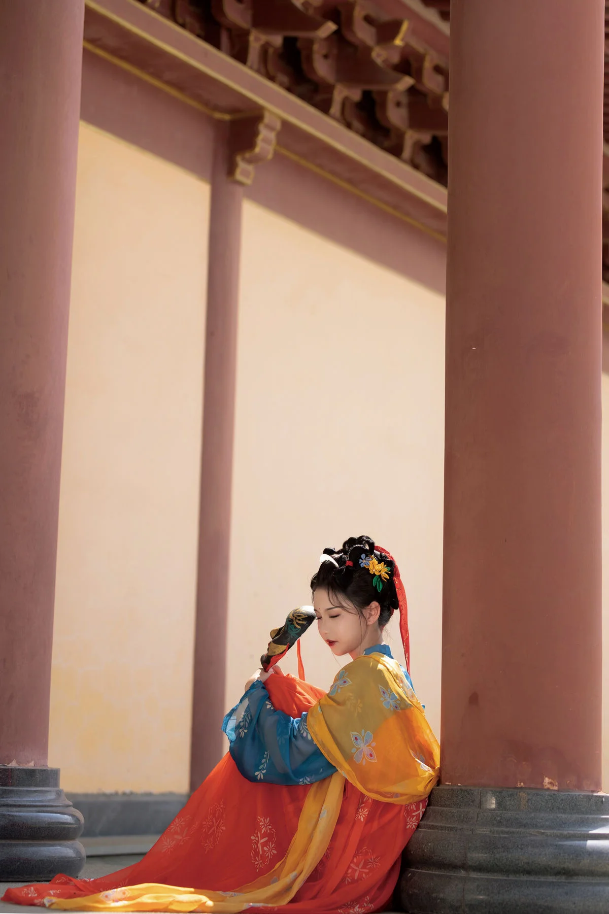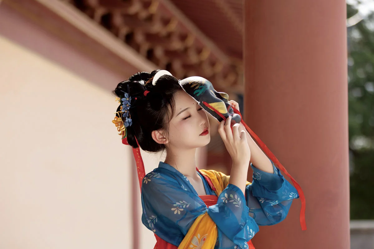 Step into a poetic realm with YiTuYu Art Language Vol.8852, where traditional aesthetics meet modern artistic vision in a breathtaking display of grace. The model, E E Chi Bu Bao, embodies a serene elegance, dressed in a stunning Hanfu ensemble that beautifully contrasts deep azure with vibrant tangerine hues. Seated by a weathered stone table under the gentle shade of ancient trees, she holds a delicate silk fan, her presence evoking the quiet strength and beauty of a bygone era. The background, featuring classic yellow walls and red pillars, provides a majestic backdrop that enhances the overall vintage atmosphere and mood. Every detail, from the intricate embroidery to the classic hair ornaments, speaks of a rich cultural heritage and a sophisticated sense of style. This visual narrative captures more than just fashion; it evokes a profound sense of nostalgia and tranquility, inviting the viewer to appreciate the enduring charm of historical beauty through a contemporary and soulful lens.