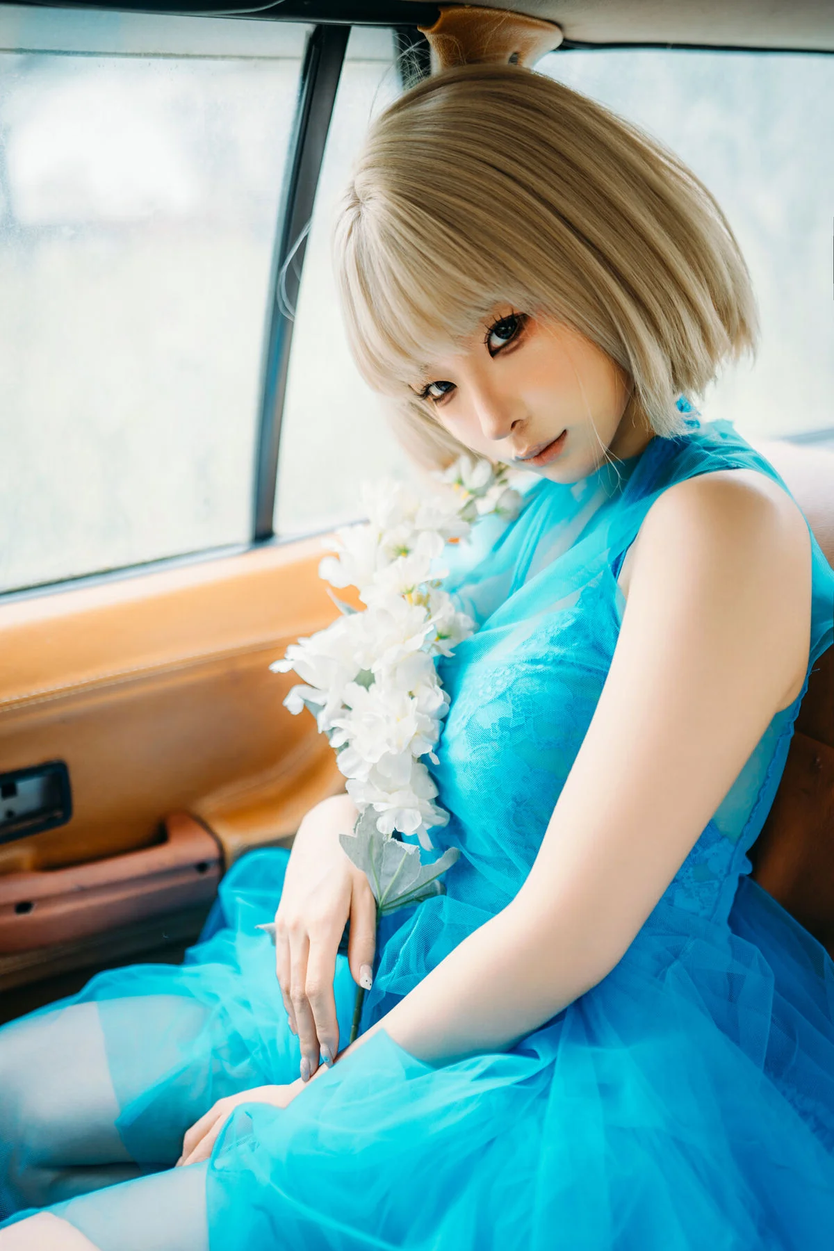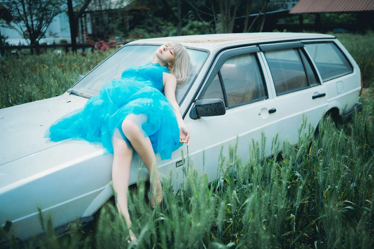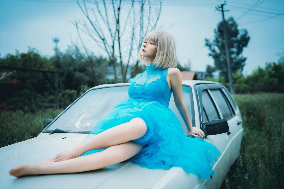 Captured within the nostalgic embrace of a vintage car, this stunning shot of Chunmomo from the collection evokes a sense of ethereal beauty and timeless grace. Her vibrant turquoise dress, crafted from layers of delicate tulle and adorned with soft white blossoms, creates a breathtaking contrast against the warm, tan leather interior. There is a profound sense of poetic melancholy in her expression—a quiet, contemplative gaze that suggests a soul lost in a beautiful dream. The platinum blonde bob adds a modern, chic touch to the otherwise whimsical and romantic styling, perfectly blending avant-garde fashion with a classic cinematic vibe. Every detail, from the soft play of light on the sheer fabric to the harmonious composition, tells a story of elegance and emotional depth. It feels like a fleeting moment of serenity found during a long, scenic drive through a dreamscape, making it a true masterpiece of visual storytelling and fashion art.