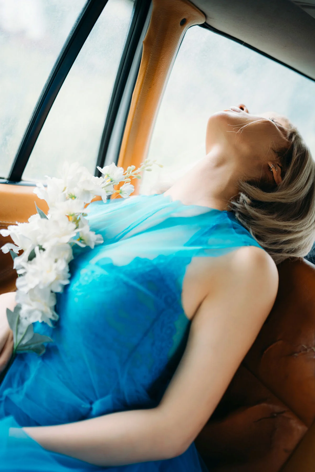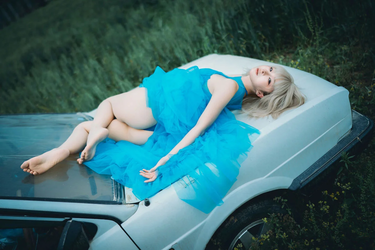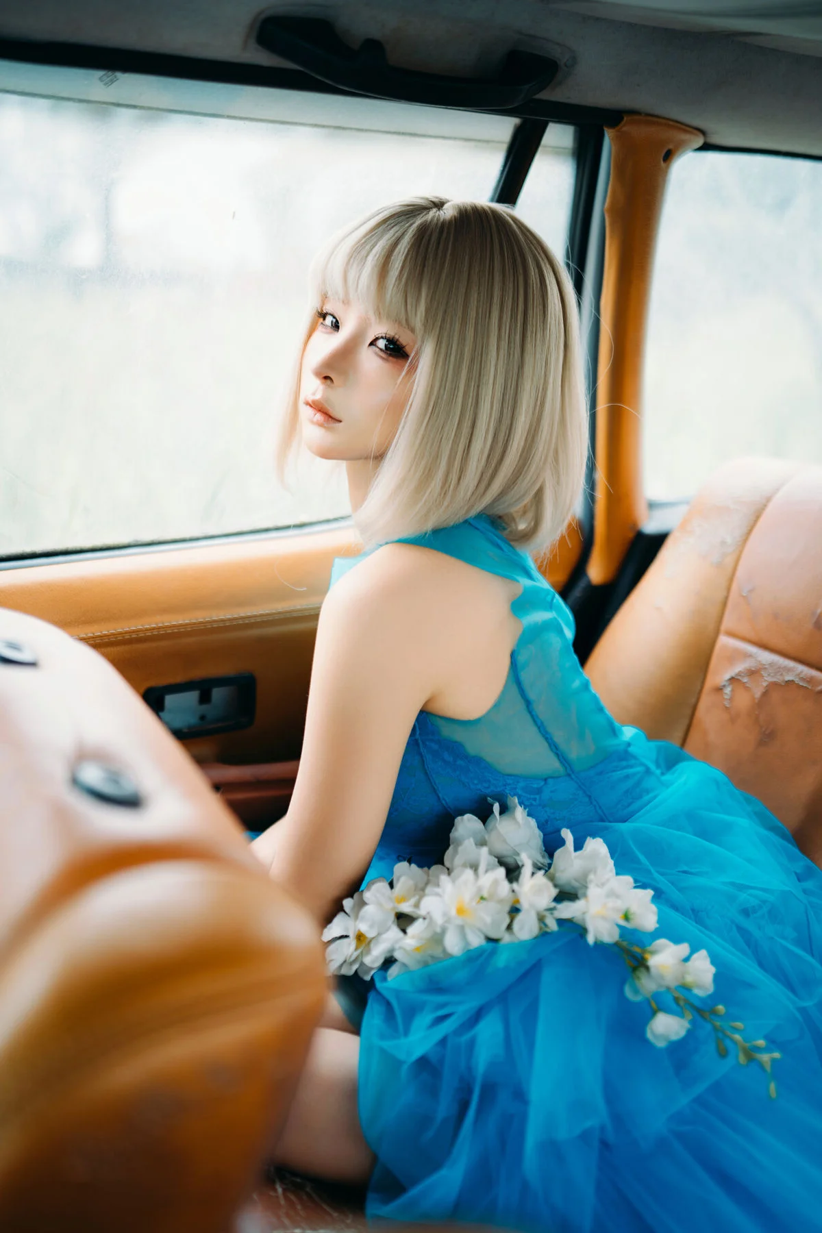 Captured within the nostalgic embrace of a vintage car, this stunning shot of Chunmomo from the collection evokes a sense of ethereal beauty and timeless grace. Her vibrant turquoise dress, crafted from layers of delicate tulle and adorned with soft white blossoms, creates a breathtaking contrast against the warm, tan leather interior. There is a profound sense of poetic melancholy in her expression—a quiet, contemplative gaze that suggests a soul lost in a beautiful dream. The platinum blonde bob adds a modern, chic touch to the otherwise whimsical and romantic styling, perfectly blending avant-garde fashion with a classic cinematic vibe. Every detail, from the soft play of light on the sheer fabric to the harmonious composition, tells a story of elegance and emotional depth. It feels like a fleeting moment of serenity found during a long, scenic drive through a dreamscape, making it a true masterpiece of visual storytelling and fashion art.