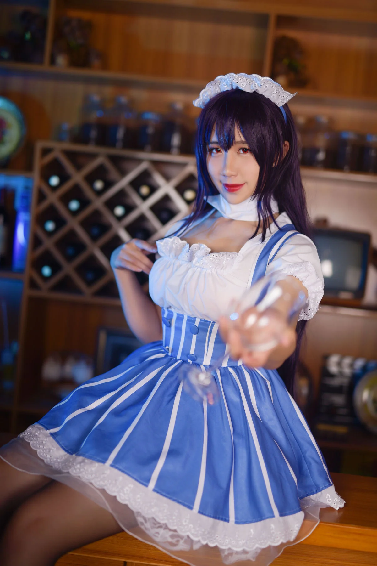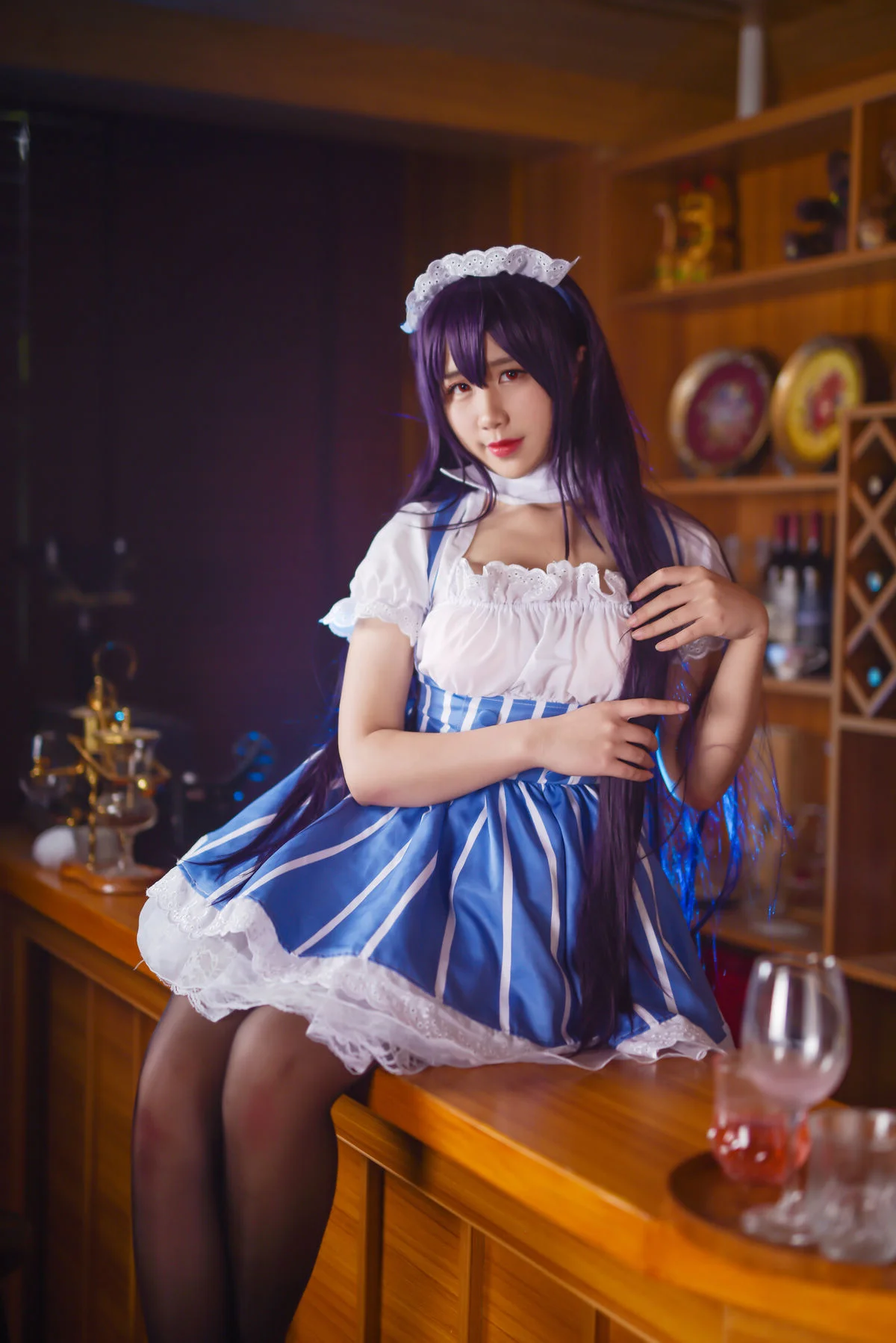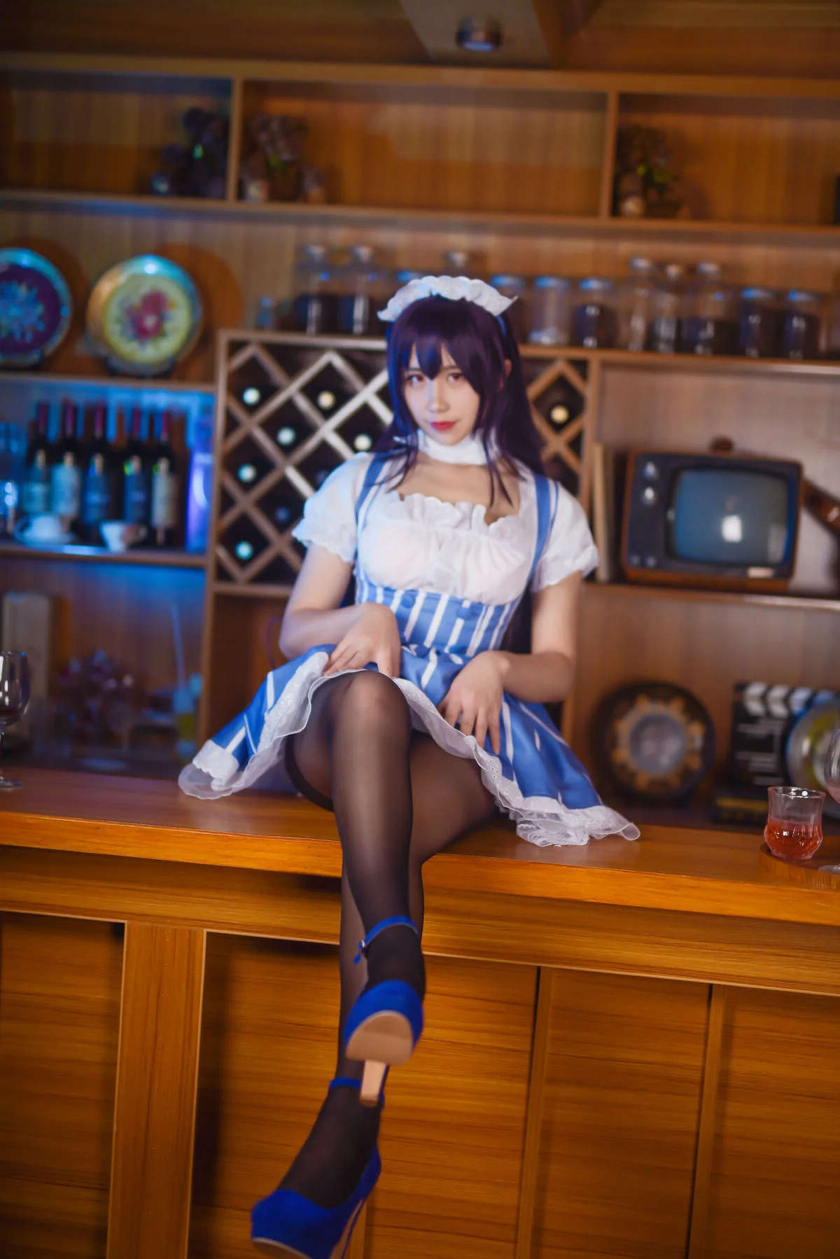 Step into a world of vintage charm where Coser Jiu Qu Jean breathes life into the iconic character Kasumigaoka Utaha. Set against a warm, wooden backdrop reminiscent of a classic European cafe, the visual storytelling is both intimate and sophisticated. The maid outfit, featuring a harmonious blend of royal blue stripes and delicate white lace, showcases a masterful understanding of costume design and texture. Her poised body language and piercing gaze capture the essence of Utaha’s intellectual yet alluring personality. The soft lighting enhances the rich wooden tones of the bar, creating a nostalgic mood that feels like a still from a romantic indie film. Every detail, from the intricate headpiece to the sheer stockings, speaks to a high level of aesthetic curation. It is a beautiful exploration of fashion and character expression, inviting the viewer to linger in this quiet, artistic moment.