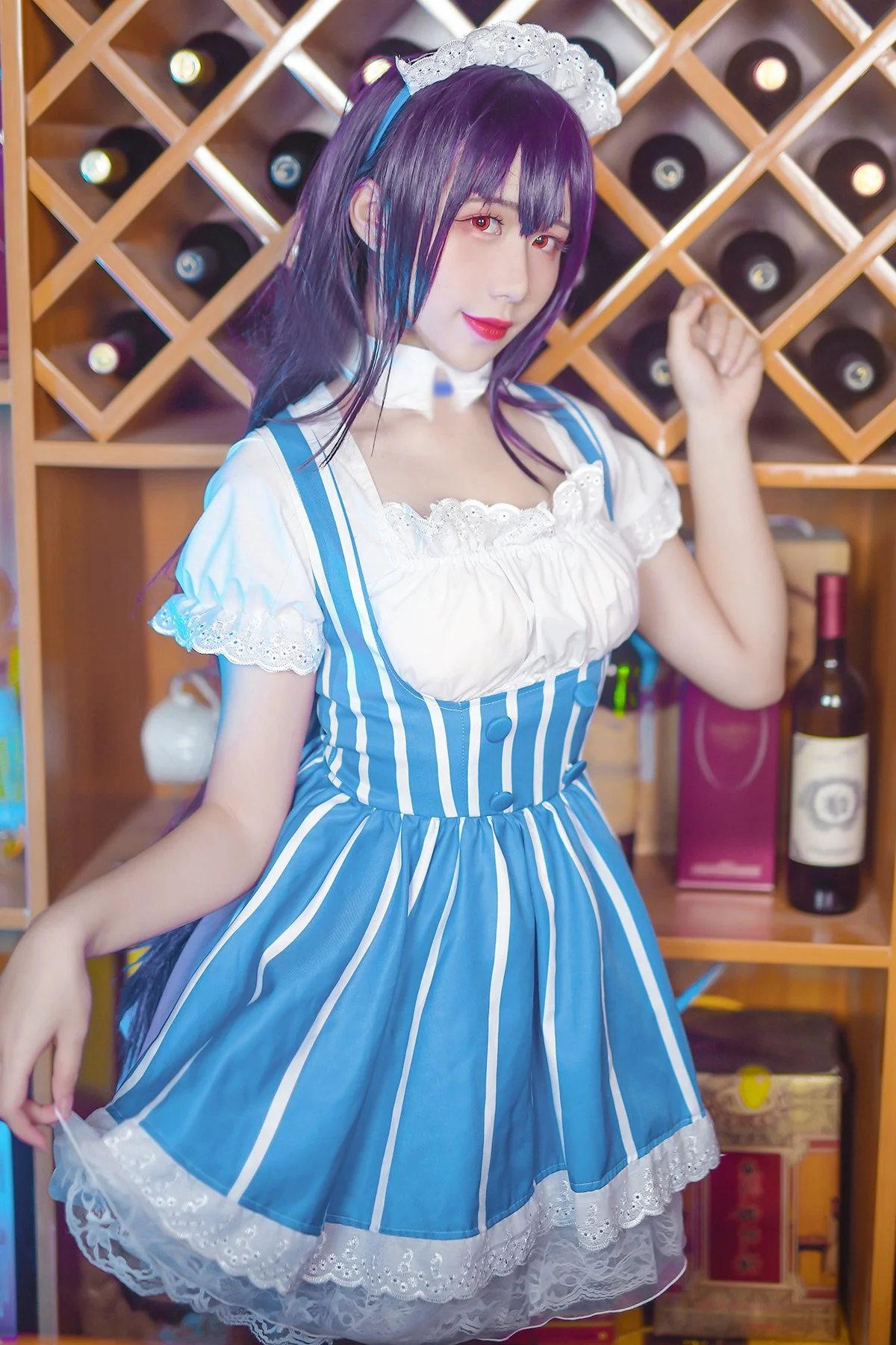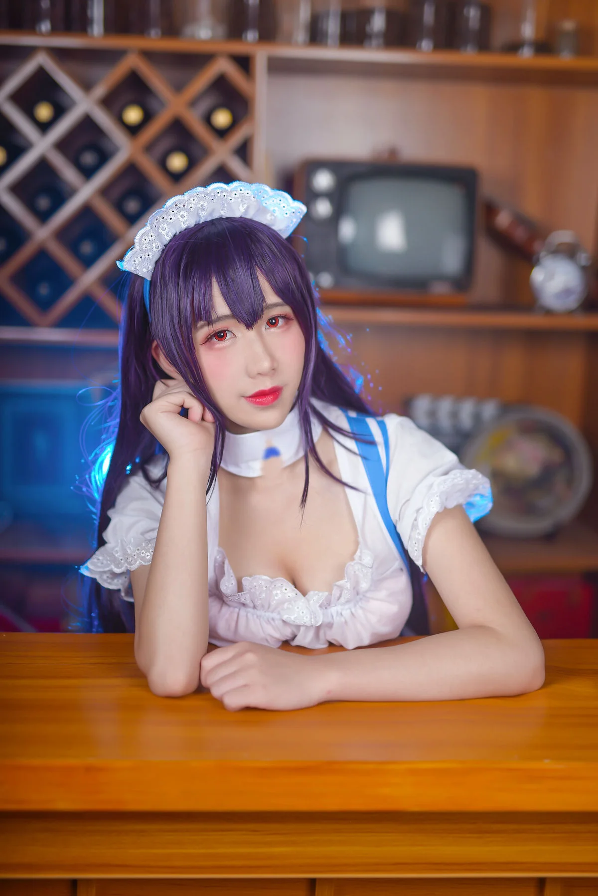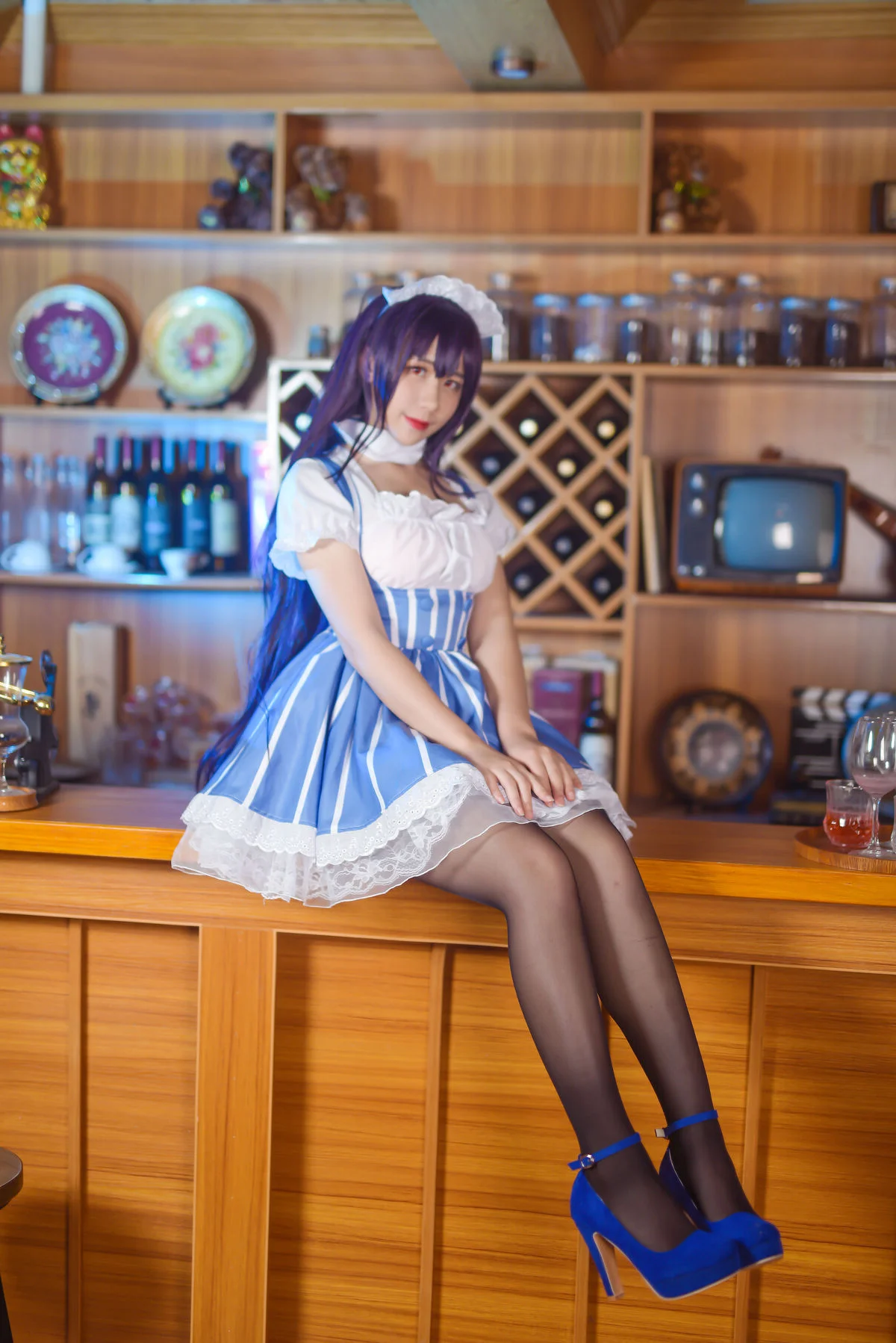 Step into a world of vintage charm where Coser Jiu Qu Jean breathes life into the iconic character Kasumigaoka Utaha. Set against a warm, wooden backdrop reminiscent of a classic European cafe, the visual storytelling is both intimate and sophisticated. The maid outfit, featuring a harmonious blend of royal blue stripes and delicate white lace, showcases a masterful understanding of costume design and texture. Her poised body language and piercing gaze capture the essence of Utaha’s intellectual yet alluring personality. The soft lighting enhances the rich wooden tones of the bar, creating a nostalgic mood that feels like a still from a romantic indie film. Every detail, from the intricate headpiece to the sheer stockings, speaks to a high level of aesthetic curation. It is a beautiful exploration of fashion and character expression, inviting the viewer to linger in this quiet, artistic moment.