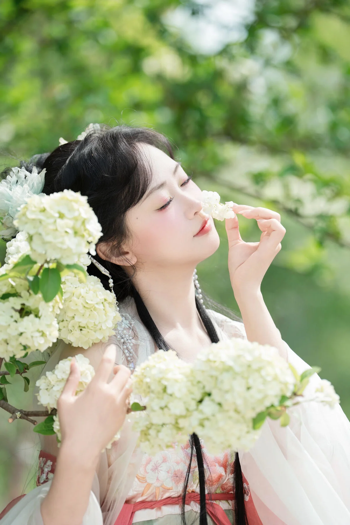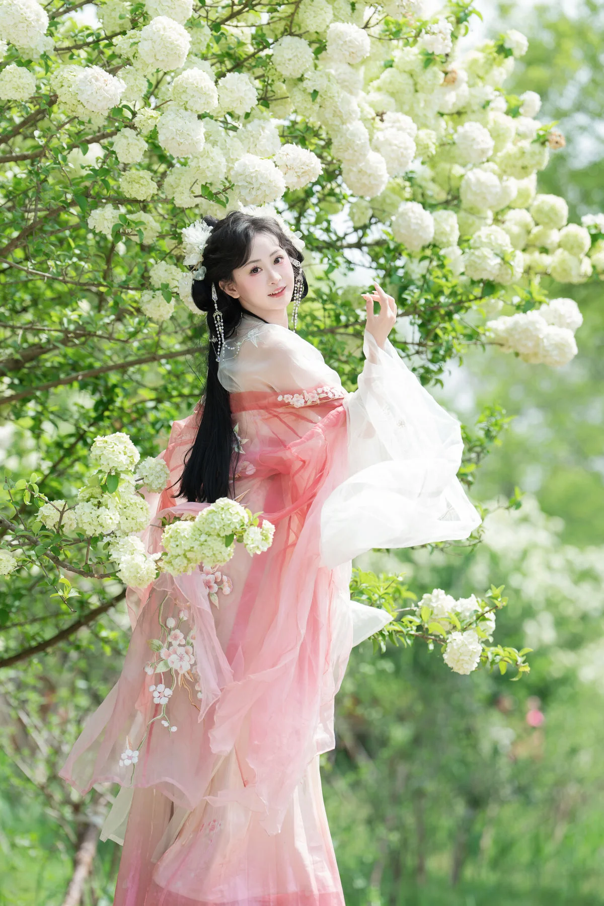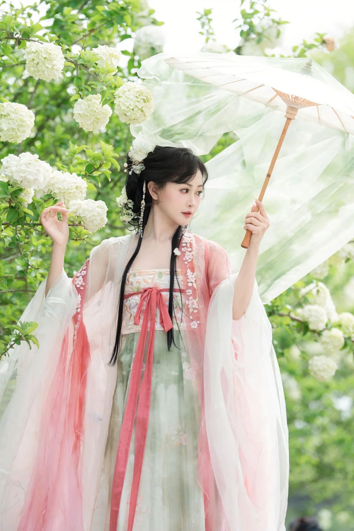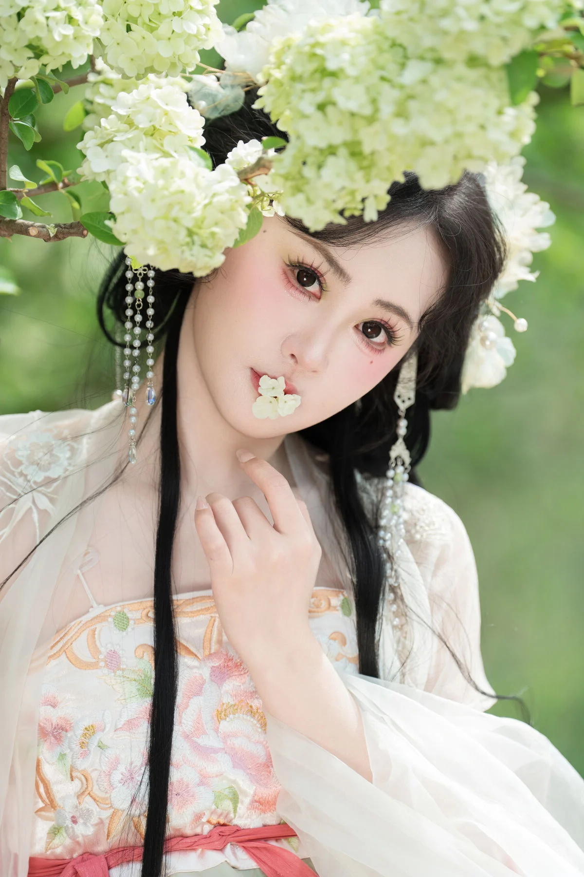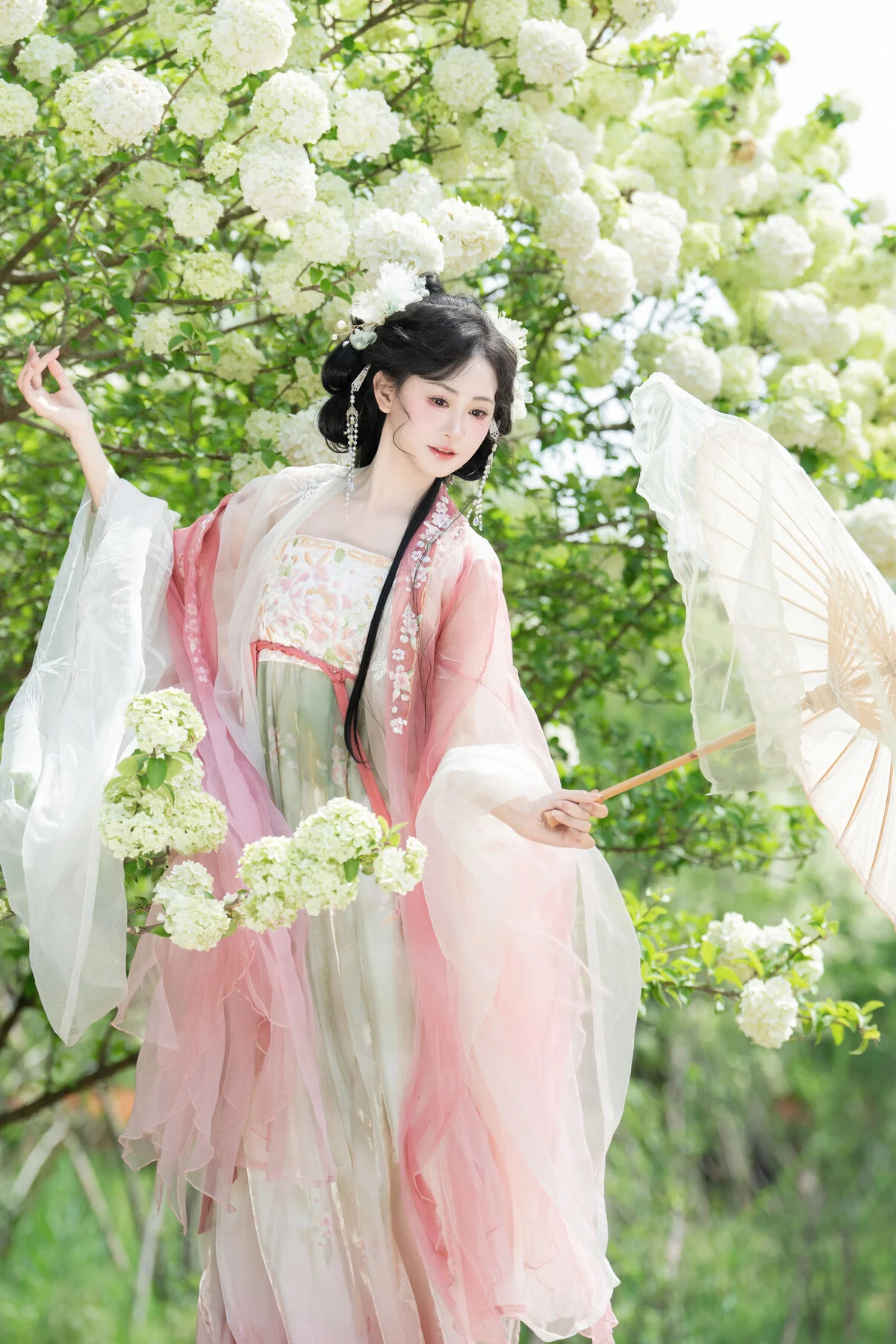 Stepping into a dreamlike garden where clusters of pure white flowers create a breathtaking backdrop, one cannot help but be mesmerized by the ethereal presence of Jiao Yi Zhi Sui Sui. Dressed in an exquisite Hanfu that blends soft pastel pink with delicate jade green, she embodies the grace of a classical painting brought to life. The flowing chiffon layers catch the light beautifully, while the intricate floral embroidery on the bodice showcases a sophisticated sense of style and traditional craftsmanship. Holding a delicate white parasol, her silhouette becomes a symbol of nostalgia and poetic elegance against the lush greenery. The soft lighting and airy composition evoke a profound sense of serenity and wonder, making every frame feel like a fleeting moment of magic. Her gentle expression and poised body language perfectly capture the essence of the Art Language series, offering an inspiring visual experience for those who appreciate the intersection of traditional fashion and the timeless beauty of nature.