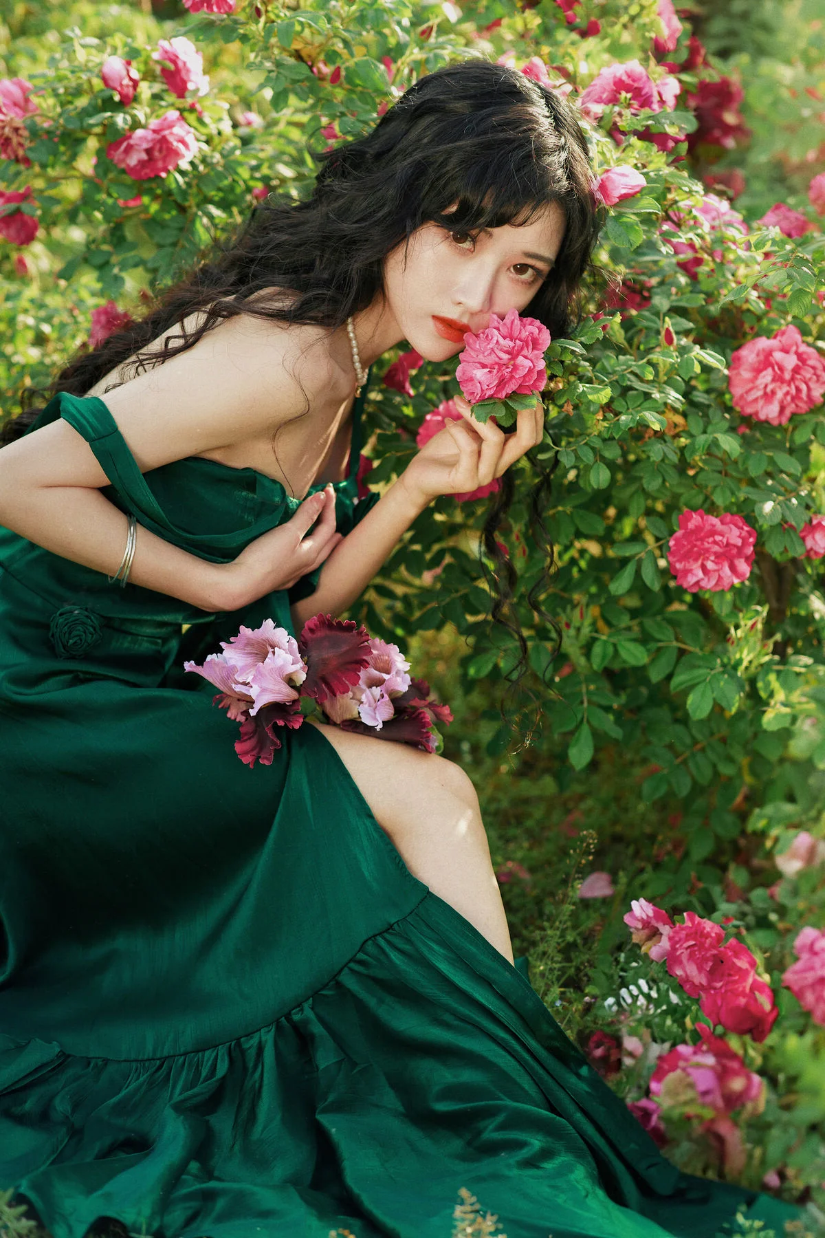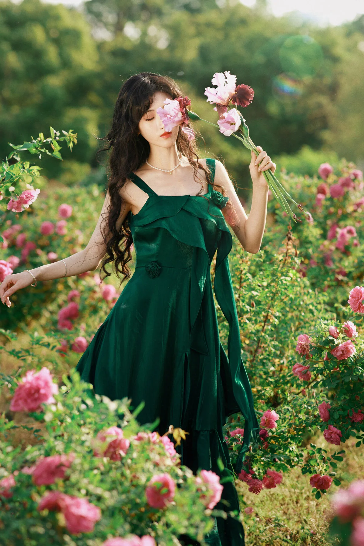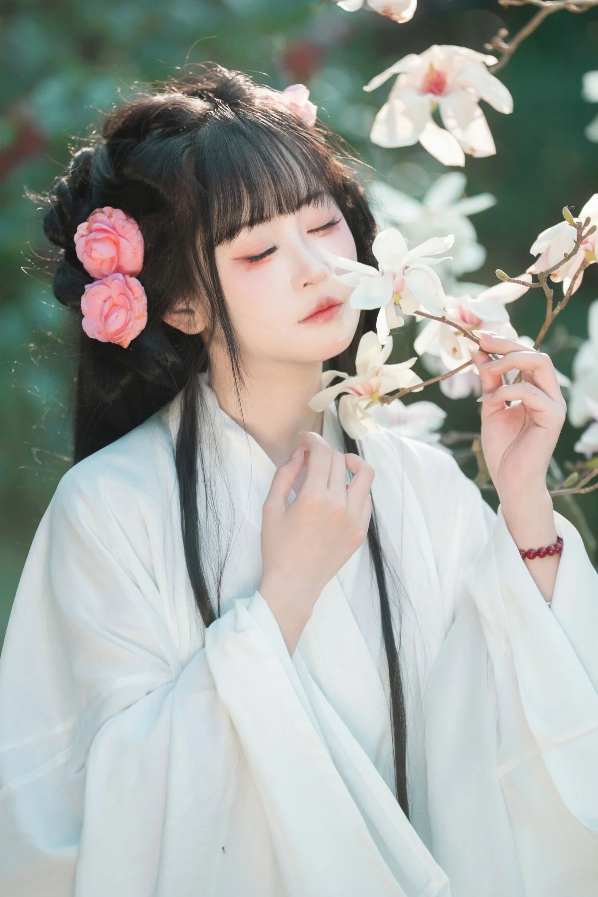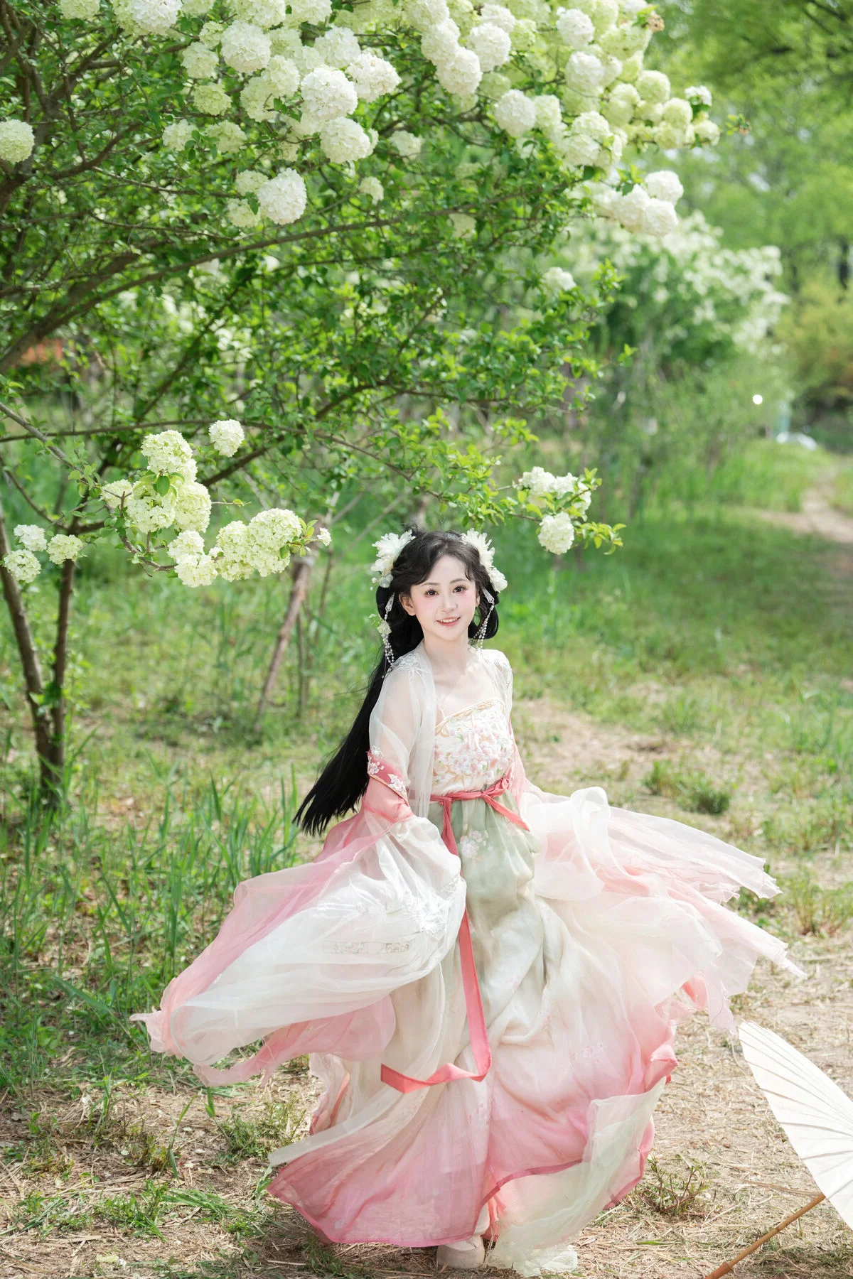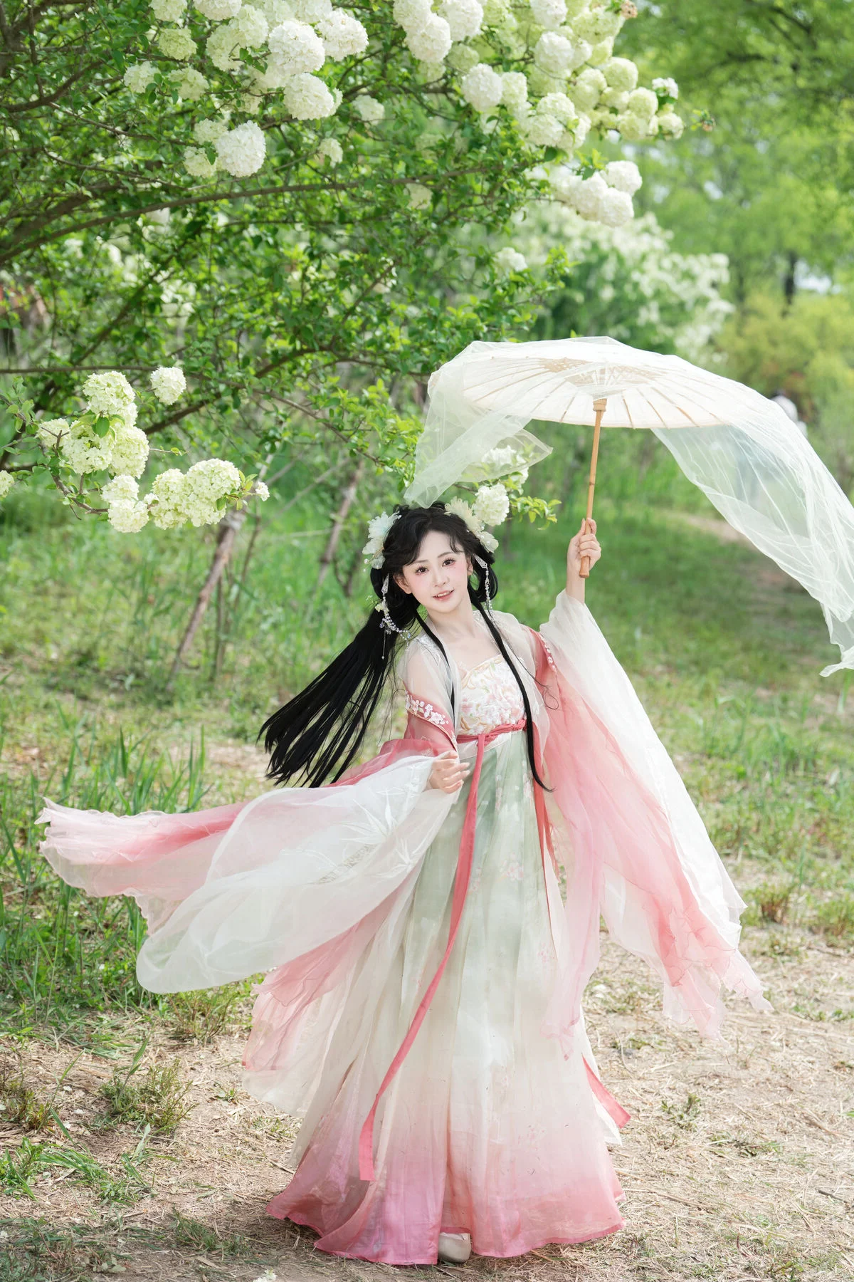 Stepping into a dreamlike garden where clusters of pure white flowers create a breathtaking backdrop, one cannot help but be mesmerized by the ethereal presence of Jiao Yi Zhi Sui Sui. Dressed in an exquisite Hanfu that blends soft pastel pink with delicate jade green, she embodies the grace of a classical painting brought to life. The flowing chiffon layers catch the light beautifully, while the intricate floral embroidery on the bodice showcases a sophisticated sense of style and traditional craftsmanship. Holding a delicate white parasol, her silhouette becomes a symbol of nostalgia and poetic elegance against the lush greenery. The soft lighting and airy composition evoke a profound sense of serenity and wonder, making every frame feel like a fleeting moment of magic. Her gentle expression and poised body language perfectly capture the essence of the Art Language series, offering an inspiring visual experience for those who appreciate the intersection of traditional fashion and the timeless beauty of nature.