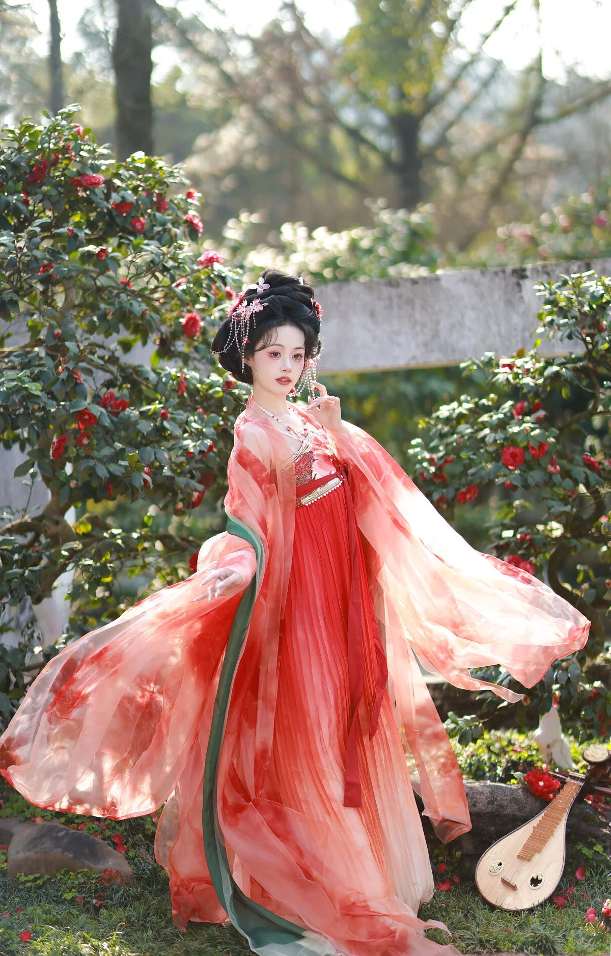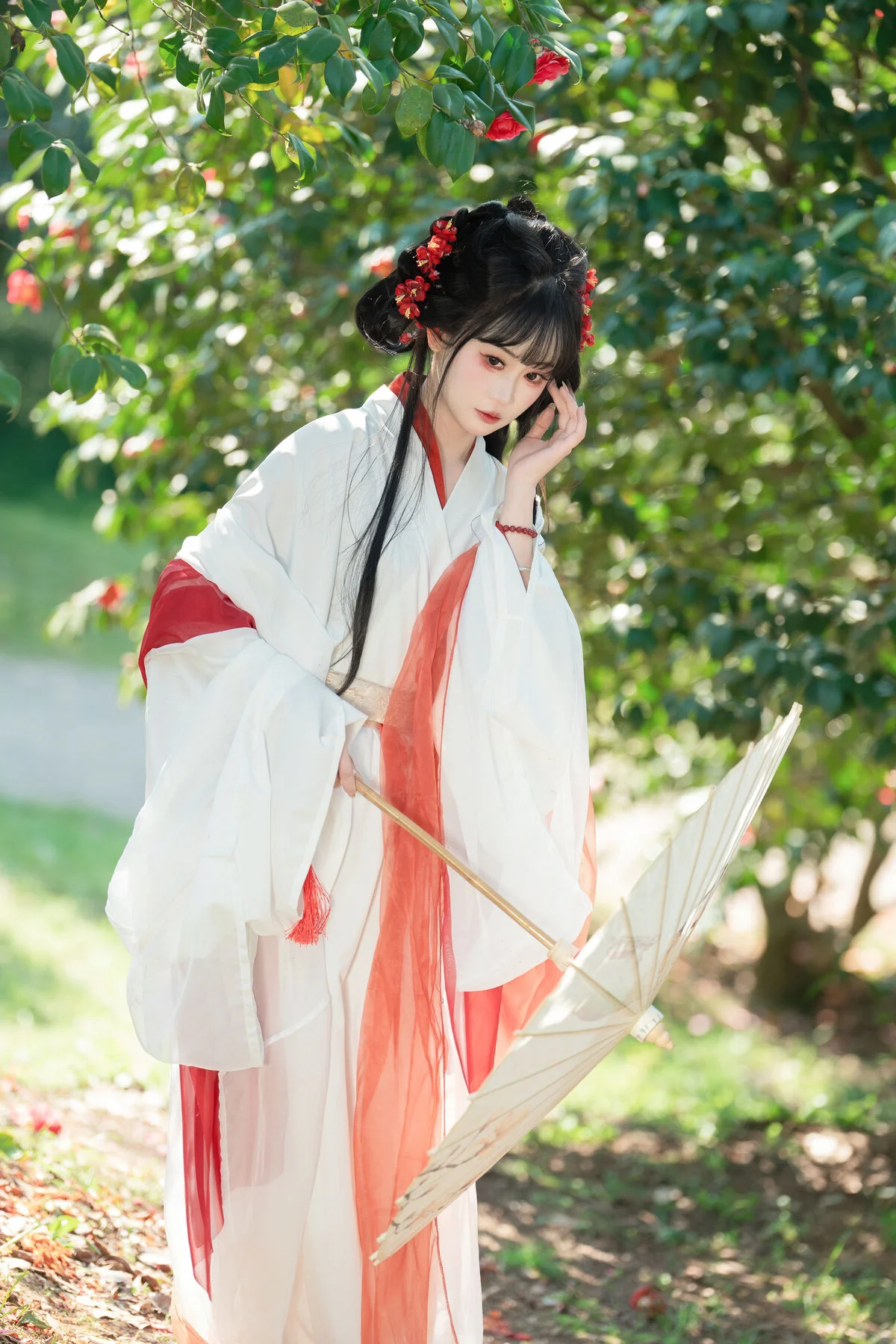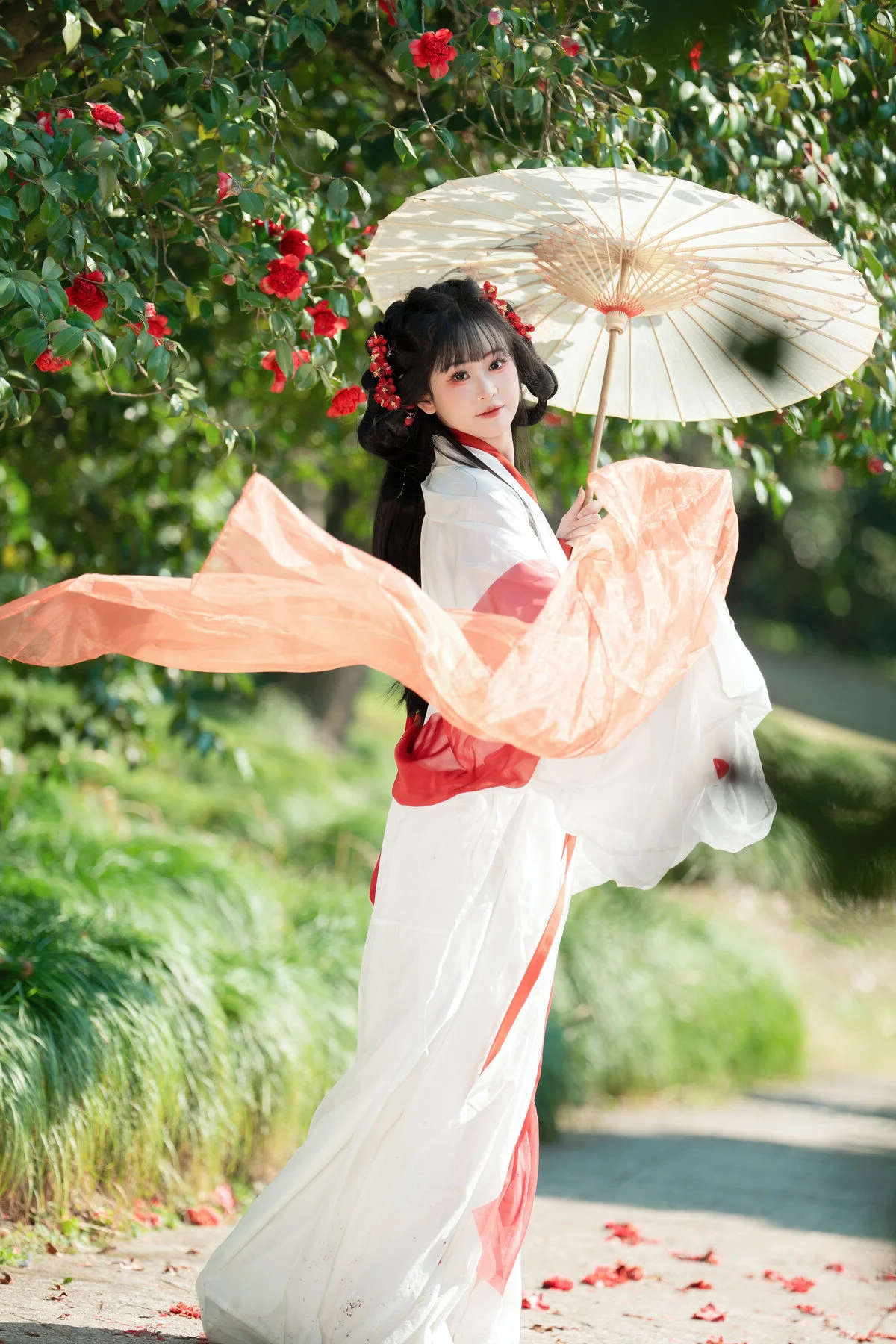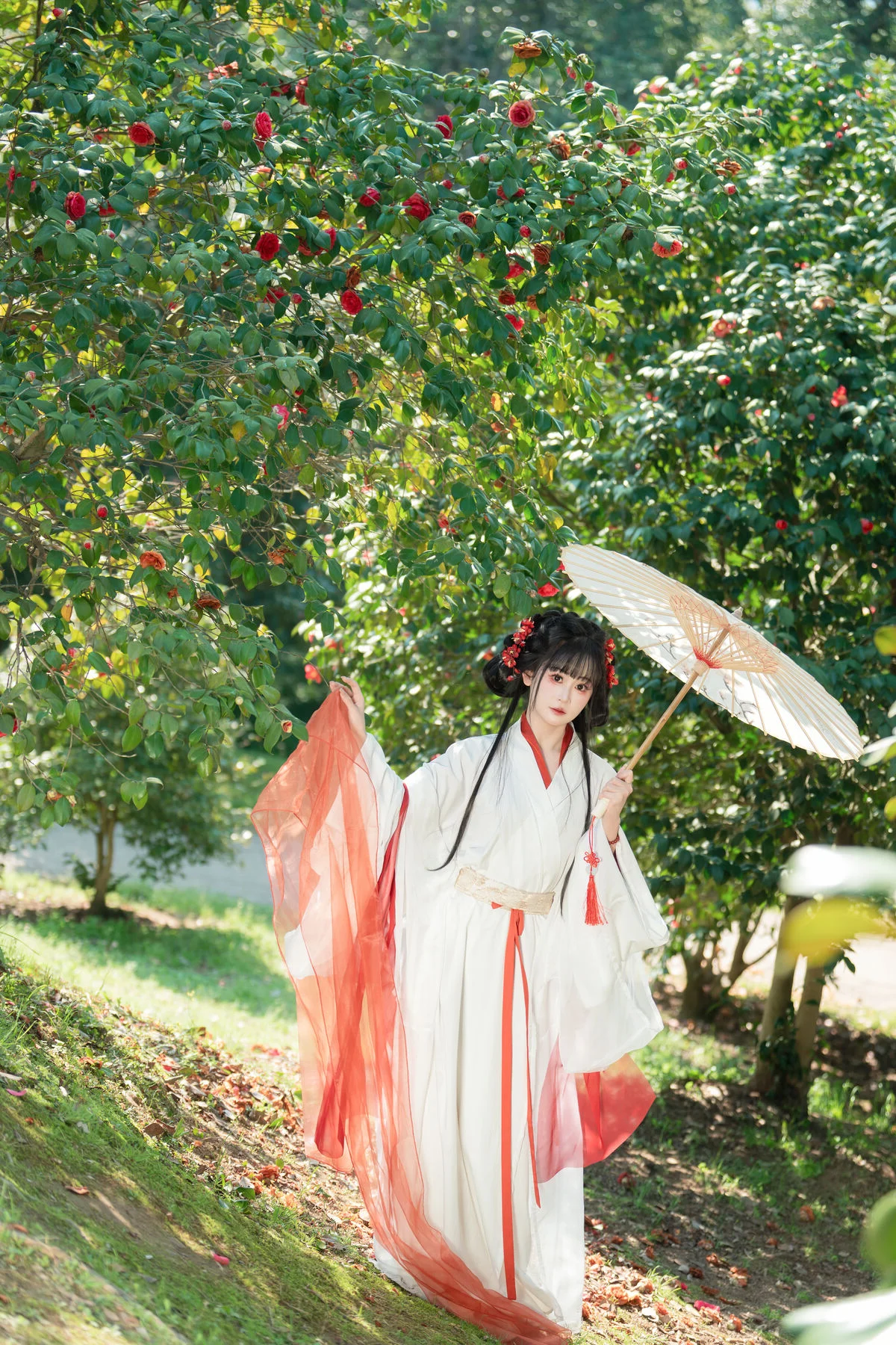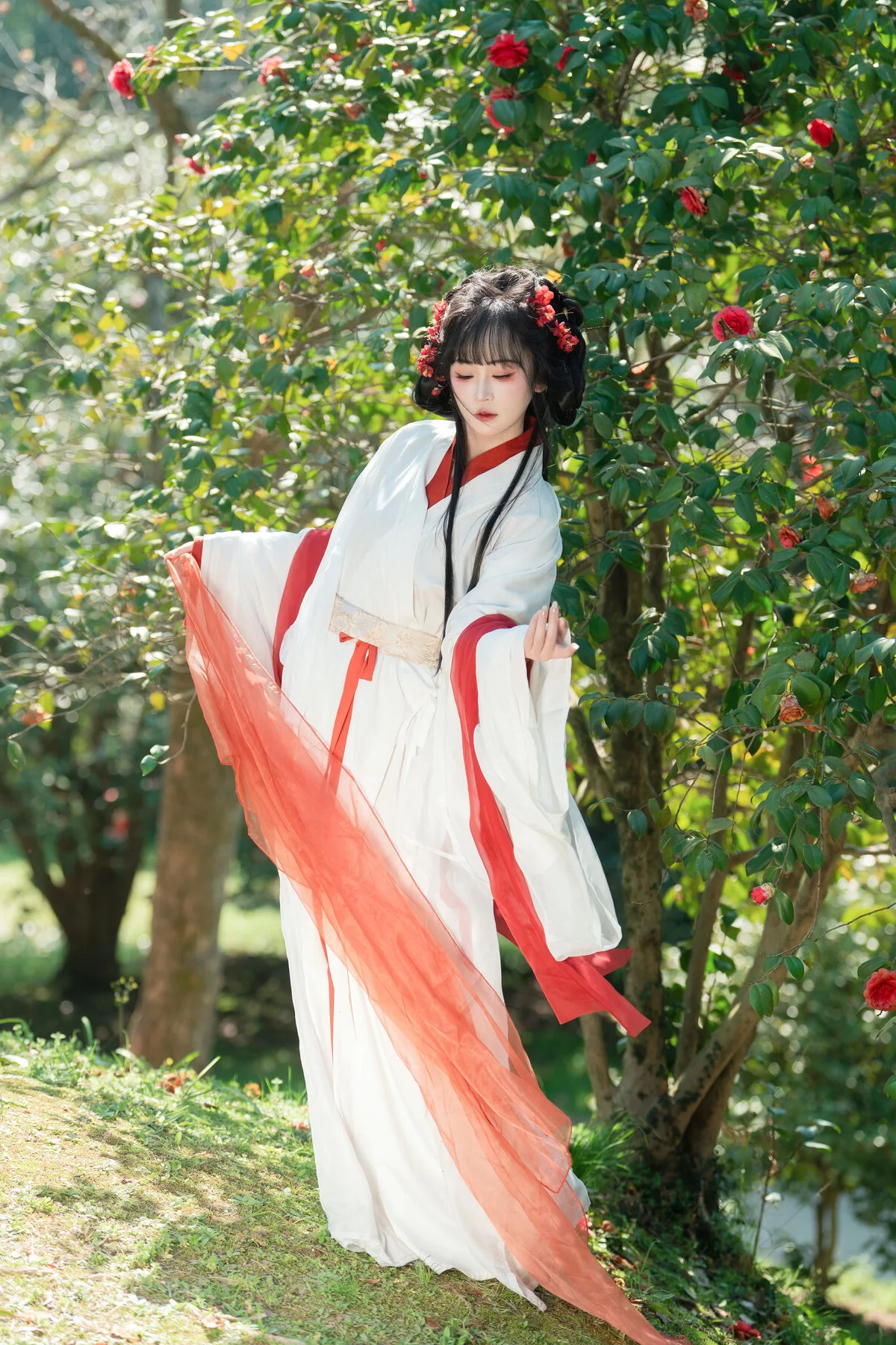 Step into a world of timeless beauty where the elegance of traditional Hanfu meets the poetic charm of a blooming camellia garden. The pure white fabric, accented with bold red silk ribbons, creates a stunning visual harmony that feels both ethereal and grounded. Holding a delicate paper umbrella, the model embodies the grace of a bygone era, wandering through a landscape painted with soft sunlight and lush greenery. The vibrant red camellias serve as a perfect backdrop, echoing the scarlet details of her attire and adding a touch of romance to the entire scene. This collection is a masterclass in visual storytelling, capturing a moment of profound serenity and artistic expression that transcends modern trends. Every detail, from the fluid movement of the wide sleeves to the gentle play of light and shadow on the grass, invites the viewer to experience a sense of peace and wonder. It is a beautiful tribute to traditional aesthetics, showcasing a refined taste for fashion and the enduring allure of nature in its most tranquil form.