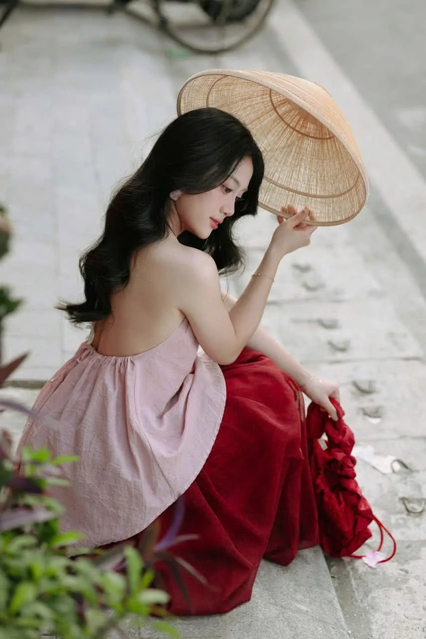 A moment of pure poetic beauty captured against the rustic charm of weathered brick walls, where time seems to stand still to honor the gentle grace of a young woman. Dressed in a modern interpretation of the traditional Vietnamese halter top, the harmony between soft pastel pink and vibrant red creates a striking yet elegant visual contrast. The delicate fabric flows naturally, highlighting her radiant skin and pure aura. With a clear gaze and a soft smile, she gently holds a dried leaf, evoking a sense of nostalgic longing and the quiet soul of ancient places. This visual narrative beautifully blends heritage aesthetics with a contemporary fashion sense, showcasing a sophisticated taste in style. The natural expression and effortless pose transform the frame into a piece of visual art, whispering stories of timeless grace and artistic inspiration that resonate deeply with anyone seeking beauty in simplicity.