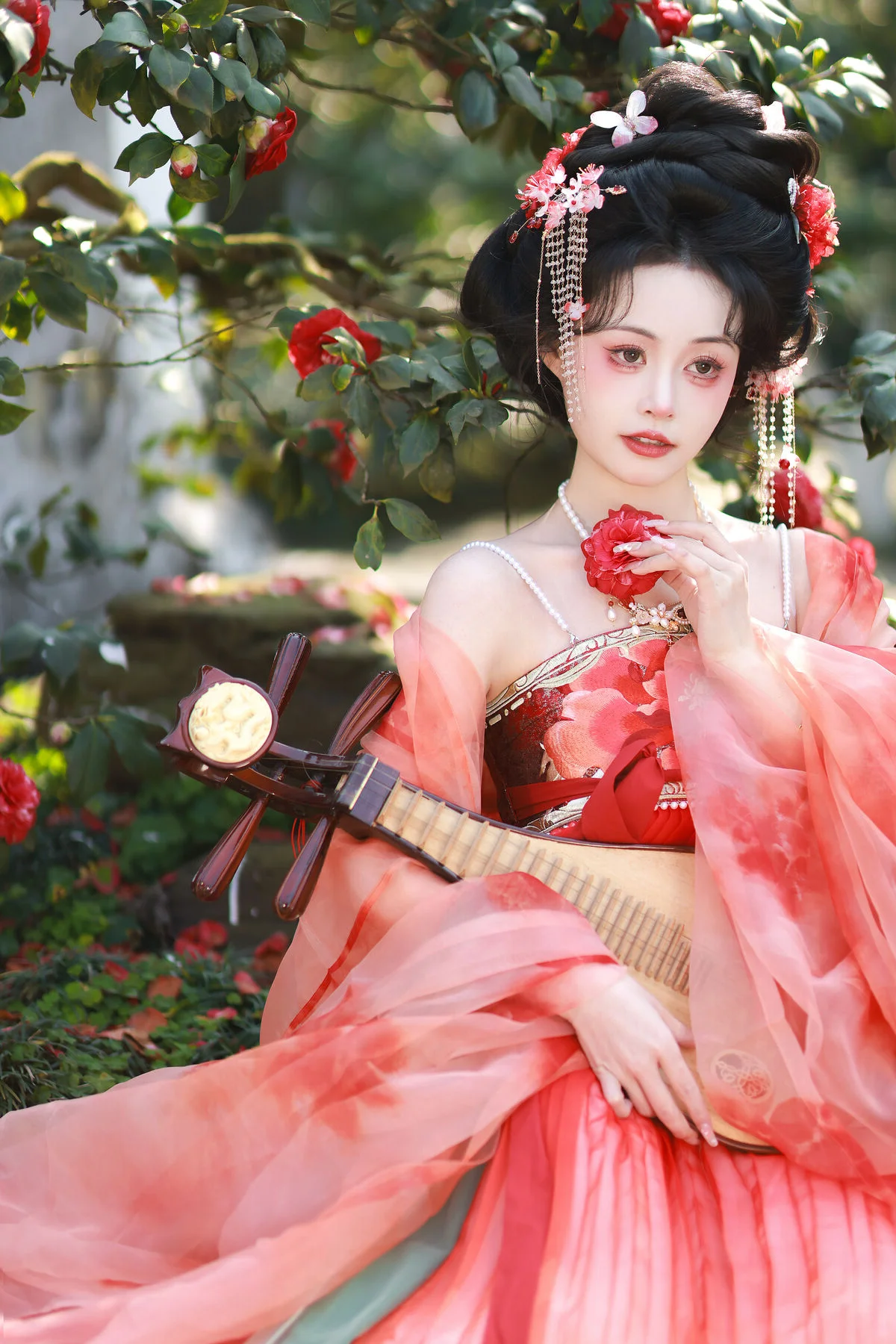 Stepping into the ethereal realm of YiTuYu Art Language, Takumi Ya embodies the essence of classical Chinese beauty. Clad in a striking crimson Hanfu, the layered silk fabrics create a mesmerizing gradient that flows like water under the soft garden light. Her expression, a blend of serenity and subtle melancholy, captures the viewers heart instantly through a lens of poetic storytelling. The intricate hairstyling, adorned with delicate butterfly ornaments and silk flowers, showcases a meticulous attention to historical fashion details and artistic flair. The presence of the Pipa adds a layer of depth, suggesting a narrative of ancient melodies and timeless elegance. This visual composition is a masterclass in color theory, where the bold reds contrast beautifully against the natural greenery, creating a mood that is both romantic and nostalgic. It is more than just a photoshoot, it is a soulful exploration of traditional aesthetics through a modern artistic lens, perfect for those who find inspiration in the intersection of culture, fashion, and visual art.