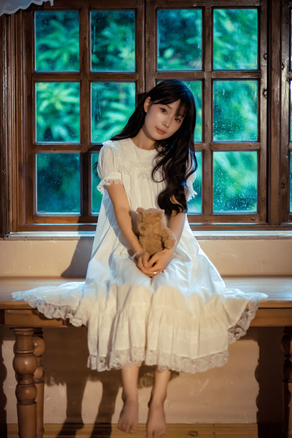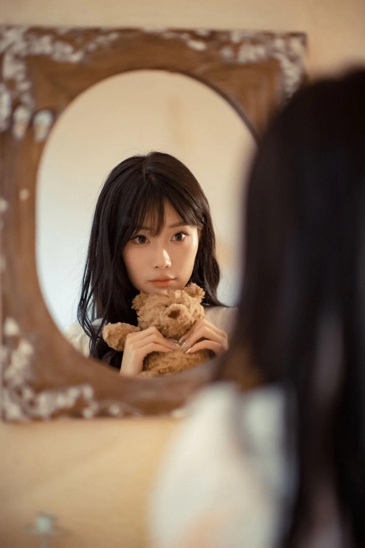 In the YiTuYu Vol8815 collection Nan Yi captivates with her gentle pensive beauty She sits on the bed her gaze distant tenderly holding an old teddy bear Her pristine white dress accentuates an innocence tinged with nostalgia This image transcends a mere moment telling a story of profound emotions that evoke memories and inner tranquility Nan Yi embodies a muse from an old tale exuding an ethereal charm that draws viewers into her introspective world This heartfelt artistic piece from YiTuYu is truly evocative