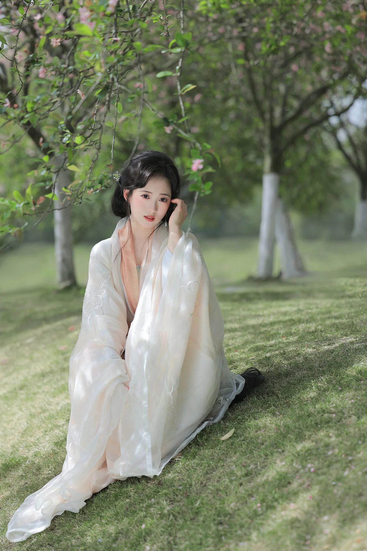 Stepping into the poetic landscape of Qunyu Mountain, Tie Tie embodies the essence of a classical muse in this stunning visual journey. Dressed in ethereal Hanfu crafted from layers of translucent silk and chiffon, the soft palette of peach and cream creates a dreamlike harmony against the blooming spring backdrop. Her serene expression and the graceful movement of the sheer ribbon evoke a sense of timeless elegance and profound inner peace. The artistic composition captures the delicate interplay of light and shadow, highlighting the intricate textures of her traditional attire and the subtle luster of her jade bracelet. It feels like a whisper from the past, where fashion becomes a bridge to the soul of nature. This collection is a masterpiece of visual storytelling, blending the soft aesthetics of ancient traditions with a modern touch of minimalist grace, making every frame feel like a living painting that inspires wanderlust and a deep appreciation for cultural beauty and artistic soul.