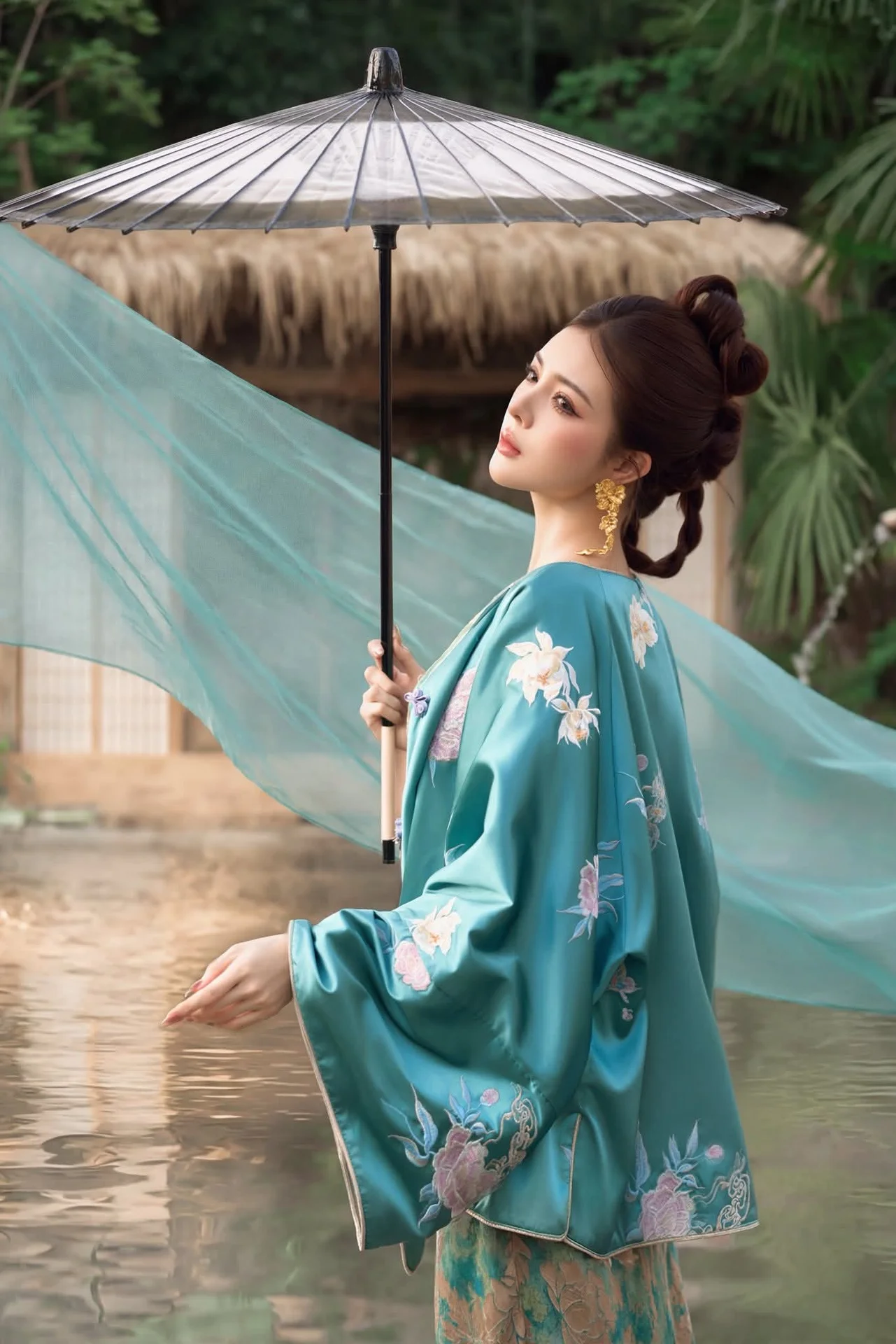 This image evokes a profound sense of nostalgia and tranquility reminiscent of a scene from a classic cinematic masterpiece. The subject embodies a gentle grace with her distant gaze filled with unspoken stories as she rests beside a traditional paper umbrella. Her attire is a beautiful tribute to ancient aesthetics featuring a primary teal palette adorned with delicate floral patterns on wide sleeves and a flowing patterned skirt. The soft fabric and thoughtful coordination highlight the ethereal and sophisticated beauty characteristic of Eastern heritage. The rustic setting by the water with its simple bamboo bridge and dried branches in a ceramic vase creates a balanced and visually striking composition. Soft lighting envelops the scene emphasizing the beauty of stillness and inner reflection. This is more than just a fashion moment it is a seamless blend of human emotion and traditional architectural space evoking timeless aesthetic values that remain vibrant even in the modern world 1000029841.jpg.