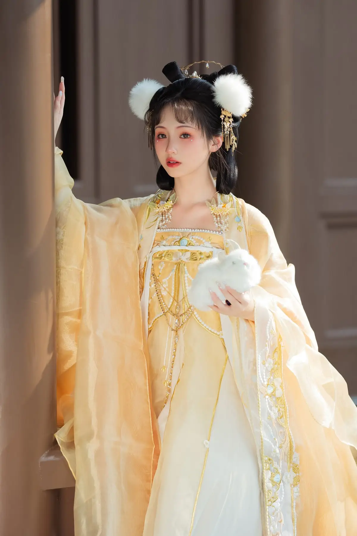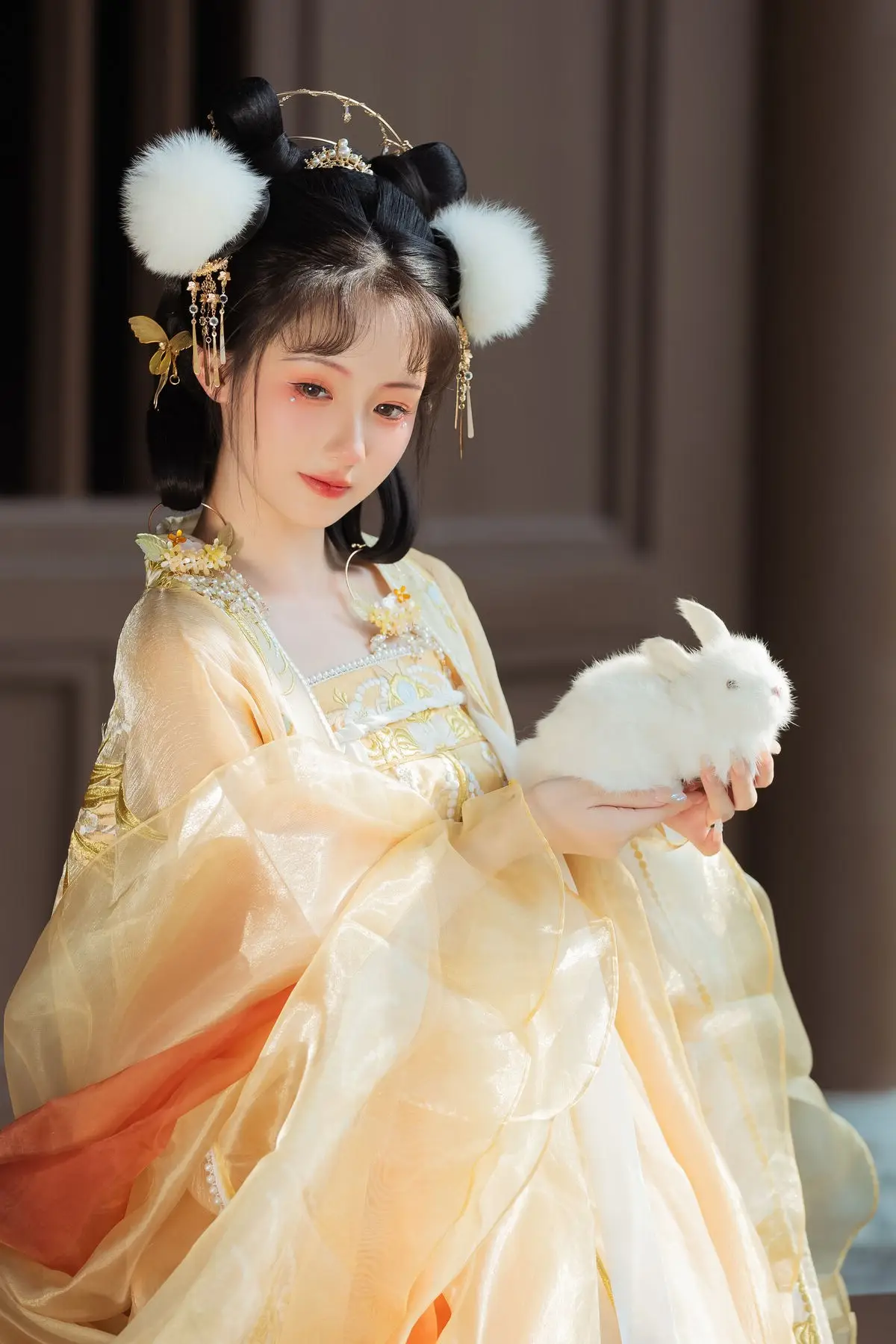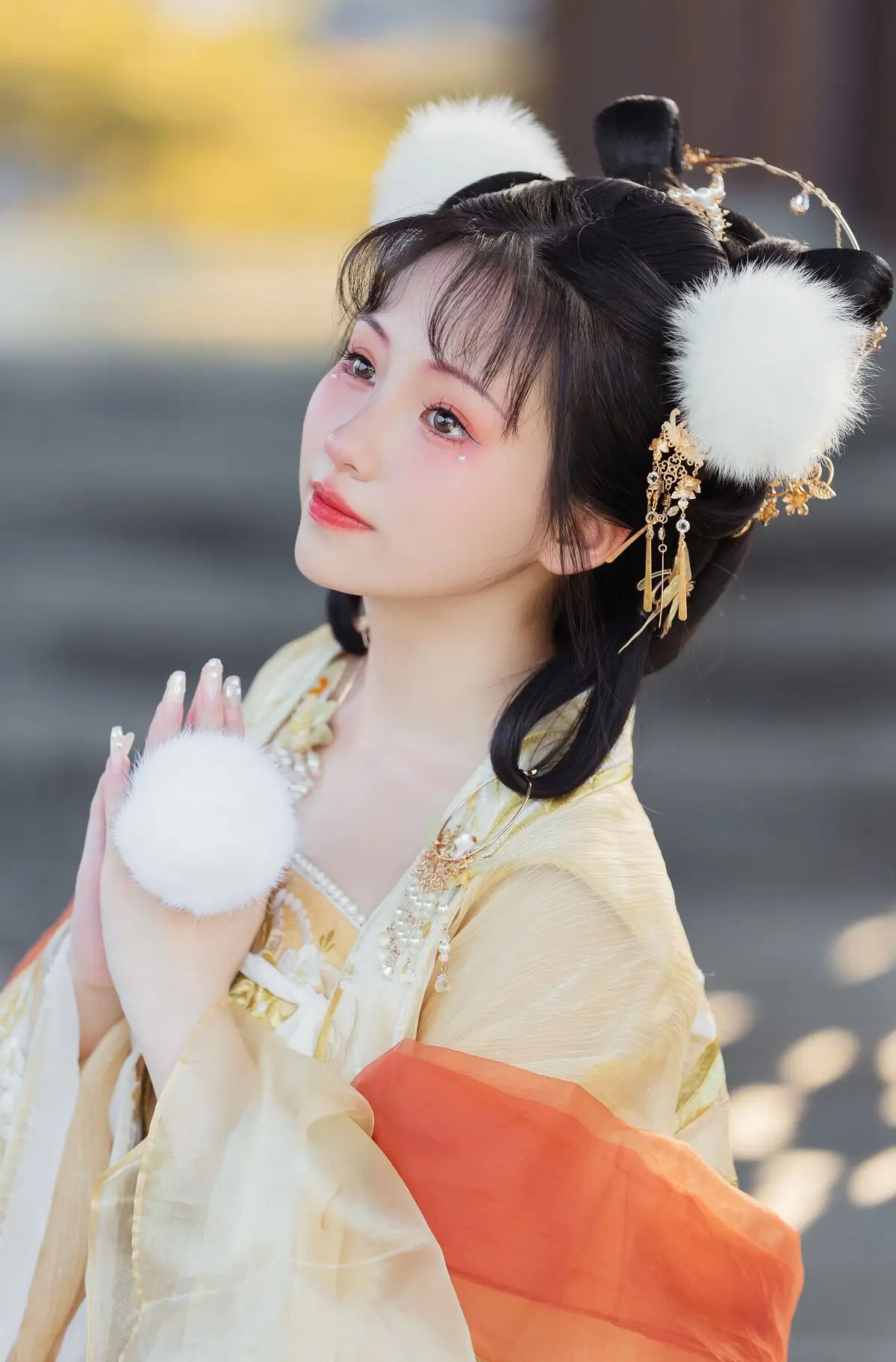In the YiTuYu Vol8661 photo collection, model Yi Zhi Nian Gao Jing captivates with her graceful and elegant presence in traditional Hanfu attire. Adorned in a splendid costume featuring vibrant yellow and orange hues blended with pristine white, she embodies a muse from ancient tales. Each soft, flowing fold of fabric accentuates her gentle beauty and refined demeanor. With an intricately styled hairdo and unique accessories, notably the delicately held white teapot, the image subtly evokes the refined tradition of East Asian tea culture. This photograph transcends mere visual appeal, conveying a profound sense of serenity and the rich cultural heritage of Asia, inviting viewers to immerse themselves in this enchanting artistic realm. It is a true work of art, where classical beauty harmonizes with contemporary photographic artistry.#Hanfu #TraditionalChineseDress #YiZhi #NianGaoJing #AsianBeauty #ArtPhotography