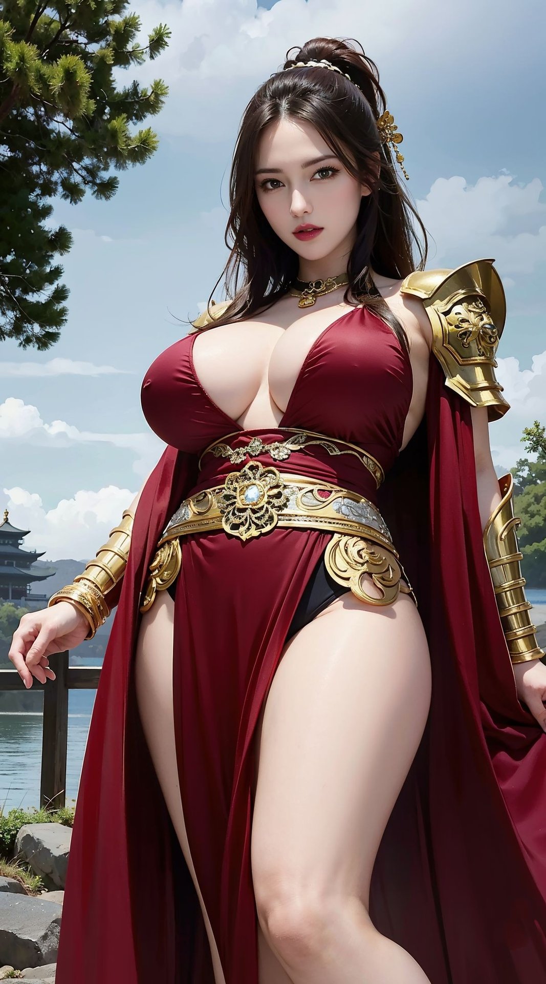 This stunning image showcases a powerful AI generated female warrior, rendered in an impressive web game style. She is depicted in a magnificent red and black warrior outfit, adorned with intricate gold armor that accentuates her elegant beauty and graceful physique. The female general stands confidently by the water's edge, weapon in hand, her gaze resolute and exuding an aura of courage and authority. Every detail, from her armor and attire to her hair, is meticulously crafted, demonstrating advanced AI technology in character design. This portrayal not only highlights her captivating allure but also affirms the latent strength of a legendary combatant, ready to face any challenge.