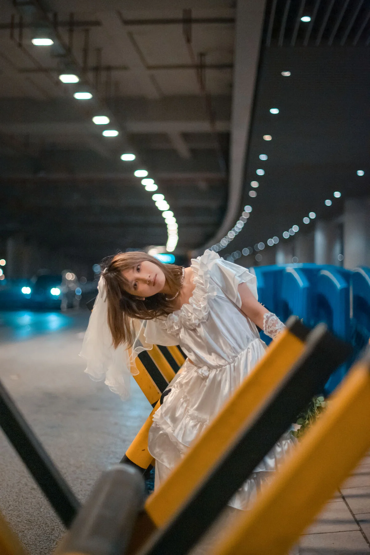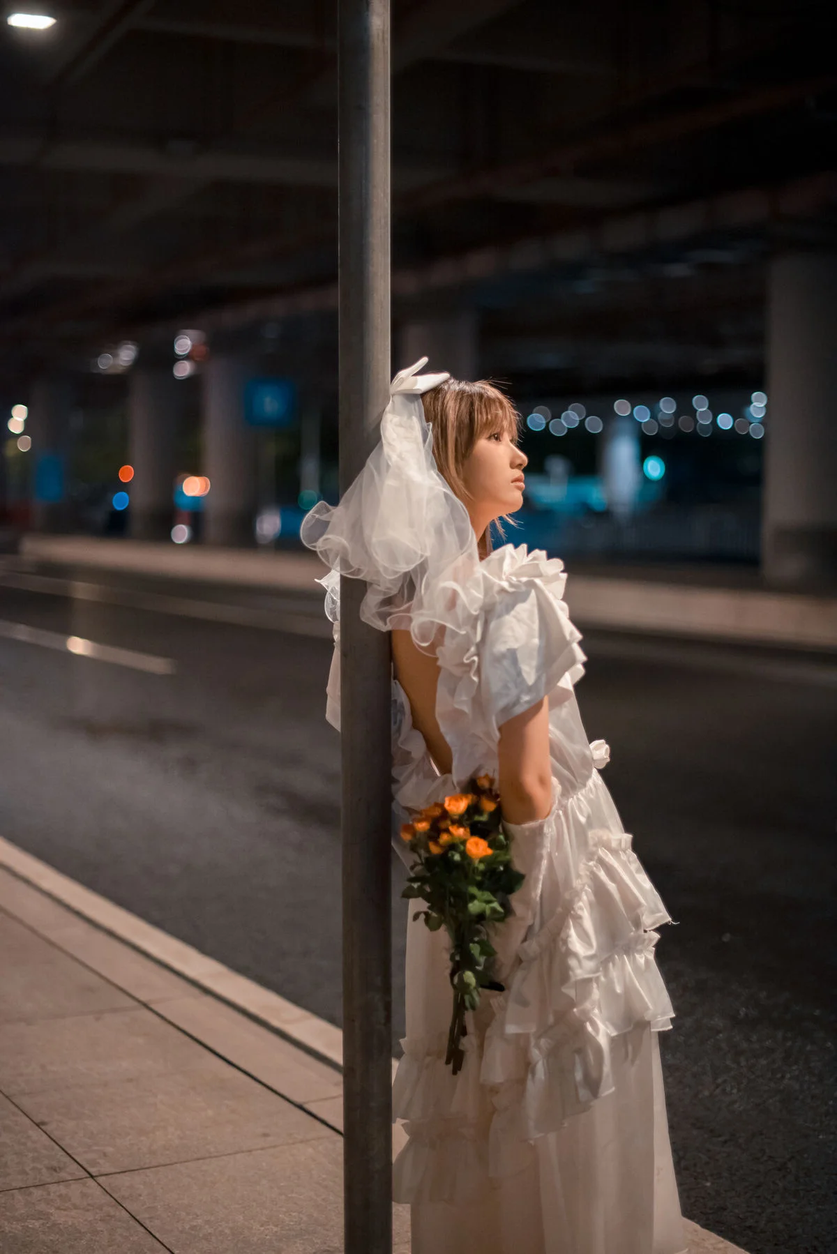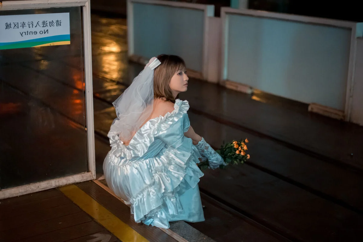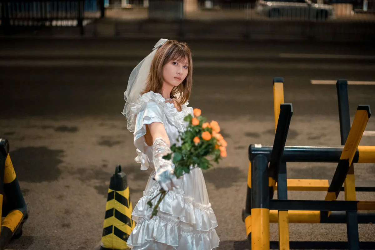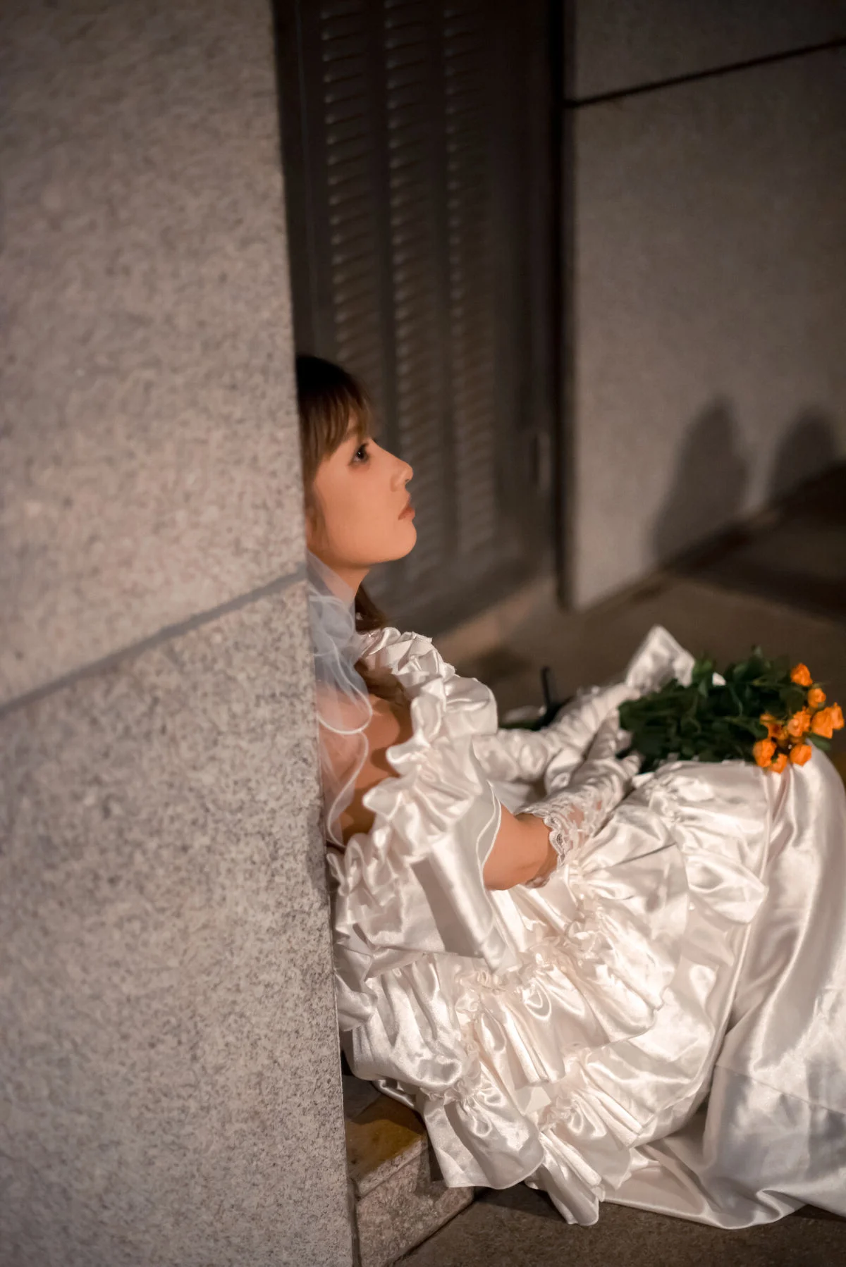 In the YiTuYu Vol.8790 collection, Pao Pao Xiao Mie appears with a thoughtful and nostalgic beauty. She sits quietly on the steps, adorned in a pristine white dress with soft ruffled layers, reminiscent of a lonely girl amidst the city. Her gaze is directed into the distance, holding an indescribable emotion, a quiet contemplation within the silent urban space. A small orange bouquet placed beside her acts as a delicate highlight, contrasting with the cold grey tones of the wall and stone steps. The photograph not only captures physical beauty but also touches the depth of the soul, evoking a sense of solitude that is both poignant and captivating. Pao Pao Xiao Mie seems lost in her own thoughts, creating a hauntingly serene and artistic moment.#PaoPaoXiaoMie #WhiteDress #AsianModel #YiTuYu #ArtisticPhotography