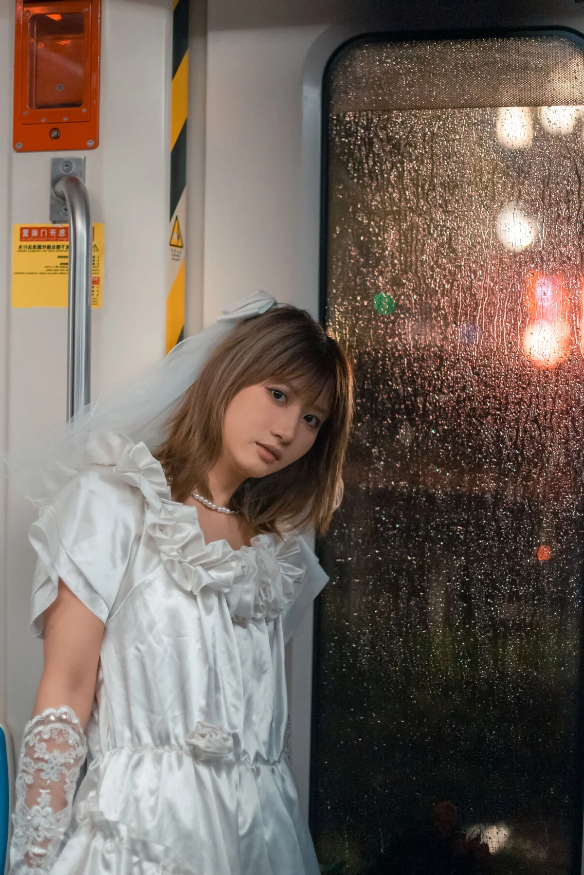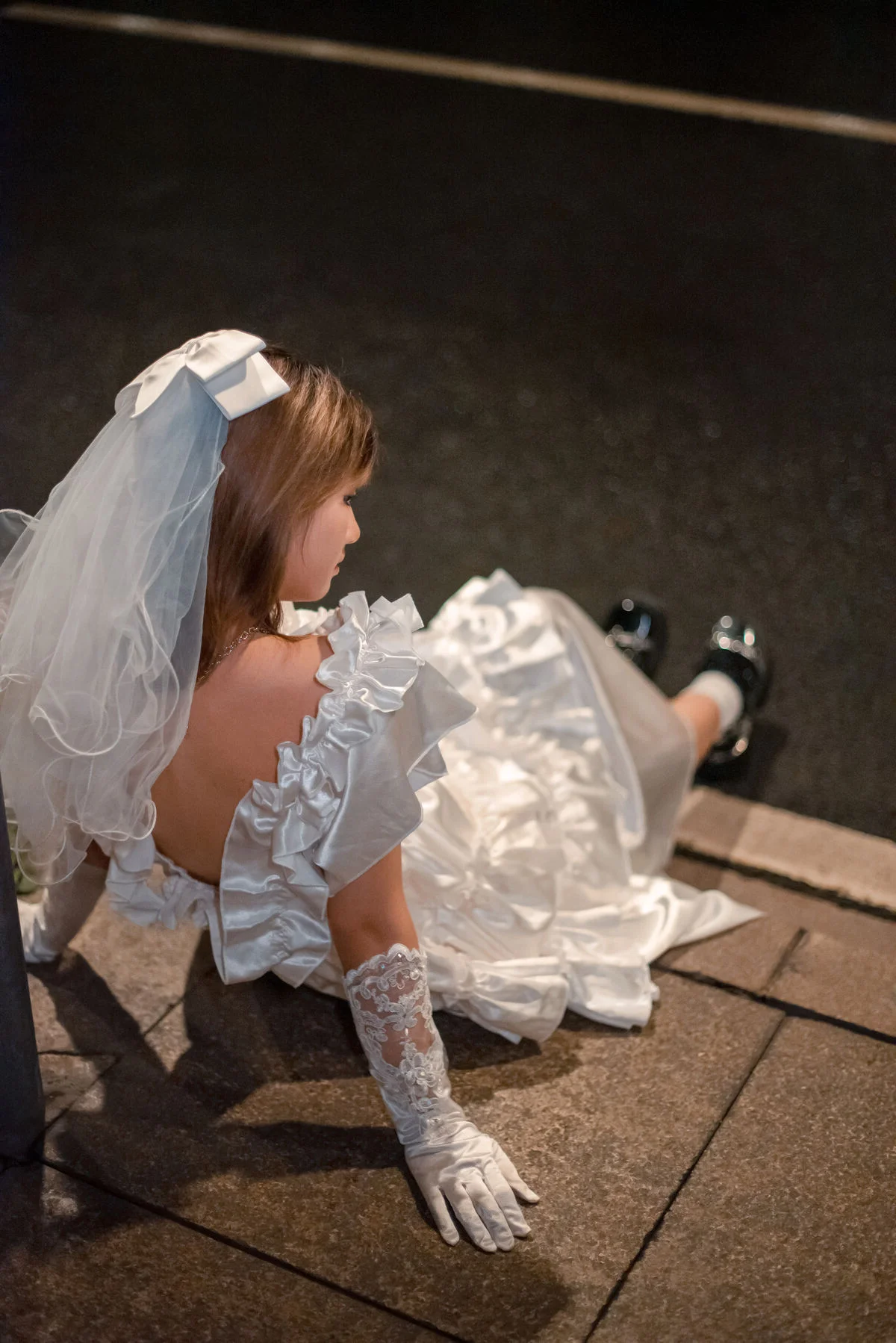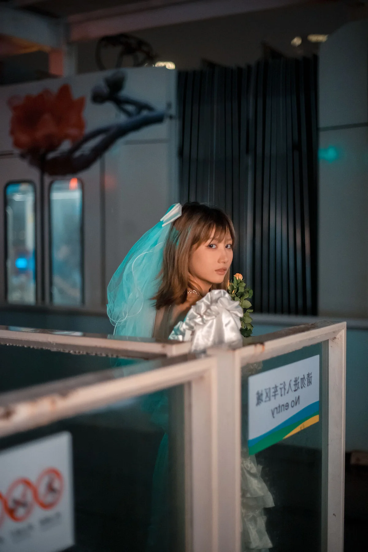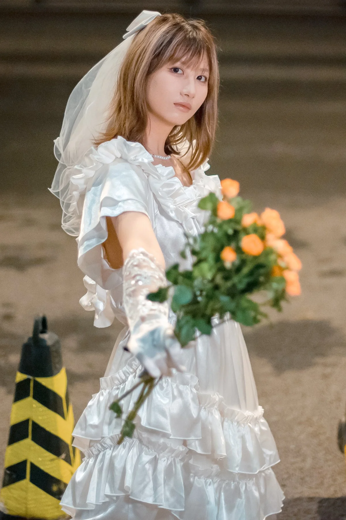In the YiTuYu Vol.8790 collection, Pao Pao Xiao Mie appears with a thoughtful and nostalgic beauty. She sits quietly on the steps, adorned in a pristine white dress with soft ruffled layers, reminiscent of a lonely girl amidst the city. Her gaze is directed into the distance, holding an indescribable emotion, a quiet contemplation within the silent urban space. A small orange bouquet placed beside her acts as a delicate highlight, contrasting with the cold grey tones of the wall and stone steps. The photograph not only captures physical beauty but also touches the depth of the soul, evoking a sense of solitude that is both poignant and captivating. Pao Pao Xiao Mie seems lost in her own thoughts, creating a hauntingly serene and artistic moment.#PaoPaoXiaoMie #WhiteDress #AsianModel #YiTuYu #ArtisticPhotography