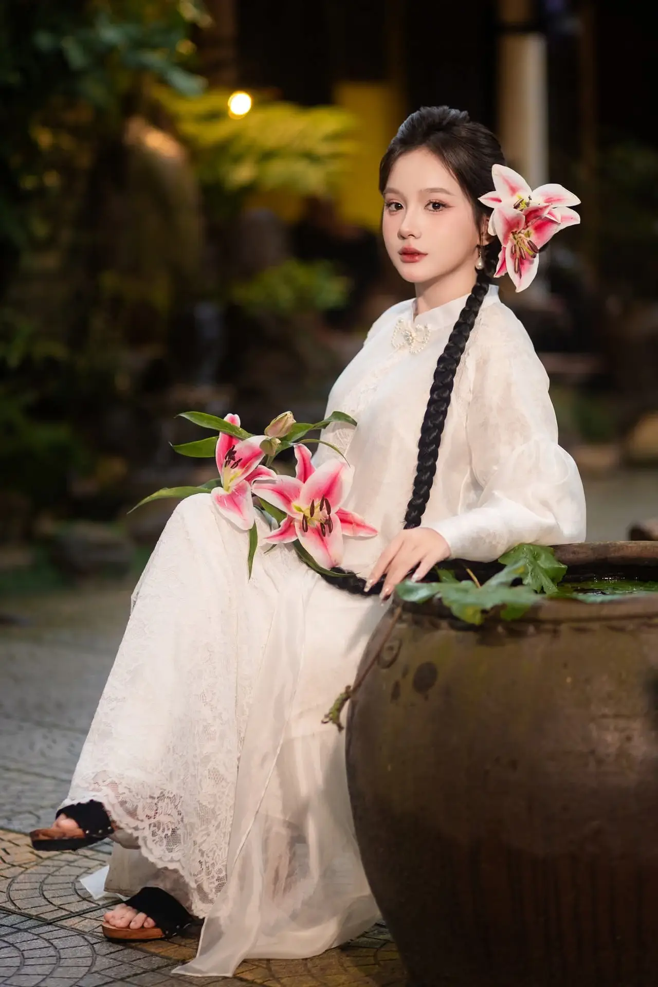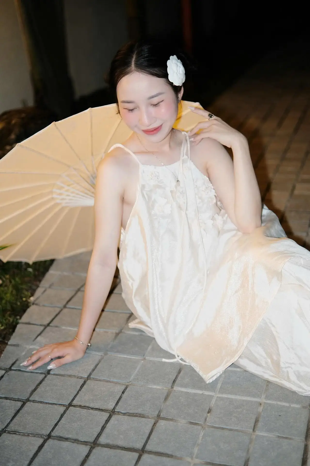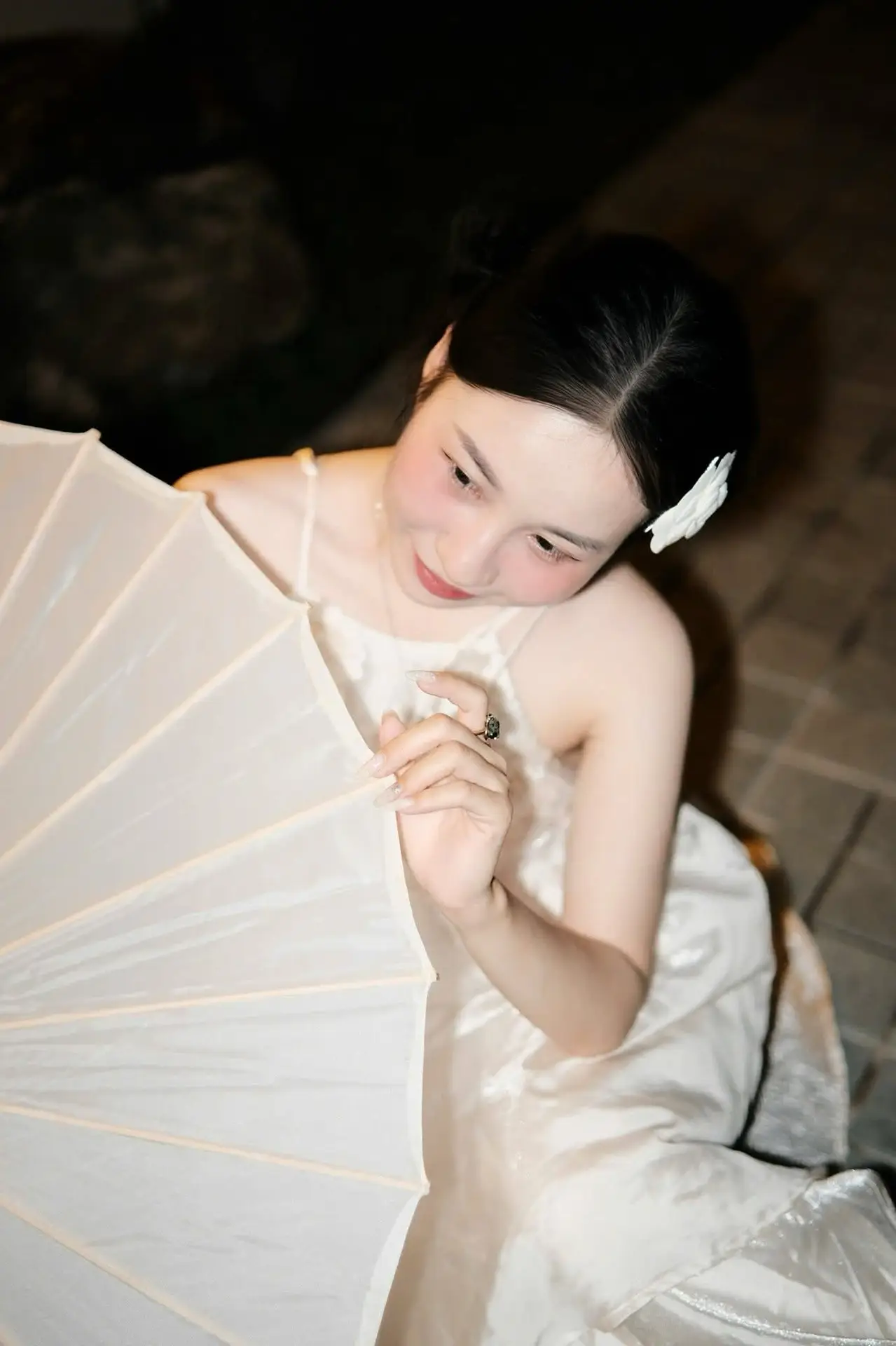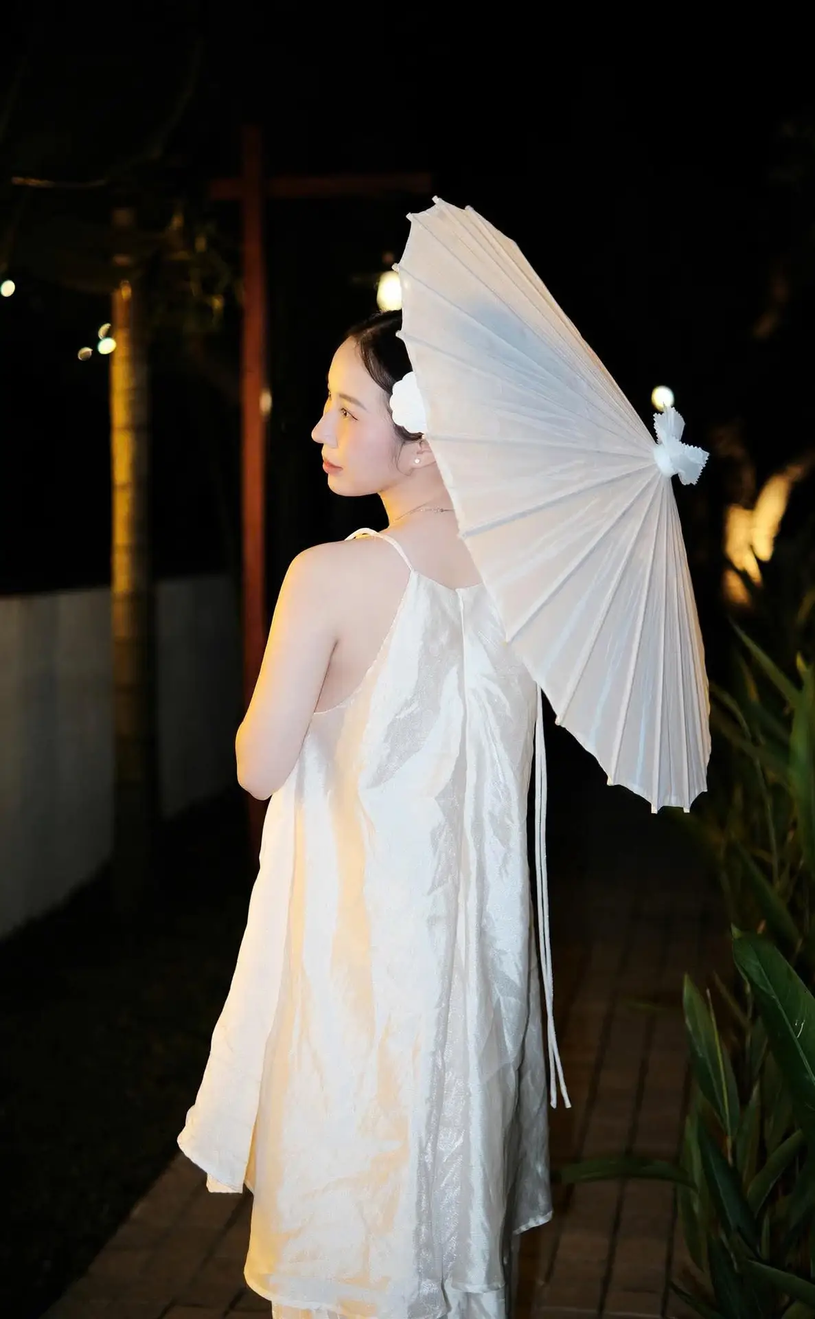 This captivating image captures a young woman in a pristine white dress highlighting her graceful and delicate beauty. The white paper umbrella she holds is not just an accessory but a refined focal point evoking a sense of traditional Asian charm. Under the soft glow of the night lights the scene becomes mysterious and romantic like a serene otherworldly painting. Every detail from the flower in her hair to her elegant posture exudes a gentle allure creating a breathtaking visual. It’s a perfect blend of modern elegance and classic aesthetic offering a wonderfully peaceful sensation.#WhiteDress #PaperUmbrella #AsianBeauty #NightFashion #OutdoorPhotography
