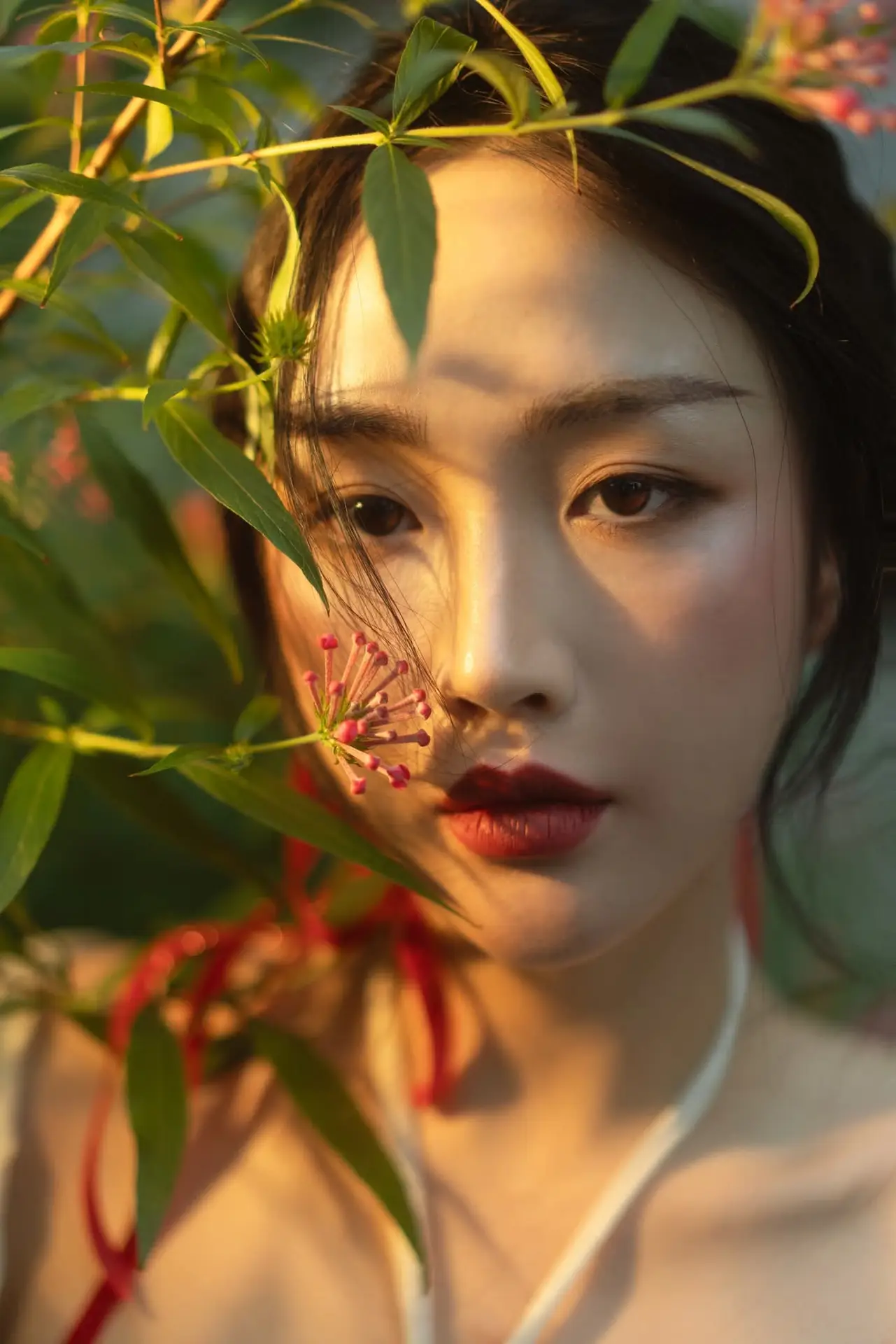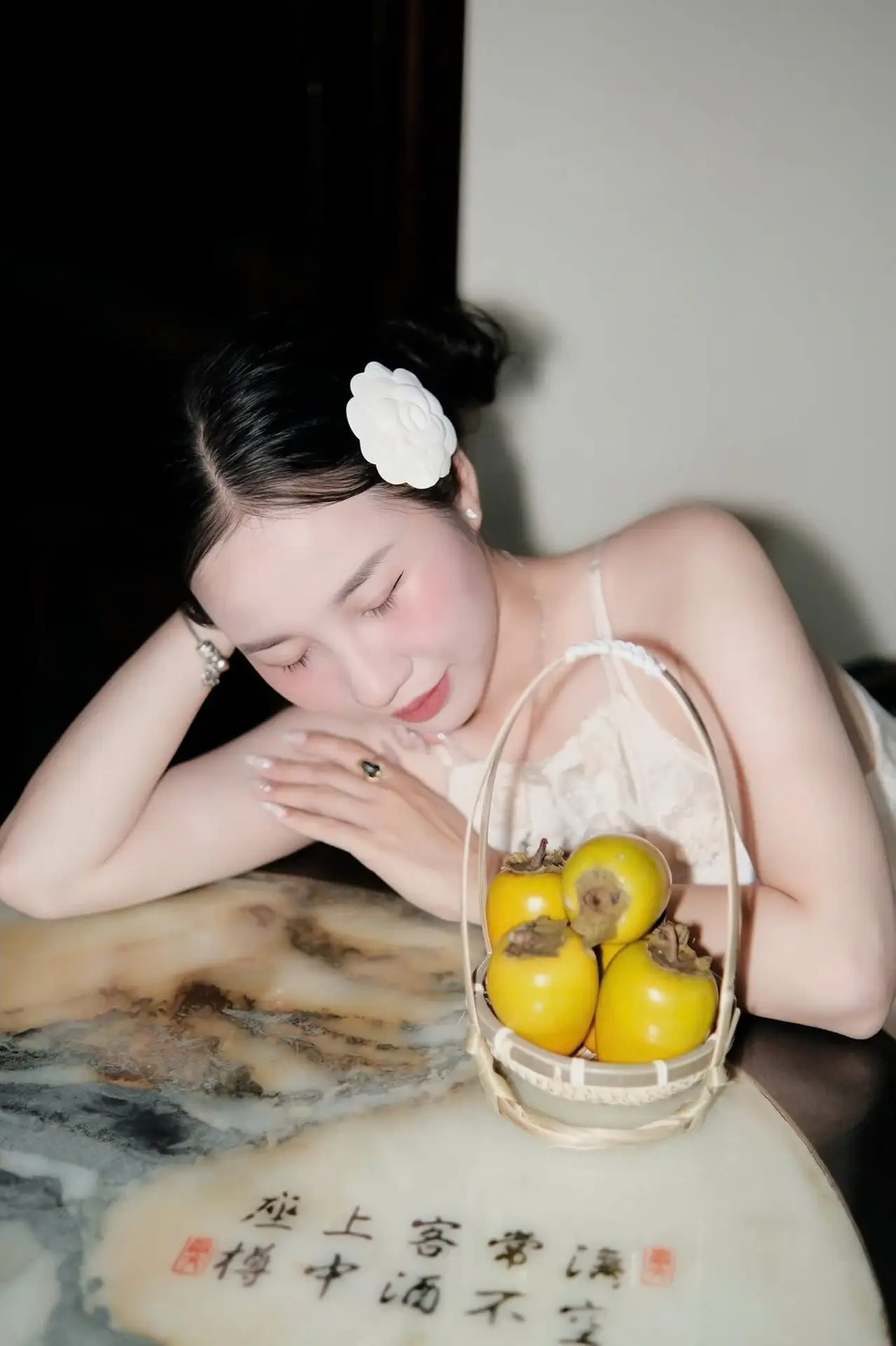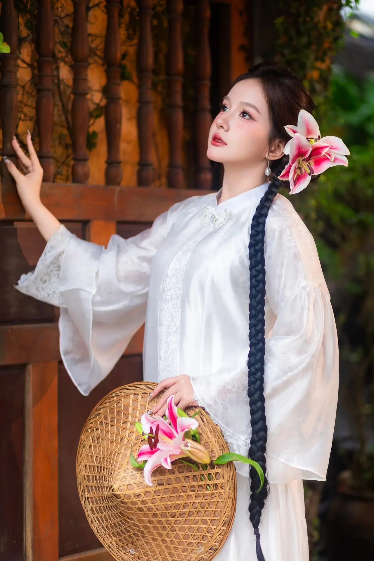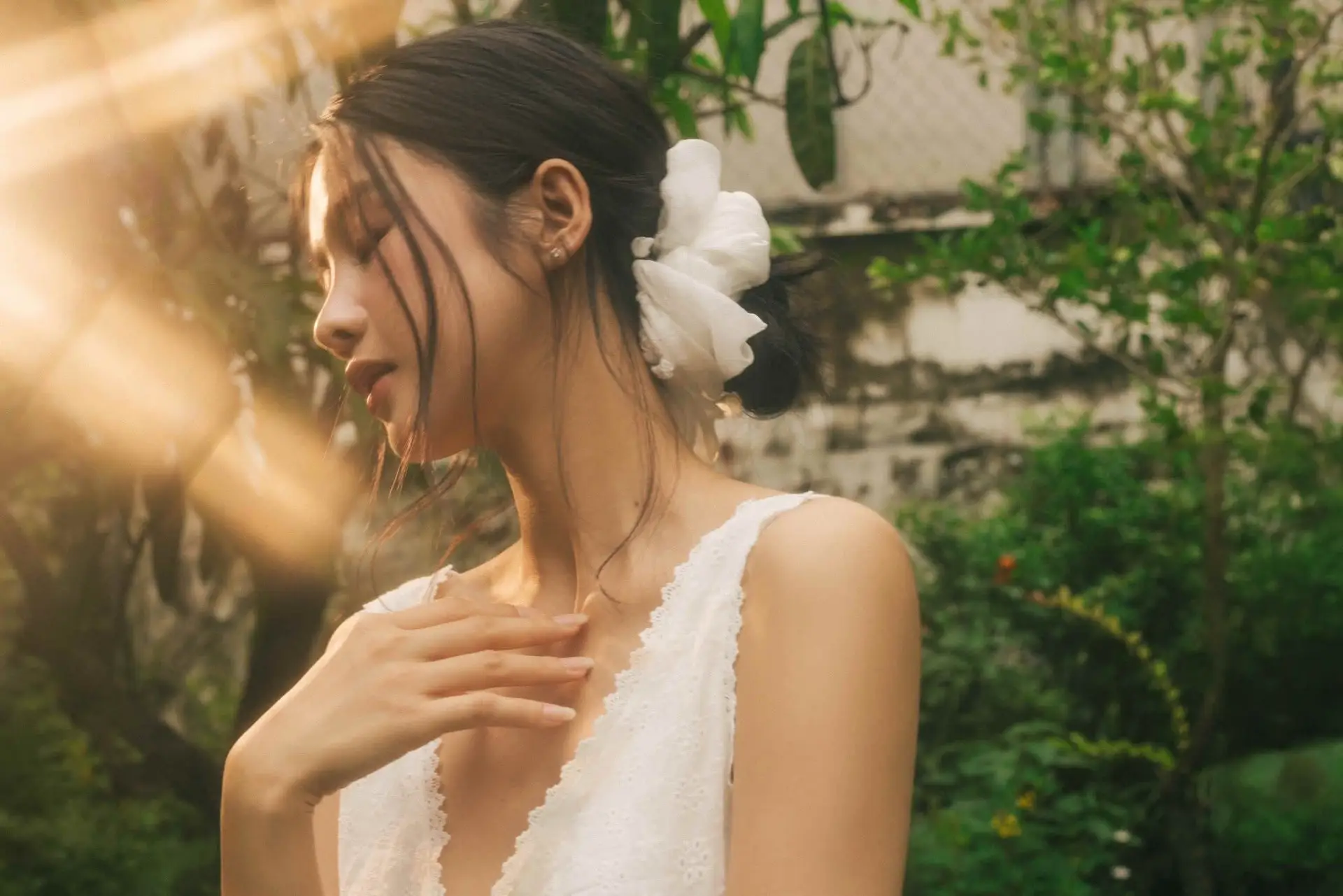 Captivating Asian Beauty: Discover the Ethereal Charm of a Maiden in White with a Blossom in Her Hair.