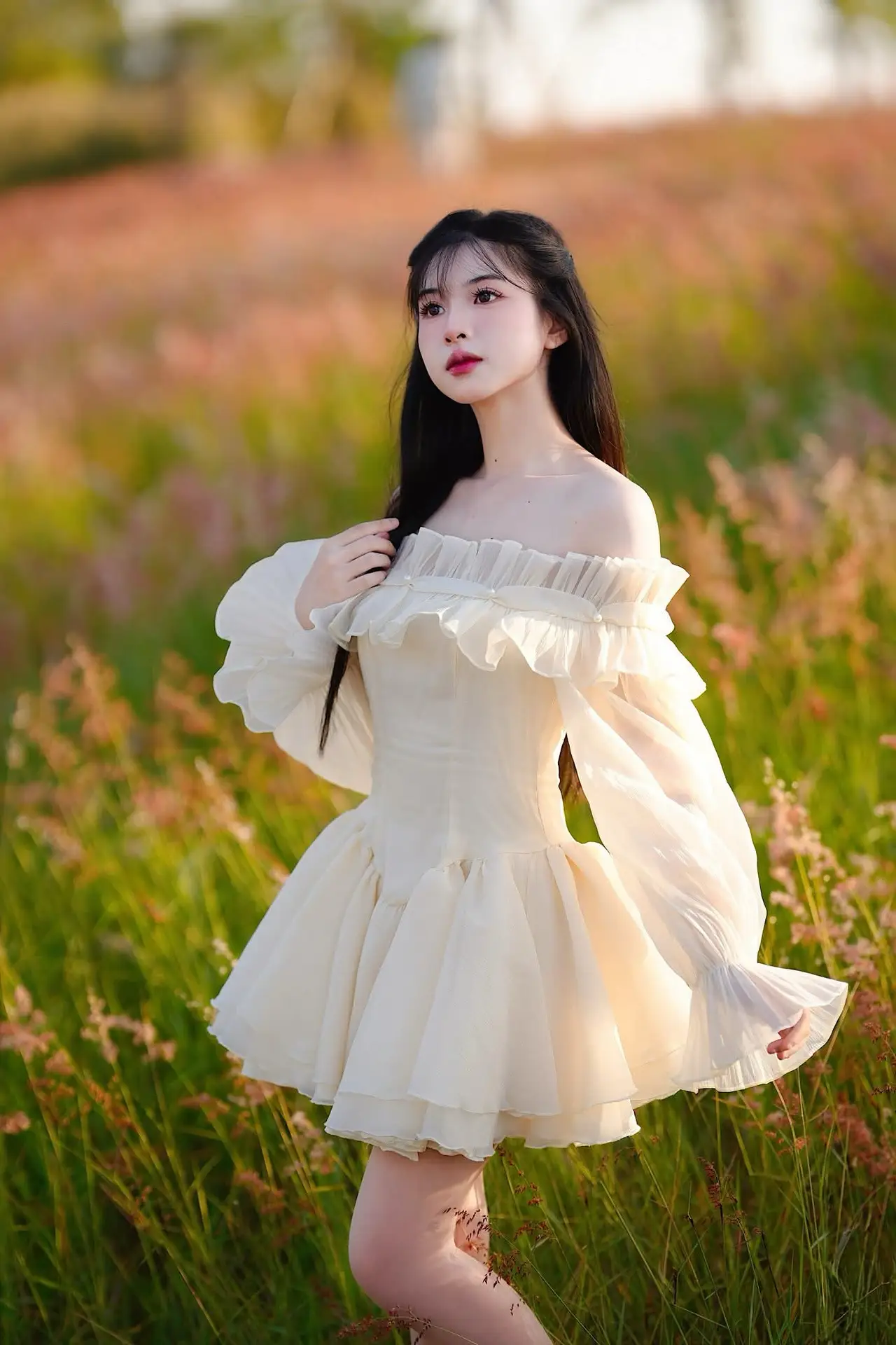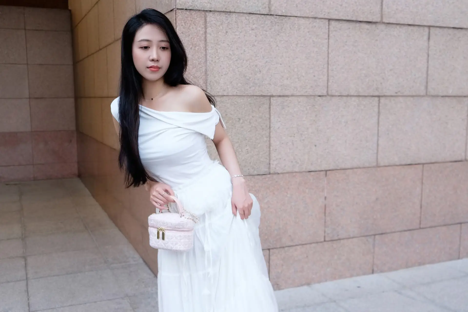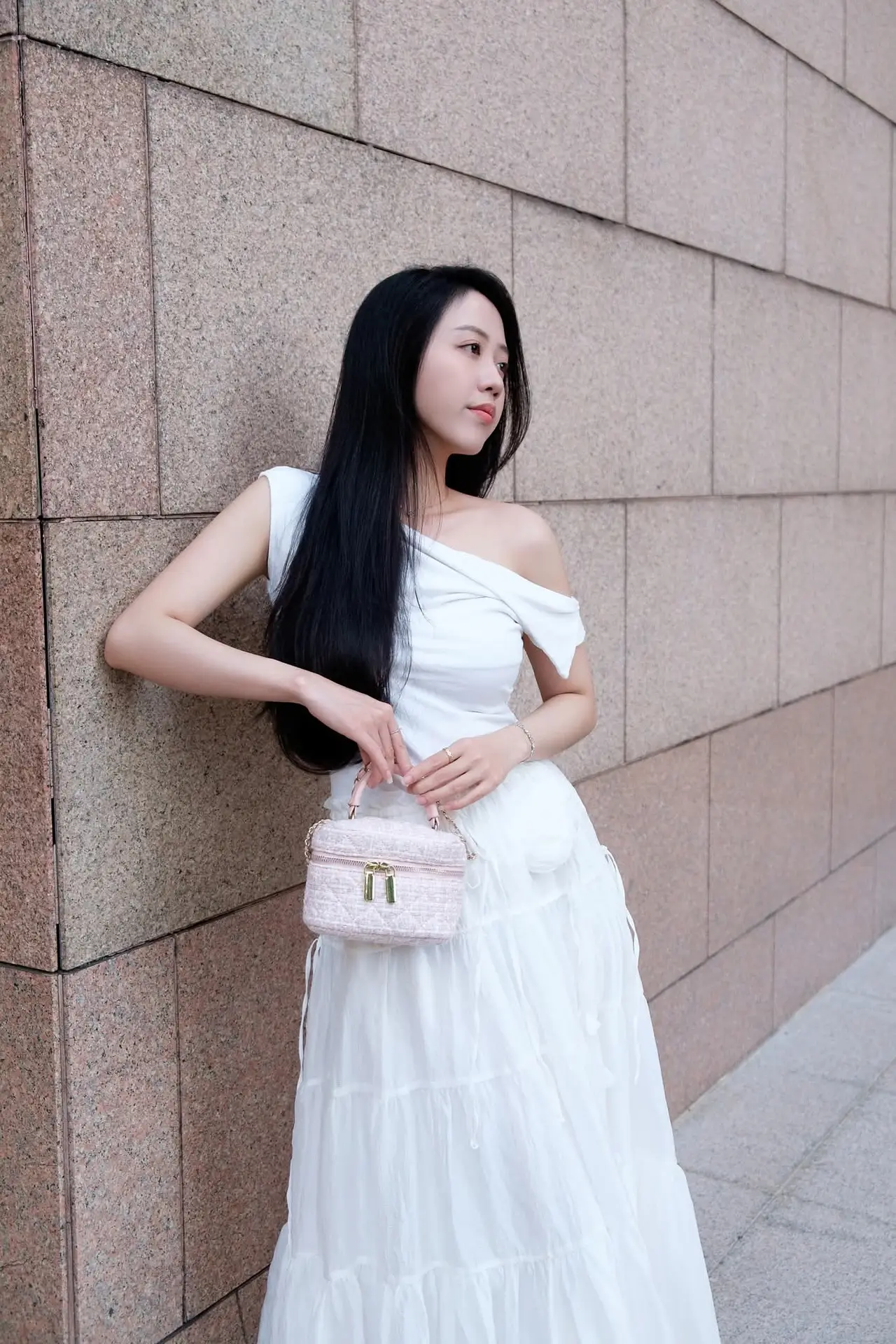 This captivating image features a young woman exuding effortless elegance and grace. She is adorned in a pristine white off-the-shoulder dress its delicate design beautifully highlighting her soft shoulders. The flowing long dress paired with a charming small light pink handbag creates a harmonious and feminine ensemble. With her long dark hair and gentle gaze she presents a look that is both modern and classic. This minimalist yet sophisticated fashion style not only accentuates her natural beauty but also showcases her refined taste. The photograph perfectly blends human charm with sartorial refinement capturing a truly memorable moment that speaks volumes about understated style.#WhiteDressFashion #ElegantStyle #AsianBeauty #OffShoulderDress #MinimalistFashion